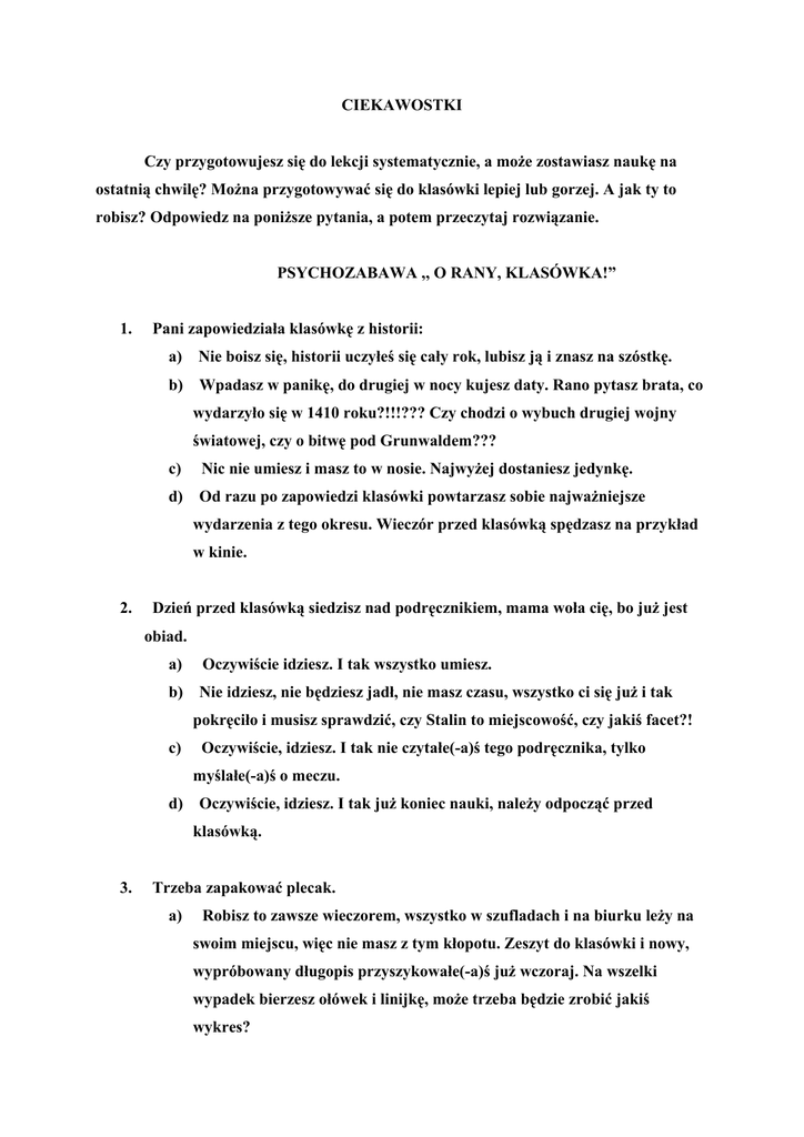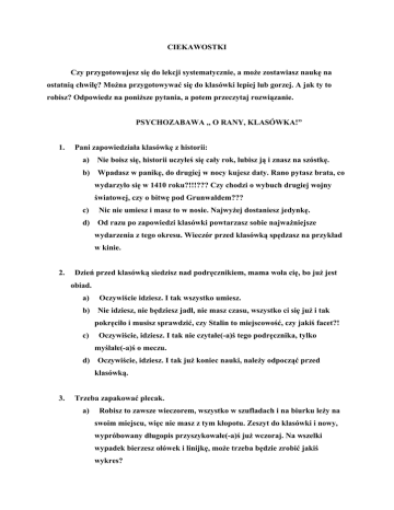 CIEKAWOSTKI Czy przygotowujesz się do lekcji systematycznie, a może zostawiasz naukę na ostatnią chwilę? Można przygotowywać się do klasówki lepiej lub gorzej. A jak ty to robisz? Odpowiedz na poniższe pytania, a potem przeczytaj rozwiązanie. PSYCHOZABAWA ,, O RANY, KLASÓWKA!” 1. Pani zapowiedziała klasówkę z historii: a) Nie boisz się, historii uczyłeś się cały rok, lubisz ją i znasz na szóstkę. b) Wpadasz w panikę, do drugiej w nocy kujesz daty. Rano pytasz brata, co wydarzyło się w 1410 roku?!!!??? Czy chodzi o wybuch drugiej wojny światowej, czy o bitwę pod Grunwaldem??? c) Nic nie umiesz i masz to w nosie. Najwyżej dostaniesz jedynkę. d) Od razu po zapowiedzi klasówki powtarzasz sobie najważniejsze wydarzenia z tego okresu. Wieczór przed klasówką spędzasz na przykład w kinie. 2. Dzień przed klasówką siedzisz nad podręcznikiem, mama woła cię, bo już jest obiad. a) Oczywiście idziesz. I tak wszystko umiesz. b) Nie idziesz, nie będziesz jadł, nie masz czasu, wszystko ci się już i tak pokręciło i musisz sprawdzić, czy Stalin to miejscowość, czy jakiś facet?! c) Oczywiście, idziesz. I tak nie czytałe(-a)ś tego podręcznika, tylko myślałe(-a)ś o meczu. d) Oczywiście, idziesz. I tak już koniec nauki, należy odpocząć przed klasówką. 3. Trzeba zapakować plecak. a) Robisz to zawsze wieczorem, wszystko w szufladach i na biurku leży na swoim miejscu, więc nie masz z tym kłopotu. Zeszyt do klasówki i nowy, wypróbowany długopis przyszykowałe(-a)ś już wczoraj. Na wszelki wypadek bierzesz ołówek i linijkę, może trzeba będzie zrobić jakiś wykres? b) Plecak pakujesz w ostatniej chwili, z rozpaczą szukasz zeszytu, zapominasz o długopisie, pakujesz trzy niepotrzebne tego dnia podręczniki, cały czas powtarzasz przy tym daty. Kiedy, na litość Boską, zaczęła się piąta wojna światowa???!! c) Bierzesz plecak bez pakowania. I tak zawsze nosisz wszystko, a jeśli czegoś nie ma, to Michał ci pożyczy. d) Plecak tym razem pakujesz wieczorem. Sprawdzasz, czy masz zeszyt do klasówek i dobry długopis. Rano zaglądasz tam jeszcze raz. 4. Idziesz do szkoły. a) Tak, jak zwykle, będziesz pół godziny wcześniej. Nie śpieszysz się, przed wyjściem zjadasz dobre śniadanie. b) Wychodzisz trochę wcześniej, mimo to pędzisz jak do pożaru. Klasówka jest na trzeciej lekcji, ale może ją przełożyli, zresztą chcesz pogadać jeszcze z Beatą, może ona wie, kto w czasie drugiej wojny światowej zwyciężył, Szwajcarzy czy Szwedzi?! c) Wychodzisz w ostatniej chwili, a nawet parę minut potem. Najwyżej się spóźnisz, wielkie rzeczy. d) Wychodzisz trochę wcześniej, chcesz jeszcze porozmawiać z Beatą, która wszystko wie. Może ci powie, ile czasu trwało oblężenie Stalingradu? 5. Już piszesz klasówkę! a) Jak było do przewidzenia, jest to bułka z masłem. Szóstka murowana, wcale się nie denerwujesz. b) O, rany, co za okropny temat! Coś tam wiesz, ale o wiele za mało. Usiłujesz ściągać od kolegi, niestety on też siedzi nad pustą kartką. Płakać ci się chce, ale piszesz, co wiesz, może chociaż będzie z tego trója z dwoma? c) Strasznie nudny temat. Co to kogo obchodzi? Ale kiedyś widziałeś taki film, opiszesz go, może jakoś przejdzie? A jak nie, to nie, jedna jedynka więcej, czy mniej ... d) Fajny temat. Okazuje się, że wiesz więcej, niż myślałeś. Może dostaniesz piątkę? ROZWIĄZANIE: Jeśli podkreślisz większość odpowiedzi A- jesteś takim ideałem, że aż trudno w to uwierzyć! Podkreśliłeś odpowiedzi B – nie zostawiaj nauki na ostatnią chwilę. Czytaj coś, może chociaż gazety! Porozmawiaj z rodzicami, może ci pomogą, bo jesteś okropnie nerwowy (a). To nie twoja wina, ale warto coś z tym zrobić. Może się za bardzo przejmujesz? Postaraj się uczyć regularnie i nie zarywaj nocy przed egzaminami. Na pewno możesz dać sobie radę! Podkreśliłeś odpowiedzi C – nie wierzymy, żeby wszystko było ci tak obojętne. Może masz jakieś zmartwienie? Chyba wiesz, czy lubisz szkołę, czy nie. Trzeba ją skończyć, a jeśli zostaniesz na drugi rok, to będziesz chodził do niej o rok dłużej. Zakreśliłeś odpowiedzi D – i dobrze. Tak trzymać!