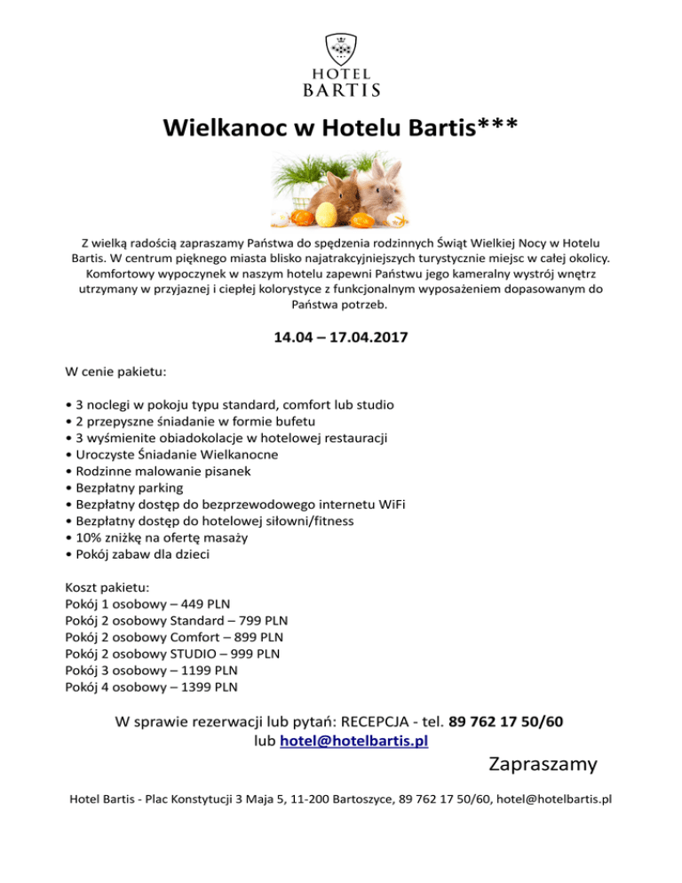 Wielkanoc w Hotelu Bartis*** Z wielką radością zapraszamy Państwa do spędzenia rodzinnych Świąt Wielkiej Nocy w Hotelu Bartis. W centrum pięknego miasta blisko najatrakcyjniejszych turystycznie miejsc w całej okolicy. Komfortowy wypoczynek w naszym hotelu zapewni Państwu jego kameralny wystrój wnętrz utrzymany w przyjaznej i ciepłej kolorystyce z funkcjonalnym wyposażeniem dopasowanym do Państwa potrzeb. 14.04 – 17.04.2017 W cenie pakietu: • 3 noclegi w pokoju typu standard, comfort lub studio • 2 przepyszne śniadanie w formie bufetu • 3 wyśmienite obiadokolacje w hotelowej restauracji • Uroczyste Śniadanie Wielkanocne • Rodzinne malowanie pisanek • Bezpłatny parking • Bezpłatny dostęp do bezprzewodowego internetu WiFi • Bezpłatny dostęp do hotelowej siłowni/fitness • 10% zniżkę na ofertę masaży • Pokój zabaw dla dzieci Koszt pakietu: Pokój 1 osobowy – 449 PLN Pokój 2 osobowy Standard – 799 PLN Pokój 2 osobowy Comfort – 899 PLN Pokój 2 osobowy STUDIO – 999 PLN Pokój 3 osobowy – 1199 PLN Pokój 4 osobowy – 1399 PLN W sprawie rezerwacji lub pytań: RECEPCJA - tel. 89 762 17 50/60 lub [email protected] Zapraszamy Hotel Bartis - Plac Konstytucji 3 Maja 5, 11-200 Bartoszyce, 89 762 17 50/60, [email protected]