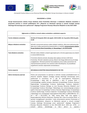 „Europejski Fundusz Rolny na rzecz Rozwoju Obszarów Wiejskich: Europa Inwestująca w obszary wiejskie” OGŁOSZENIE nr 2/2016 Zarząd Stowarzyszenia Lokalna Grupa Działania Ziemi Kraśnickiej informuje o możliwości składania wniosków o przyznanie pomocy w ramach poddziałania 19.2 „Wsparcie na wdrażanie operacji w ramach strategii rozwoju lokalnego kierowanego przez społeczność” objętego Programem Rozwoju Obszarów Wiejskich na lata 2014-2020 Ogłoszenie nr 2/2016 w ramach naboru wniosków o udzielenie wsparcia Termin składania wniosków Od dnia 22 listopada 2016 roku (godz. 8.00-16.00) do 12 grudnia 2016 do godz. 16.00 Miejsce składania wniosków Wnioski o przyznanie pomocy należy składać osobiście, albo przez pełnomocnika albo przez osobę upoważnioną bezpośrednio w siedzibie stowarzyszenia Lokalna Grupa Działania Ziemi Kraśnickiej, ul. Słowackiego 7, 23-210 Kraśnik. Tryb składania wniosków Wnioski należy składać w dwóch egzemplarzach w formie papierowej oraz dwóch w wersji elektronicznej. O terminie złożenia wniosku decyduje data wpływu do biura LGD Ziemi Kraśnickiej. Wnioski nadsyłane pocztą, faksem lub drogą elektroniczną nie będą uwzględniane. Wniosek powinien być podpisany przez osoby uprawnione do reprezentowania pomiotu oraz zawierać adres beneficjenta. Za prawidłowe wypełnienie wniosku odpowiada wnioskodawca. Forma wsparcia REFUNDACJA KOSZTÓW KWALIFIKOWANYCH DO 70% Zakres tematyczny operacji Pomoc jest przyznawana na operacje w zakresie rozwoju przedsiębiorczości na obszarze wiejskim objętym strategią rozwoju lokalnego kierowanego przez społeczność w rozumieniu art. 2 pkt 19 rozporządzenia Parlamentu Europejskiego i Rady (UE) nr 1303/2013 z dnia 17 grudnia 2013 r. ustanawiającego wspólne przepisy dotyczące Europejskiego Funduszu Rozwoju Regionalnego, Europejskiego Funduszu Społecznego, Funduszu Spójności, Europejskiego Funduszu Rolnego na rzecz Rozwoju Obszarów Wiejskich oraz Europejskiego Funduszu Morskiego i Rybackiego oraz ustanawiającego przepisy ogólne dotyczące Europejskiego Funduszu Rozwoju Regionalnego, Europejskiego Funduszu Społecznego, Funduszu Spójności i Europejskiego Funduszu Morskiego i Rybackiego oraz uchylającego rozporządzenie Rady (WE) nr 1083/2006 (Dz. Urz. UE L 347 z 20.12.2013, str. 320), zwaną dalej "LSR" oraz zgodny z Rozporządzeniem Ministra Rolnictwa i Rozwoju Wsi z dnia 24 września 2015r. w sprawie szczegółowych warunków i trybu przyznawania pomocy finansowej w ramach poddziałania „Wsparcie na Wdrażanie operacji w ramach strategii rozwoju lokalnego kierowanego przez społeczność” objętego Programem Rozwoju Obszarów Wiejskich na lata 2014-2020 (Dz.U. 2015 poz. 1570) , w ramach zakresu określonego w &2.1 pkt.2c tj. poprzez: 1 „Europejski Fundusz Rolny na rzecz Rozwoju Obszarów Wiejskich: Europa Inwestująca w obszary wiejskie” Rozwijanie działalności gospodarczej; Cel ten realizuje LSR dla LGD Ziemi Kraśnickiej na lata 2014-2020 w szczególności: Cel ogólny: Ograniczenie negatywnego zjawiska migracji z terenu LGD Cel szczegółowy: Poprawa warunków na lokalnym rynku pracy poprzez wspieranie lokalnej przedsiębiorczości i podnoszenie kompetencji mieszkańców Przedsięwzięcie 1.2 Poprawa warunków terenie ziemi kraśnickiej do rozwoju przedsiębiorczości na Wskaźnik realizujący w/w cel: -Liczba operacji polegających na rozwoju istniejącego przedsiębiorstwa -Liczba rozwiązań lub technologii związanych z ochroną środowiska lub ochroną klimatu zastosowana w ramach dotacji dofinansowanych -Liczba utworzonych miejsc pracy Warunki udzielania wsparcia Podstawowymi warunkami udzielenia wsparcia są: -Złożenie kompletu wymaganej dokumentacji w miejscu i terminie podanym w ogłoszeniu -Zgodność operacji z zakresem tematycznym podanym w ogłoszeniu -zgodność operacji z warunkami przyznania pomocy określonymi w PROW na lata 2014-2020 -zgodność operacji z Lokalną Strategią Rozwoju LGD Ziemi Kraśnickiej na lata 2014-2020 -zgodność operacji z lokalnymi kryteriami wyboru operacji oraz uzyskanie minimalnej liczby punktów Kryteria wyboru operacji wraz ze wskazaniem minimalnej liczby punktów, której uzyskanie jest warunkiem wyboru operacji Warunkiem przyjęcia operacji za zgodnej z kryteriami wyboru jest uzyskanie minimalnie 60% maksymalnej liczby punktów. Kryteria wyboru operacji znajdują się na stronie www.lgdkrasnik.pl. Jeżeli kilka wniosków zdobędzie taką samą ilość punktów, pierwszeństwo na liście rankingowej będzie miał wniosek, który uzyskał większą liczbę punktów w ocenie, kolejno: -Kryterium wyboru; Priorytetowe grupy docelowe beneficjentów -Kryterium załączników wyboru: Kompletność wniosku w zakresie obowiązkowych -Kryterium wyboru : Czas realizacji krótszy niż 12 m-cy od dnia podpisania 2 „Europejski Fundusz Rolny na rzecz Rozwoju Obszarów Wiejskich: Europa Inwestująca w obszary wiejskie” umowy W sytuacji gdy wnioski o dofinansowanie zdobędą taką samą liczbę punktów oraz w poszczególnych kryteriach będą posiadały tyle samo punktów kolejność na liście rankingowej zostanie ustalona w drodze losowania dokonanego przez Przewodniczącego Rady podczas posiedzenia dotyczącego oceny wniosków. Wymagane dokumenty potwierdzające spełnienie warunków udzielenia wsparcia oraz kryteriów wyboru operacji -Wniosek o przyznanie pomocy wraz z kompletem załączników Limit dostępnych środków w ramach ogłaszanego naboru Limit dostępnych środków w ramach naboru wynosi 1 775 000,00 zł Informacje o miejscu udostępnienia LSR, formularza wniosku o udzielenie wsparcia, formularza wniosku o płatność oraz formularza umowy o udzielenie wsparcia Formularze wymaganych dokumentów w ramach naboru, formularz wniosku o płatność, umowę o udzielenie wsparcia, Lokalną Strategię Rozwoju LGD Ziemi Kraśnickiej, Regulamin Rady udostępniono na stronie www.lgdkrasnik.pl -Dokumenty niezbędne do p