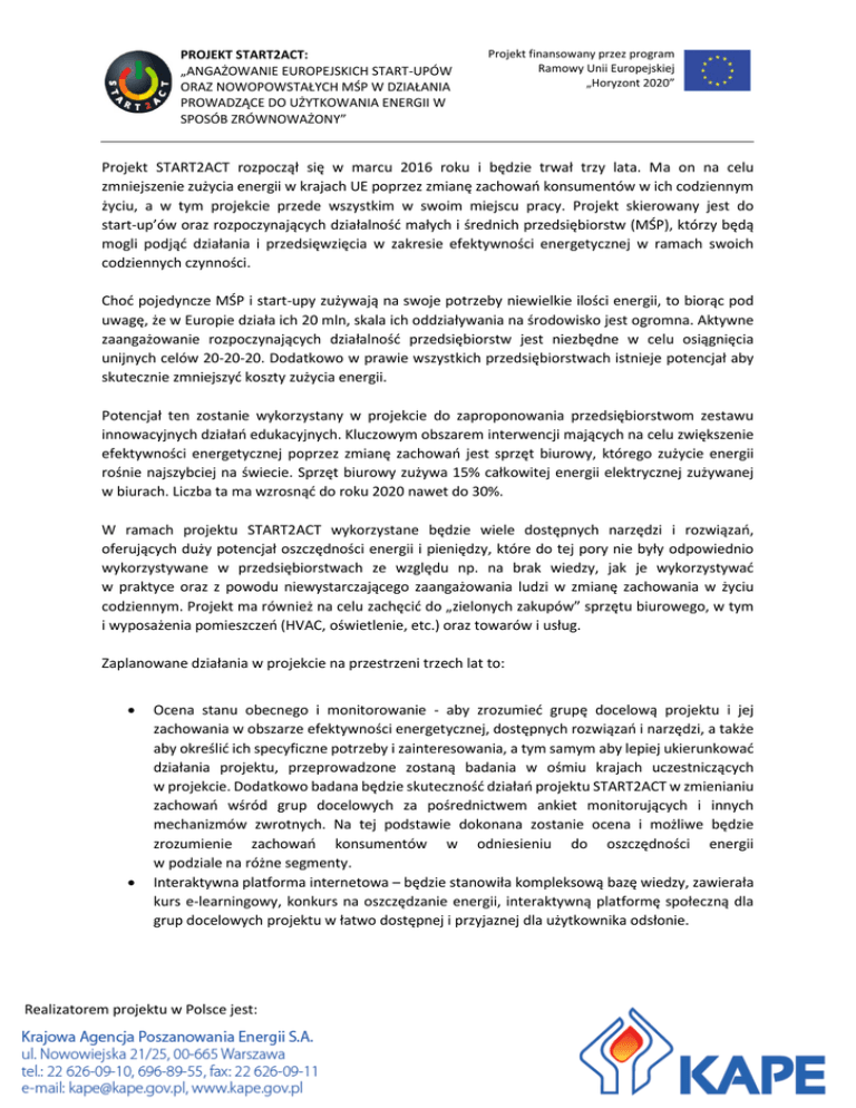 PROJEKT START2ACT: „ANGAŻOWANIE EUROPEJSKICH START-UPÓW ORAZ NOWOPOWSTAŁYCH MŚP W DZIAŁANIA PROWADZĄCE DO UŻYTKOWANIA ENERGII W SPOSÓB ZRÓWNOWAŻONY” Projekt finansowany przez program Ramowy Unii Europejskiej „Horyzont 2020” Projekt START2ACT rozpoczął się w marcu 2016 roku i będzie trwał trzy lata. Ma on na celu zmniejszenie zużycia energii w krajach UE poprzez zmianę zachowań konsumentów w ich codziennym życiu, a w tym projekcie przede wszystkim w swoim miejscu pracy. Projekt skierowany jest do start-up’ów oraz rozpoczynających działalność małych i średnich przedsiębiorstw (MŚP), którzy będą mogli podjąć działania i przedsięwzięcia w zakresie efektywności energetycznej w ramach swoich codziennych czynności. Choć pojedyncze MŚP i start-upy zużywają na swoje potrzeby niewielkie ilości energii, to biorąc pod uwagę, że w Europie działa ich 20 mln, skala ich oddziaływania na środowisko jest ogromna. Aktywne zaangażowanie rozpoczynających działalność przedsiębiorstw jest niezbędne w celu osiągnięcia unijnych celów 20-20-20. Dodatkowo w prawie wszystkich przedsiębiorstwach istnieje potencjał aby skutecznie zmniejszyć koszty zużycia energii. Potencjał ten zostanie wykorzystany w projekcie do zaproponowania przedsiębiorstwom zestawu innowacyjnych działań edukacyjnych. Kluczowym obszarem interwencji mających na celu zwiększenie efektywności energetycznej poprzez zmianę zachowań jest sprzęt biurowy, którego zużycie energii rośnie najszybciej na świecie. Sprzęt biurowy zużywa 15% całkowitej energii elektrycznej zużywanej w biurach. Liczba ta ma wzrosnąć do roku 2020 nawet do 30%. W ramach projektu START2ACT wykorzystane będzie wiele dostępnych narzędzi i rozwiązań, oferujących duży potencjał oszczędności energii i pieniędzy, które do tej pory nie były odpowiednio wykorzystywane w przedsiębiorstwach ze względu np. na brak wiedzy, jak je wykorzystywać w praktyce oraz z powodu niewystarczającego zaangażowania ludzi w zmianę zachowania w życiu codziennym. Projekt ma również na celu zachęcić do „zielonych zakupów” sprzętu biurowego, w tym i wyposażenia pomieszczeń (HVAC, oświetlenie, etc.) oraz towarów i usług. Zaplanowane działania w projekcie na przestrzeni trzech lat to: Ocena stanu obecnego i monitorowanie - aby zrozumieć grupę docelową projektu i jej zachowania w obszarze efektywności energetycznej, dostępnych rozwiązań i narzędzi, a także aby określić ich specyficzne potrzeby i zainteresowania, a tym samym aby lepiej ukierunkować działania projektu, przeprowadzone zostaną badania w ośmiu krajach uczestniczących w projekcie. Dodatkowo badana będzie skuteczność działań projektu START2ACT w zmienianiu zachowań wśród grup docelowych za pośrednictwem ankiet monitorujących i innych mechanizmów zwrotnych. Na tej podstawie dokonana zostanie ocena i możliwe będzie zrozumienie zachowań konsumentów w odniesieniu do oszczędności energii w podziale na różne segmenty. Interaktywna platforma internetowa – będzie stanowiła kompleksową bazę wiedzy, zawierała kurs e-learningowy, konkurs na oszczędzanie energii, interaktywną platformę społeczną dla grup docelowych projektu w łatwo dostępnej i przyjaznej dla użytkownika odsłonie. Realizatorem projektu w Polsce jest: PROJEKT START2ACT: „ANGAŻOWANIE EUROPEJSKICH START-UPÓW ORAZ NOWOPOWSTAŁYCH MŚP W DZIAŁANIA PROWADZĄCE DO UŻYTKOWANIA ENERGII W SPOSÓB ZRÓWNOWAŻONY” Projekt finansowany przez program Ramowy Unii Europejskiej „Horyzont 2020” szkolenia dla małych i średnich przedsiębiorstw – będą obejmowały szkolenie na miejscu dla firm, e-learning i organizację warsztatów w formie śniadań biznesowych w zakresie efektywności energetycznej. W ramach projektu powstaną „Zestaw szkoleniowy" zawierający materiały i wskazówki dla przedsiębiorstw. działania dla start-upów – będą polegały na budowaniu zdolności i umiejętności innowacyjnych. Podejście to tej specyficznej grupy docelowej wymaga innego podejścia niż w przypadku małych i średnich przedsiębiorstw. Zaproponowany zostanie program mentoringu dostosowany specjalnie dla początkujących przedsiębiorców, który będzie skupiał się na tworzeniu podstaw przyszłego funkcjonowania firmy zgodnie z zasadami efektywności energetycznej i zrównoważonego rozwoju. Celem takich działań jest umożliwienie początkującym przedsiębiorcom opanowania umiejętności świadomego stosowania zasad poszanowania i zarządzania energią, jakie należy stosować rozwijając swoje innowacyjne pomysły, a także aby przygotować ich do wyzwań i strategii biznesowych w dłuższej perspektywie. Również jak w przypadku MŚP, opracowany zostanie specjalny „Zestaw szkoleniowy”. Kontakt w KAPE Imię i nazwisko: Karolina Loth-Babut, Marta Szymczak Adres e-mail: [email protected], [email protected] Realizatorem projektu w Polsce jest:
