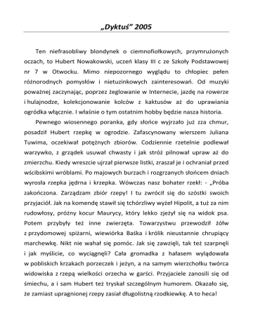 „Dyktuś” 2005 Ten niefrasobliwy blondynek o ciemnofiołkowych, przymrużonych oczach, to Hubert Nowakowski, uczeń klasy III c ze Szkoły Podstawowej nr 7 w Otwocku. Mimo niepozornego wyglądu to chłopiec pełen różnorodnych pomysłów i nietuzinkowych zainteresowań. Od muzyki poważnej zaczynając, poprzez żeglowanie w Internecie, jazdę na rowerze i hulajnodze, kolekcjonowanie kolców z kaktusów aż do uprawiania ogródka włącznie. I właśnie o tym ostatnim hobby będzie nasza historia. Pewnego wiosennego poranka, gdy słońce wyjrzało już zza chmur, posadził Hubert rzepkę w ogrodzie. Zafascynowany wierszem Juliana Tuwima, oczekiwał potężnych zbiorów. Codziennie rzetelnie podlewał warzywko, z grządek usuwał chwasty i jak stróż pilnował upraw aż do zmierzchu. Kiedy wreszcie ujrzał pierwsze listki, zraszał je i ochraniał przed wścibskimi wróblami. Po majowych burzach i rozgrzanych słońcem dniach wyrosła rzepka jędrna i krzepka. Wówczas nasz bohater rzekł: - „Próba zakończona. Zarządzam zbiór rzepy! I tu zwrócił się do szóstki swoich przyjaciół. Jak na komendę stawił się tchórzliwy wyżeł Hipolit, a tuż za nim rudowłosy, próżny kocur Maurycy, który lekko zjeżył się na widok psa. Potem przybyły też inne zwierzęta. Towarzystwu przewodził żółw z przydomowej spiżarni, wiewiórka Baśka i królik nieustannie chrupiący marchewkę. Nikt nie wahał się pomóc. Jak się zawzięli, tak też szarpnęli i jak myślicie, co wyciągnęli? Cała gromadka z hałasem wylądowała w pobliskich krzakach porzeczek i jeżyn, a na samym wierzchołku twórca widowiska z rzepą wielkości orzecha w garści. Przyjaciele zanosili się od śmiechu, a i sam Hubert też tryskał szczególnym humorem. Okazało się, że zamiast upragnionej rzepy zasiał długolistną rzodkiewkę. A to heca!
