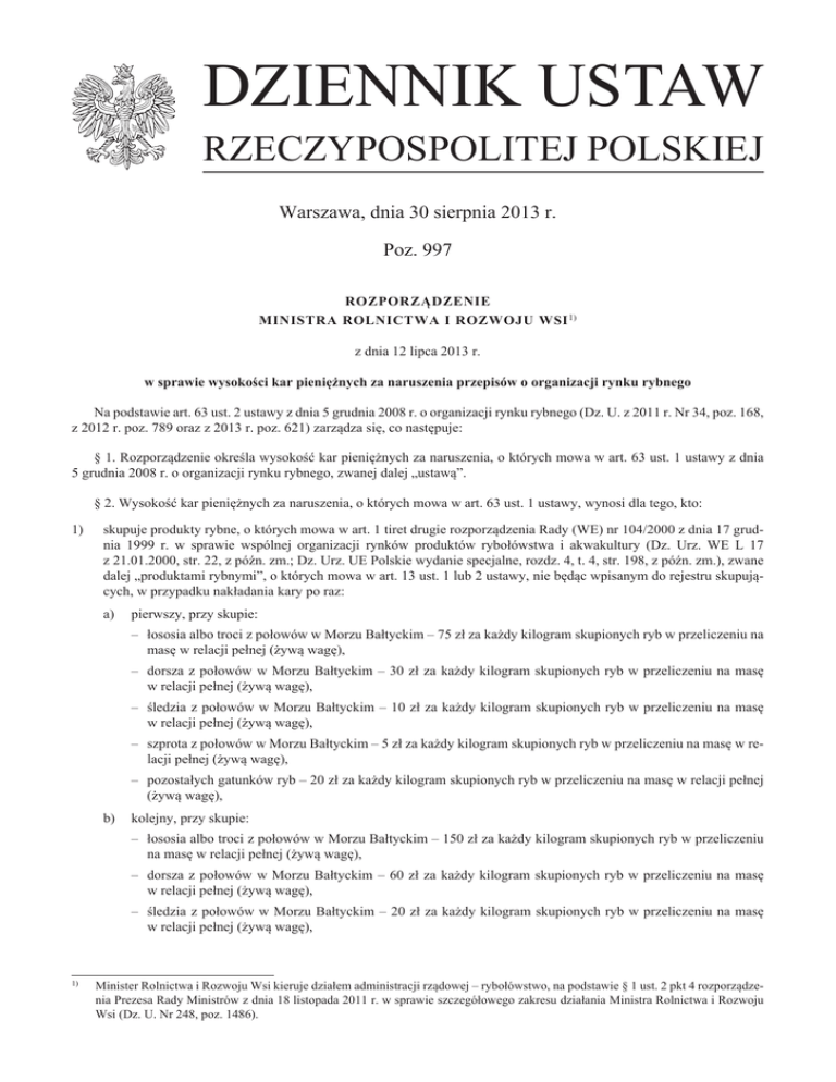 DZIENNIK USTAW RZECZYPOSPOLITEJ POLSKIEJ Warszawa, dnia 30 sierpnia 2013 r. Poz. 997 Rozporządzenie Ministra Rolnictwa i Rozwoju Wsi 1) z dnia 12 lipca 2013 r. w sprawie wysokości kar pieniężnych za naruszenia przepisów o organizacji rynku rybnego Na podstawie art. 63 ust. 2 ustawy z dnia 5 grudnia 2008 r. o organizacji rynku rybnego (Dz. U. z 2011 r. Nr 34, poz. 168, z 2012 r. poz. 789 oraz z 2013 r. poz. 621) zarządza się, co następuje: § 1. Rozporządzenie określa wysokość kar pieniężnych za naruszenia, o których mowa w art. 63 ust. 1 ustawy z dnia 5 grudnia 2008 r. o organizacji rynku rybnego, zwanej dalej „ustawą”. § 2. Wysokość kar pieniężnych za naruszenia, o których mowa w art. 63 ust. 1 ustawy, wynosi dla tego, kto: 1)skupuje produkty rybne, o których mowa w art. 1 tiret drugie rozporządzenia Rady (WE) nr 104/2000 z dnia 17 grudnia 1999 r. w sprawie wspólnej organizacji rynków produktów rybołówstwa i akwakultury (Dz. Urz. WE L 17 z 21.01.2000, str. 22, z późn. zm.; Dz. Urz. UE Polskie wydanie specjalne, rozdz. 4, t. 4, str. 198, z późn. zm.), zwane dalej „produktami rybnymi”, o których mowa w art. 13 ust. 1 lub 2 ustawy, nie będąc wpisanym do rejestru skupujących, w przypadku nakładania kary po raz: a) pierwszy, przy skupie: –łososia albo troci z połowów w Morzu Bałtyckim – 75 zł za każdy kilogram skupionych ryb w przeliczeniu na masę w relacji pełnej (żywą wagę), –dorsza z połowów w Morzu Bałtyckim – 30 zł za każdy kilogram skupionych ryb w przeliczeniu na masę w relacji pełnej (żywą wagę), –śledzia z połowów w Morzu Bałtyckim – 10 zł za każdy kilogram skupionych ryb w przeliczeniu na masę w relacji pełnej (żywą wagę), –szprota z połowów w Morzu Bałtyckim – 5 zł za każdy kilogram skupionych ryb w przeliczeniu na masę w relacji pełnej (żywą wagę), –pozostałych gatunków ryb – 20 zł za każdy kilogram skupionych ryb w przeliczeniu na masę w relacji pełnej (żywą wagę), b) kolejny, przy skupie: –łososia albo troci z połowów w Morzu Bałtyckim – 150 zł za każdy kilogram skupionych ryb w przeliczeniu na masę w relacji pełnej (żywą wagę), –dorsza z połowów w Morzu Bałtyckim – 60 zł za każdy kilogram skupionych ryb w przeliczeniu na masę w relacji pełnej (żywą wagę), –śledzia z połowów w Morzu Bałtyckim – 20 zł za każdy kilogram skupionych ryb w przeliczeniu na masę w relacji pełnej (żywą wagę), 1) Minister Rolnictwa i Rozwoju Wsi kieruje działem administracji rządowej – rybołówstwo, na podstawie § 1 ust. 2 pkt 4 rozporządzenia Prezesa Rady Ministrów z dnia 18 listopada 2011 r. w sprawie szczegółowego zakresu działania Ministra Rolnictwa i Rozwoju Wsi (Dz. U. Nr 248, poz. 1486). Dziennik Ustaw –2– Poz. 997 –szprota z połowów w Morzu Bałtyckim – 10 zł za każdy kilogram skupionych ryb w przeliczeniu na masę w relacji pełnej (żywą wagę), –pozostałych gatunków ryb – 40 zł za każdy kilogram skupionych ryb w przeliczeniu na masę w relacji pełnej (żywą wagę); 2)posługuje się zaświadczeniem o wpisie do rejestru przedsiębiorców skupujących produkty rybne, zwanego dalej „rejestrem skupujących”, zawierającym dane niezgodne ze stanem faktycznym, w przypadku nakładania kary po raz: a)pierwszy – równowartość przeciętnego wynagrodzenia w gospodarce narodowej za rok poprzedzający, ogłaszanego przez Prezesa Głównego Urzędu Statystycznego w Dzienniku Urzędowym Rzeczypospolitej Polskiej „Monitor Polski”, zwanego dalej „wynagrodzeniem”, b)kolejny – dziesięciokrotność wynagrodzenia; 3)będąc do tego obowiązanym jako przedsiębiorca wpisany do rejestru skupujących, nie dokonuje zgłoszenia, o którym mowa w art. 15 ust. 1 ustawy, w przypadku nakładania kary po raz: a)pierwszy – równowartość wynagrodzenia, b) kolejny – dziesięciokrotność wynagrodzenia; 4)sprzedaje produkty rybne podmiotom niewpisanym do rejestru skupujących w ilości przekraczającej dopuszczoną do sprzedaży bezpośredniej, w przypadku nakładania kary po raz: a)pierwszy – równowartość wynagrodzenia, b)kolejny – dziesięciokrotność wynagrodzenia; 5)wbrew obowiązkowi określonemu w art. 18 ust. 1 i 5 ustawy nie wystawia dokumentu sprzedaży, o którym mowa w art. 62 ust. 1 lub art. 63 ust. 1 rozporządzenia Rady (WE) nr 1224/2009 z dnia 20 listopada 2009 r. ustanawiającego wspólnotowy system kontroli w celu zapewnienia przestrzegania przepisów wspólnej polityki rybołówstwa, zmieniającego rozporządzenia (WE) nr 847/96, (WE) nr 2371/2002, (WE) nr 811/2004, (WE) nr 768/2005, (WE) nr 2115/2005, (WE) nr 2166/2005, (WE) nr 388/2006, (WE) nr 509/2007, (WE) nr 676/2007, (WE) nr 1098/2007, (WE) nr 1300/2008, (WE) nr 1342/2008 i uchylającego rozporządzenia (EWG) nr 2847/93, (WE) nr 1627/94 oraz (WE) nr 1966/2006 (Dz. Urz. UE L 343 z 22.12.2009, str. 1), zwanego dalej „dokumentem sprzedaży”, lub deklaracji przejęcia, o której mowa w art. 66 ust. 1 tego rozporządzenia, zwanej dalej „deklaracją przejęcia”, w przypadku nakładania kary po raz: a)pierwszy, przy sprzedaży lub przejęciu: –łososia albo troci z połowów w Morzu Bałtyckim – 75 zł za każdy kilogram skupionych ryb w przeliczeniu na masę w relacji pełnej (żywą wagę), –dorsza z połowów w Morzu Bałtyckim – 30 zł za każdy kilogram skupionych ryb w przeliczeniu na masę w relacji pełnej (żywą wagę), –śledzia z połowów w Morzu Bałtyckim – 10 zł za każdy kilogram skupionych ryb w przeliczeniu na masę w relacji pełnej (żywą wagę), –szprota z połowów w Morzu Bałtyckim – 5 zł za każdy kilogram skupionych ryb w przeliczeniu na masę w relacji pełnej (żywą wagę), –pozostałych gatunków ryb – 20 zł za każdy kilogram skupionych ryb w przeliczeniu na masę w relacji pełnej (żywą wagę), b)kolejny, przy sprzedaży lub przejęciu: –łososia albo troci z połowó