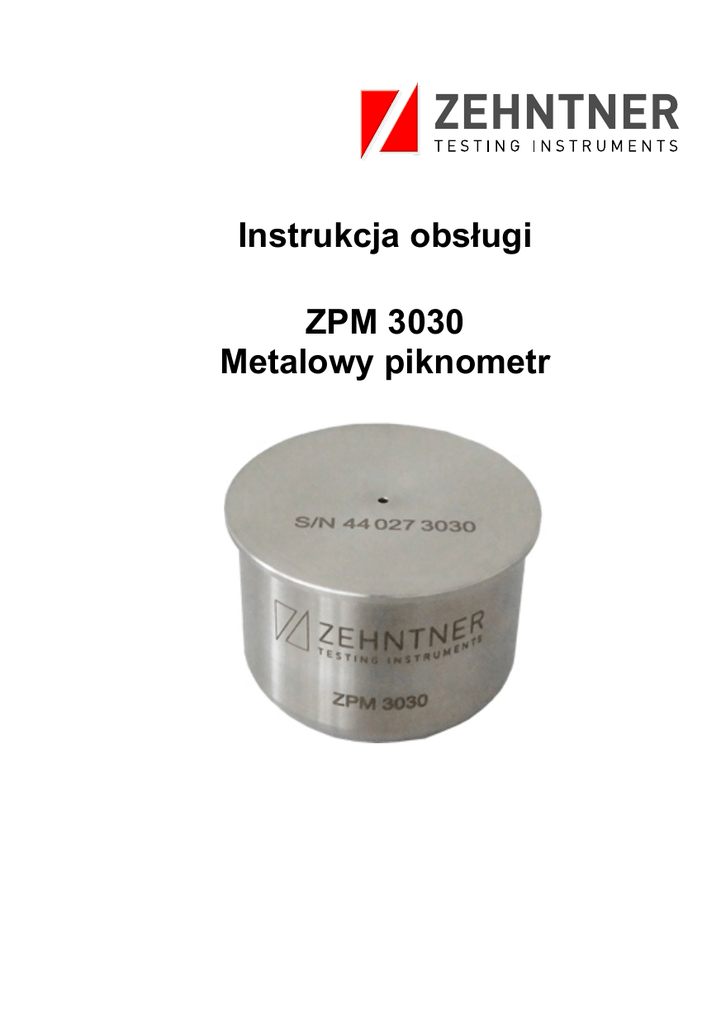 Instrukcja obsługi ZPM 3030 Metalowy piknometr 1. Dostawa • 1 piknometr z metalową pokrywką (f 50 ml lub 100 ml) • 1 certyfikat producenta • 1 walizka 2. Opcje • ZKZ015 kalibracja i certyfikacja ZPM 3030 • certyfikat kalibracji (wystawiony przez niemieckie akredytowane laboratorium) 3. Opis pokrywka nr seryjny temperature odniesienia pojemność ZPM 3030.100 ZPM 3030.50 4. Test • Zważ czysty, pusty piknometr wraz z pokrywką i zapisz wynik. • Piknometr i badana substancja muszą mieć jednakową temperaturę, wymaganą przez daną normę. • Napełnij piknometr do pełna badaną substancją i nałóż pokrywkę. • Usuń nadmiar badanej substancji. • Zważ pełny piknometr • Określ gęstość wg poniższych kalkulacji. • Nie czyść piknometru ostrym narzędziem. Użyj odpowiedniego rozpuszczalnika. 5. Kalkulacja 5.1 Legenda m1: m2: m3: m4: p: PA: pc: PG: PW: t: tc: Vc: Vt: Ym: Yp: masa w g pustego ZPM 3030 masa w g wypełnionego substancją ZPM 3030 w temp. testu masa w g wypełnionego wodą ZPM 3030 w temp. testu m3 – m1, masa badanej substancji w ZPM 3030 gęstość w g/ml badanej substancji w temp. testu gęstość powietrza (= 0.0012 g/ml) gęstość w g/ml badanej substancji w temp. odniesienia gęstość piknometru (dla stali PG = 8 g/cm3) Gęstość w g/ml destylowanej wody o małym napięciu powierzchniowym w temp. testu. temp. testu w °C temp. odniesienia °C pojemność ZPM 3030 w ml w temp. odniesienia tc pojemność ZPM 3030 w ml w temp. testu t Pojemność współczynnika przy termicznym rozszerzeniu produktu podczas testu , w przybliżeniu wartość Ym ma 2 x 10-4 °C-1 dla farb wodnych i 7 x 10-4 °C-1 dla innych farb Pojemność współczynnika przy termicznym rozszerzeniu w podobnych stopniach Celsius (°C-1), 48 x 10-6 5.2 Kalulacja gęstości próbki Gęstość p w g/ml w temp. testu może być skalkulowana: m2 – m1 p = ----------------Vt 5.3 Skorygowanie termicznego rozszerzenia piknometru Jeśli temp. testu t różni się od temp. odniesienia o więcej niż 5°C, to gęstość powinna być skorygowana wg: Vt = Vc x [1 + Yp x (t - tc)] = Vc x [1 + 48 x 10-6 x (t - tc)] 5.4 Kalkulacja gęstości w różnych temp. Jeśli gęstość badanej substancji jest określona w temperaturze innej niż temp. odniesienia, gęstość pc w g/ml w temp. odniesienia może być obliczona wg: p pc = ------------------- = p x [1 – Ym x (tc – t)] [1 + Үm (tc – t) 6. Dane techniczne Wersja: Pojemność: Wys./średnica: Waga: Tolerancja fabryczna: Budowa: Norma: Gwarancja: 3030.50 3030.100 50 ml 100 ml 35 mm x Ø 54 mm 63 mm x Ø 54 mm 144.1 g 174.4 g ± 0.2% zwiazana z poj.; jako opcja z certyfikatem kalibracji (wydany przez niemieckiej laboratorium akredytacyjne) ± 0.1% Stal nierdzewna ASTM D 1475, EN ISO 2811-1, SNV 37100, VDA 621-103 2 lata