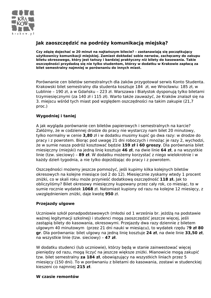Jak zaoszczędzić na podróży komunikacją miejską? Czy zdążę dojechać w 20 minut na najtańszym bilecie? – zastanawiają się początkujący użytkownicy komunikacji miejskiej. Zamiast dokładać sobie nerwów, zachęcamy do zakupu biletu okresowego, który jest tańszy i bardziej praktyczny niż bilety do kasowania. Takie oszczędności przydadzą się nie tylko studentom, którzy w dodatku w Krakowie zapłacą za bilet semestralny najmniej w porównaniu do innych miast. Porównanie cen biletów semestralnych dla żaków przygotował serwis Konto Studenta. Krakowski bilet semestralny dla studenta kosztuje 184 zł, we Wrocławiu: 185 zł, w Lublinie – 190 zł, a w Gdańsku – 223 zł. Warszawa i Białystok dysponują tylko biletami trzymiesięcznymi (za 140 zł i 115 zł). Warto także zauważyć, że Kraków znalazł się na 3. miejscu wśród tych miast pod względem oszczędności na takim zakupie (21,7 proc.) Wygodniej i taniej A jak wygląda porównanie cen biletów papierowych i semestralnych na karcie? Załóżmy, że w codziennej drodze do pracy nie wystarczy nam bilet 20 minutowy, tylko normalny w cenie 3,80 zł i w dodatku musimy kupić go dwa razy: w drodze do pracy i z powrotem. Biorąc pod uwagę 21 dni roboczych i mnożąc je razy 2, wychodzi, że w sumie nasza podróż kosztować będzie 159 zł i 60 groszy. Dla porównania bilet miesięczny (miejski) na jedną linię kosztuje 46 zł, na dwie linie 64 zł, a na wszystkie linie (tzw. sieciowy) – 89 zł. W dodatku możemy korzystać z niego wielokrotnie i w każdy dzień tygodnia, a nie tylko dojeżdżając do pracy i z powrotem. Oszczędności możemy jeszcze pomnożyć, jeśli kupimy kilka kolejnych biletów okresowych na kolejne miesiące (od 2 do 12). Miesięcznie zyskamy wtedy 1 procent zniżki, co w skali roku może przynieść dodatkową oszczędność 118 zł. Jak to obliczyliśmy? Bilet okresowy miesięczny kupowany przez cały rok, co miesiąc, to w sumie rocznie wydatek 1068 zł. Natomiast kupiony od razu na kolejne 12 miesięcy, z uwzględnieniem zniżki, daje kwotę 950 zł. Przejazdy ulgowe Uczniowie szkół ponadpodstawowych (młodsi od 1 września br. jeżdżą na podstawie ważnej legitymacji szkolnej) i studenci mogą zaoszczędzić jeszcze więcej, jeśli zastąpią bilety do kasowania, okresowymi. Przejazdy dwa razy dziennie z biletem ulgowym 40 minutowym (przez 21 dni nauki w miesiącu), to wydatek rzędu 79 zł 80 gr. Dla porównania: bilet ulgowy na jedną linię kosztuje 24 zł, na dwie linie 33,50 zł, na wszystkie linie (tzw. sieciowy) – 47 zł. W dodatku studenci (lub uczniowie), którzy będą w stanie zainwestować więcej pieniędzy od razu, mogą liczyć na jeszcze większe zniżki. Mianowicie mogą zakupić tzw. bilet semestralny za 184 zł, obowiązujący na wszystkich liniach przez 5 miesięcy (150 dni). To w porównaniu z biletami do kasowania, zostawi w studenckiej kieszeni co najmniej 215 zł. W czasie remontów Na koniec przypominamy także, że istnieje możliwość „skrócenia” czasu ważności biletu okresowego i odzyskania pieniędzy za niewykorzystany okres. Takiego zwrotu można dokonać nie później niż 16-go dnia przed upływem terminu obowiązywania biletu. Także dwukrotnie w ciągu każdego miesiąca ważności biletu można zmienić numer wybranej w nim linii. Jest to bezpłatne, należy jedynie udać się do punktu sprzedaży biletów okresowych. Warto też pamiętać, że w trakcie remontów torowisk i ulic, bilety okresowe zakupione przed wprowadzoną zmianą, obowiązują na starej i nowej trasie. Natomiast kupując bilet na jedną lub dwie linie, można jechać na wybranej trasie każdym innym tramwajem lub autobusem, od przystanku poprzedzającego rozpoczęcie wspólnej trasy do pierwszego przystanku po ustaniu wspólnej trasy. Takie udogodnienie dla pasażerów wprowadził jak dotąd tylko Kraków. Powered by TCPDF (www.tcpdf.org)