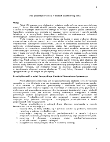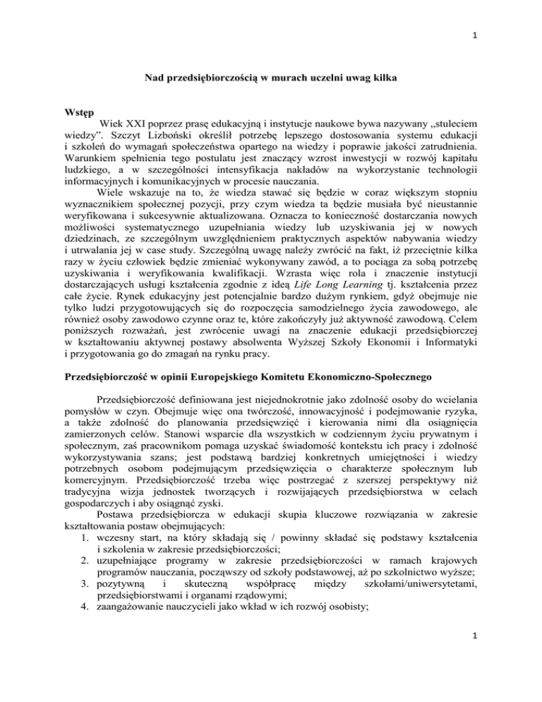 1 Nad przedsiębiorczością w murach uczelni uwag kilka Wstęp Wiek XXI poprzez prasę edukacyjną i instytucje naukowe bywa nazywany „stuleciem wiedzy”. Szczyt Lizboński określił potrzebę lepszego dostosowania systemu edukacji i szkoleń do wymagań społeczeństwa opartego na wiedzy i poprawie jakości zatrudnienia. Warunkiem spełnienia tego postulatu jest znaczący wzrost inwestycji w rozwój kapitału ludzkiego, a w szczególności intensyfikacja nakładów na wykorzystanie technologii informacyjnych i komunikacyjnych w procesie nauczania. Wiele wskazuje na to, Ŝe wiedza stawać się będzie w coraz większym stopniu wyznacznikiem społecznej pozycji, przy czym wiedza ta będzie musiała być nieustannie weryfikowana i sukcesywnie aktualizowana. Oznacza to konieczność dostarczania nowych moŜliwości systematycznego uzupełniania wiedzy lub uzyskiwania jej w nowych dziedzinach, ze szczególnym uwzględnieniem praktycznych aspektów nabywania wiedzy i utrwalania jej w case study. Szczególną uwagę naleŜy zwrócić na fakt, iŜ przeciętnie kilka razy w Ŝyciu człowiek będzie zmieniać wykonywany zawód, a to pociąga za sobą potrzebę uzyskiwania i weryfikowania kwalifikacji. Wzrasta więc rola i znaczenie instytucji dostarczających usługi kształcenia zgodnie z ideą Life Long Learning tj. kształcenia przez całe Ŝycie. Rynek edukacyjny jest potencjalnie bardzo duŜym rynkiem, gdyŜ obejmuje nie tylko ludzi przygotowujących się do rozpoczęcia samodzielnego Ŝycia zawodowego, ale równieŜ osoby zawodowo czynne oraz te, które zakończyły juŜ aktywność zawodową. Celem poniŜszych rozwaŜań, jest zwrócenie uwagi na znaczenie edukacji przedsiębiorczej w kształtowaniu aktywnej postawy absolwenta WyŜszej Szkoły Ekonomii i Informatyki i przygotowania go do zmagań na rynku pracy. Przedsiębiorczość w opinii Europejskiego Komitetu Ekonomiczno-Społecznego Przedsiębiorczość definiowana jest niejednokrotnie jako zdolność osoby do wcielania pomysłów w czyn. Obejmuje więc ona twórczość, innowacyjność i podejmowanie ryzyka, a takŜe zdolność do planowania przedsięwzięć i kierowania nimi dla osiągnięcia zamierzonych celów. Stanowi wsparcie dla wszystkich w codziennym Ŝyciu prywatnym i społecznym, zaś pracownikom pomaga uzyskać świadomość kontekstu ich pracy i zdolność wykorzystywania szans; jest podstawą bardziej konkretnych umiejętności i wiedzy potrzebnych osobom podejmującym przedsięwzięcia o charakterze społecznym lub komercyjnym. Przedsiębiorczość trzeba więc postrzegać z szerszej perspektywy niŜ tradycyjna wizja jednostek tworzących i rozwijających przedsiębiorstwa w celach gospodarczych i aby osiągnąć zyski. Postawa przedsiębiorcza w edukacji skupia kluczowe rozwiązania w zakresie kształtowania postaw obejmujących: 1. wczesny start, na który składają się / powinny składać się podstawy kształcenia i szkolenia w zakresie przedsiębiorczości; 2. uzupełniające programy w zakresie przedsiębiorczości w ramach krajowych programów nauczania, począwszy od szkoły podstawowej, aŜ po szkolnictwo wyŜsze; 3. pozytywną i skuteczną współpracę między szkołami/uniwersytetami, przedsiębiorstwami i organami rządowymi; 4. zaangaŜowanie nauczycieli jako wkład w ich rozwój osobisty; 1 2 5. zaangaŜowanie pracodawców i pracowników w sporządzenie programów edukacyjnych na rzecz przedsiębiorczości, 6. silne zaangaŜowanie i obecność społeczeństwa obywatelskiego w procesie nauczania, 7. zwracanie uwagi w szkole na znaczenie kobiet przedsiębiorców w celu promowania pozytywnej równowagi między kobietami a męŜczyznami; 8. krzewienie w równym stopniu przedsiębiorczości wśród osób niepełnosprawnych i innych grup znajdujących się w niekorzystnej sytuacji; 9. większy transfer wiedzy pomiędzy instytucjami edukacyjnymi, w tym instytucjami kształcenia wyŜszego i ustawicznego, w celu wymiany informacji i udoskonalenia programów kierowanych do studentów szkół wyŜszych. Przede wszystkim jednak przedsiębiorczość jest związana z mentalnością – niezaleŜnością, motywacją indywidualną i zdolnością do podejmowania ryzyka. Jest związana takŜe z kreatywnością i innowacyjnością, które pozwalają dostrzec szanse rynkowe i doprowadzić do sukcesu firmy. Przedsiębiorczość więc to sposób myślenia oraz proces projektowania i rozwijania działalności gospodarczej dzięki zdolności do podejmowania ryzyka, kreatywności i innowacyjności połączonych z odpowiednim sposobem zarządzania. Uczenie przez praktykę Zadaniem szkolnictwa wyŜszego jest nie tylko kształcenie uŜyteczne dla rozwoju rynku pracy, przygotowujące profesjonalistów, ale takŜe kształcenie, które rozwija w słuchaczach postawy uŜyteczne społecznie i słuŜy ich osobowemu rozwojowi . Student uczący się jest nomadą (nomadic learning) , zdobywa wiedzę i umiejętności takŜe poza formalnymi ramami wyznaczonymi przez instytucjonalną infrastrukturę, uczestniczy w projektach, komunikuje się z innymi osobami uczącymi się, niezwiązanymi często Ŝadnymi formalnymi kanałami . Podstawę edukacji „przedsiębiorczości” stanowi załoŜenie, Ŝe programy te powinny traktować naukę w tym obszarze, jako długotrwały proces, który wspomaga przedsiębiorcę na kaŜdym etapie kariery w biznesie. Dzięki doświadczeniu w nauce przedsiębiorczości ustalono zasady, które mogą stanowić podstawę edukacji: • Przedsiębiorcą nie rodzimy się, lecz stajemy, dzięki Ŝyciowemu doświadczeniu; • Przedsiębiorcy są bardzo zróŜnicowaną populacją ludzi, jednak ich cechą wspólną jest gotowość do podejmowania ryzyka, w celu osiągania zysku; • KaŜdy moŜe zostać przedsiębiorcą w kaŜdym wieku; • Pomimo braku jednomyślności w ocenie wpływu wykształcenia na załoŜenie własnej firmy, przyjmuje się, Ŝe przedsiębiorcy powinni kształcić się i zdobywać umiejętności 