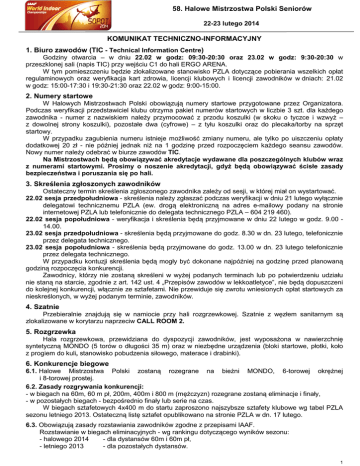 58. Halowe Mistrzostwa Polski Seniorów 22-23 lutego 2014 KOMUNIKAT TECHNICZNO-INFORMACYJNY 1. Biuro zawodów (TIC - Technical Information Centre) Godziny otwarcia – w dniu 22.02 w godz: 09:30-20:30 oraz 23.02 w godz: 9:30-20:30 w przeszklonej sali (napis TIC) przy wejściu C1 do hali ERGO ARENA. W tym pomieszczeniu będzie zlokalizowane stanowisko PZLA dotyczące pobierania wszelkich opłat regulaminowych oraz weryfikacja kart zdrowia, licencji klubowych i licencji zawodników w dniach: 21.02 w godz: 15:00-17:30 i 19:30-21:30 oraz 22.02 w godz: 9:00-15:00. 2. Numery startowe W Halowych Mistrzostwach Polski obowiązują numery startowe przygotowane przez Organizatora. Podczas weryfikacji przedstawiciel klubu otrzyma pakiet numerów startowych w liczbie 3 szt. dla każdego zawodnika - numer z nazwiskiem należy przymocować z przodu koszulki (w skoku o tyczce i wzwyż – z dowolnej strony koszulki), pozostałe dwa (cyfrowe) – z tyłu koszulki oraz do plecaka/torby na sprzęt startowy. W przypadku zagubienia numeru istnieje możliwość zmiany numeru, ale tylko po uiszczeniu opłaty dodatkowej 20 zł - nie później jednak niż na 1 godzinę przed rozpoczęciem każdego seansu zawodów. Nowy numer należy odebrać w biurze zawodów TIC. Na Mistrzostwach będą obowiązywać akredytacje wydawane dla poszczególnych klubów wraz z numerami startowymi. Prosimy o noszenie akredytacji, gdyż będą obowiązywać ścisłe zasady bezpieczeństwa i poruszania się po hali. 3. Skreślenia zgłoszonych zawodników Ostateczny termin skreślenia zgłoszonego zawodnika zależy od sesji, w której miał on wystartować. 22.02 sesja przedpołudniowa - skreślenia należy zgłaszać podczas weryfikacji w dniu 21 lutego wyłącznie delegatowi technicznemu PZLA (ew. drogą elektroniczną na adres e-mailowy podany na stronie internetowej PZLA lub telefonicznie do delegata technicznego PZLA – 604 219 460). 22.02 sesja popołudniowa - weryfikacja i skreślenia będą przyjmowane w dniu 22 lutego w godz. 9.00 14.00. 23.02 sesja przedpołudniowa - skreślenia będą przyjmowane do godz. 8.30 w dn. 23 lutego, telefonicznie przez delegata technicznego. 23.02 sesja popołudniowa - skreślenia będą przyjmowane do godz. 13.00 w dn. 23 lutego telefonicznie przez delegata technicznego. W przypadku kontuzji skreślenia będą mogły być dokonane najpóźniej na godzinę przed planowaną godziną rozpoczęcia konkurencji. Zawodnicy, którzy nie zostaną skreśleni w wyżej podanych terminach lub po potwierdzeniu udziału nie staną na starcie, zgodnie z art. 142 ust. 4 „Przepisów zawodów w lekkoatletyce”, nie będą dopuszczeni do kolejnej konkurencji, włącznie ze sztafetami. Nie przewiduje się zwrotu wniesionych opłat startowych za nieskreślonych, w wyżej podanym terminie, zawodników. 4. Szatnie Przebieralnie znajdują się w namiocie przy hali rozgrzewkowej. Szatnie z węzłem sanitarnym są zlokalizowane w korytarzu naprzeciw CALL ROOM 2. 5. Rozgrzewka Hala rozgrzewkowa, przewidziana do dyspozycji zawodników, jest wyposażona w nawierzchnię syntetyczną MONDO (5 torów o długości 35 m) oraz w niezbędne urządzenia (bloki startowe, płotki, koło z progiem do kuli, stanowisko pobudzenia siłowego, materace i drabinki). 6. Konkurencje biegowe 6.1. Halowe Mistrzostwa Polski zostaną rozegrane na bieżni MONDO, 6-torowej okrężnej i 8-torowej prostej. 6.2. Zasady rozgrywania konkurencji: - w biegach na 60m, 60 m pł, 200m, 400m i 800 m (mężczyzn) rozegrane zostaną eliminacje i finały, - w pozostałych biegach - bezpośrednio finały lub serie na czas. W biegach sztafetowych 4x400 m do startu zaproszono najszybsze sztafety klubowe wg tabel PZLA sezonu letniego 2013. Ostateczną listę sztafet opublikowano na stronie PZLA w dn. 17 lutego. 6.3. Obowiązują zasady rozstawiania zawodników zgodne z przepisami IAAF. Rozstawianie w biegach eliminacyjnych - wg rankingu dotyczącego wyników sezonu: - halowego 2014 - dla dystansów 60m i 60m pł, - letniego 2013 - dla pozostałych dystansów. 1 Kolejność serii rozgrywanych na czas oraz biegów eliminacyjnych będzie losowana. W przypadku gdy zawodnik w biegach na 60m lub 60m pł nie posiada wyniku z roku bieżącego, a posiada klasę MM do rozstawienia brany jest wynik z roku 2013 w biegach na 100m lub 100 m pł/110 m pł. W przypadku niezweryfikowania zawodników na 2 godziny przed danym seansem zawodów, w którym rozgrywane są eliminacje, delegat techniczny skreśla tych zawodników z listy startowej we wszystkich zgłoszonych konkurencjach. W przypadku skreślenia w ten sposób zawodników rozstawionych wg uzyskanych wyników przed biegami eliminacyjnymi zastrzega się możliwość przeprowadzenia ponownego rozstawienia zawodników – decyzję w tej sprawie podejmuje delegat techniczny. 6.4. Zasady awansu do finałów - 60m K i M - 60m pł K i M - 800m M - w przypadku 3 biegów eliminacyjnych do finału awansują zwycięzcy biegów oraz zawodnicy z najlepszymi czasami (w finale 800 m startuje 6 zawodników), - w przypadku 2 biegów eliminacyjnych do finału awansują zawodnicy, którzy zajmą miejsca 1 - 2 oraz kolejni z najlepszymi czasami. - w biegach 200m i 400m do finału awansują zawodnicy z najlepszymi czasami eliminacji (w finałach startuje po 6 zawodników). 6.5. Rozgrywanie biegów na 200m i 400m - eliminacje - na torach 3 ÷ 6 (maksymalnie po 4 zawodników w każdym biegu) - finał - na torach 1 ÷ 6 Losowanie torów w biegach eliminacyjnych: - dwaj najlepsi w rankingu 2013 w danej serii - na torach 5 - 6 - następni dwaj - na torach 3 - 4 Losowanie torów w biegach finałowych: - zawodnicy z czasami 1 - 2 w eliminacjach - na torach 5 - 6 - zawodnicy z czasami 3 - 4 - na torach 3 - 4 - zawodnicy z czasami 5 - 6 - na torach 1 - 2 6.6. Losowanie biegów sztafetowych 4x400m (finał): - dwie najszybsze sztafety w rankingu 2013 - na torach 5 - 6 - kolejne dwie - na torach 3 - 4 - kolejne dwie - na torach 1 - 2 6.7. Losowanie torów 