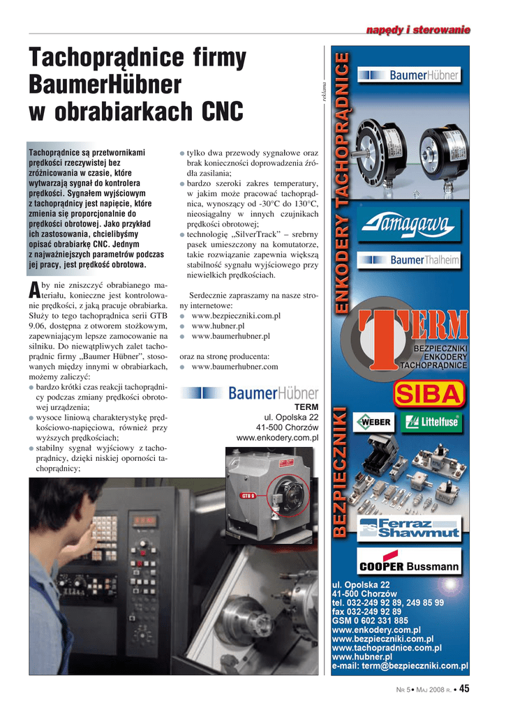 Tachoprądnice są przetwornikami prędkości rzeczywistej bez zróżnicowania w czasie, które wytwarzają sygnał do kontrolera prędkości. Sygnałem wyjściowym z tachoprądnicy jest napięcie, które zmienia się proporcjonalnie do prędkości obrotowej. Jako przykład ich zastosowania, chcielibyśmy opisać obrabiarkę CNC. Jednym z najważniejszych parametrów podczas jej pracy, jest prędkość obrotowa. A by nie zniszczyć obrabianego materiału, konieczne jest kontrolowanie prędkości, z jaką pracuje obrabiarka. Służy to tego tachoprądnica serii GTB 9.06, dostępna z otworem stożkowym, zapewniającym lepsze zamocowanie na silniku. Do niewątpliwych zalet tachoprądnic firmy „Baumer Hübner”, stosowanych między innymi w obrabiarkach, możemy zaliczyć: bardzo krótki czas reakcji tachoprądnicy podczas zmiany prędkości obrotowej urządzenia; wysoce liniową charakterystykę prędkościowo-napięciowa, również przy wyższych prędkościach; stabilny sygnał wyjściowy z tachoprądnicy, dzięki niskiej oporności tachoprądnicy; reklama Tachoprądnice firmy BaumerHübner w obrabiarkach CNC tylko dwa przewody sygnałowe oraz brak konieczności doprowadzenia źródła zasilania; bardzo szeroki zakres temperatury, w jakim może pracować tachoprądnica, wynoszący od -30°C do 130°C, nieosiągalny w innych czujnikach prędkości obrotowej; technologię „SilverTrack” – srebrny pasek umieszczony na komutatorze, takie rozwiązanie zapewnia większą stabilność sygnału wyjściowego przy niewielkich prędkościach. Serdecznie zapraszamy na nasze strony internetowe: www.bezpieczniki.com.pl www.hubner.pl www.baumerhubner.pl oraz na stronę producenta: www.baumerhubner.com TERM ul. Opolska 22 41-500 Chorzów www.enkodery.com.pl NR 5 MAJ 2008 R. 45