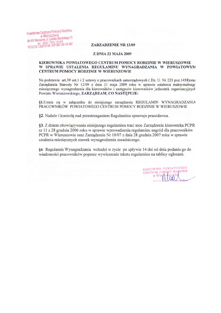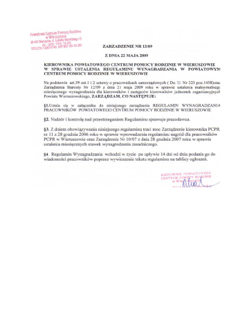 Załącznik do Zarządzenia nr 13/09 Kierownika PCPR w Wieruszowie z dnia 22 maja 2009 roku. REGULAMIN WYNAGRADZANIA PRACOWNIKÓW POWIATOWEGO CENTRUM POMOCY RODZINIE W WIERUSZOWIE ROZDZIAŁ I. PRZEPISY WSTĘPNE §1.Regulamin określa zasady i warunki wynagradzania za pracę oraz świadczenia związane z pracą i warunki ich przyznawania. §2.1Regulamin wynagradzania , zwany dalej regulaminem określa: 1) wymagania kwalifikacyjne pracowników, 2) szczegółowe warunki wynagradzania , w tym maksymalny poziom wynagrodzenia zasadniczego, 3) warunki przyznawania nagród innych niż nagroda jubileuszowa, 4) warunki i sposób przyznawania dodatku funkcyjnego, 5) warunki przyznawania dodatku specjalnego, 6) warunki przyznawania dodatku dla pracownika socjalnego 2. Regulamin obowiązuje pracowników zatrudnionych na umowę o pracę. §3. Ilekroć w regulaminie jest mowa o: 1) Rozporządzeniu – rozumie się przez to Rozporządzenie Rady Ministrów z dnia 18 marca 2009 roku w sprawie wynagradzania pracowników samorządowych ( Dz. U. z dnia 27 marca 2009 roku) 2) Pracodawcy – rozumie się przez to Kierownika Powiatowego Centrum Pomocy Rodzinie w Wieruszowie, 3) Pracowniku- rozumie się przez to osobę zatrudnioną w Powiatowym Centrum Pomocy Rodzinie w Wieruszowie na podstawie umowy o pracę, bez względu na rodzaj umowy o pracę i wymiar czasu pracy. ROZDZIAŁ II. WYMAGANIA KWALIFIKACYJNE §4.1 Wykaz stanowisk pracowniczych, szczegółowe wymagania kwalifikacyjne pracowników i kategorie zaszeregowania określa załącznik nr 1 do regulaminu. 2.W zakresie nieuregulowanym w zarządzeniu obowiązują wymagania kwalifikacyjne określone przepisami prawa. ROZDZIAŁ III. SZCZEGÓŁOWE WARUNKI WYNAGRADZANIA §5.1.Pracownikowi przysługuje wynagrodzenie stosowne do zajmowanego stanowiska oraz posiadanych kwalifikacji zawodowych. 2. Pracownikowi przysługuje wynagrodzenie zasadnicze , dodatek za wieloletnią pracę, nagroda jubileuszowa oraz jednorazowa odprawa w związku z przejściem na emeryturę lub rentę z tytułu niezdolności do pracy oraz dodatkowe wynagrodzenie roczne na zasadach określonych w odrębnych przepisach. §6. Ustala się maksymalne stawki wynagrodzenia pracowników, zgodnie z załącznikiem nr 2 do regulaminu. ROZDZIAŁ IV.WARUNKI PRZYZNAWANIA NAGRÓD INNYCH NIŻ NAGRODA JUBILEUSZOWA §7. 1.W ramach posiadanych środków na wynagrodzenia może być utworzony fundusz nagród z przeznaczeniem na nagrody za szczególne osiągnięcia w pracy zawodowej pozostający w dyspozycji pracodawcy. 2.Nagrody mogą być przyznawane z okazji Dnia pracownika socjalnego oraz na koniec roku kalendarzowego. 3.Nagrody przyznaje się pracownikom wyróżniającym się w pracy zawodowej w szczególności za : 1) rzetelność i wzorowe , sumienne wykonywanie obowiązków służbowych, 2) stopień złożoności i trudności wykonywanych zadań, 3) dyspozycyjność pracownika w zakresie wykonywanych ważnych i pilnych zadań zawodowych. 4.Nagroda nie ulega pomniejszeniu za okres niezdolności do pracy , a tym samym nie jest wliczana do podstawy wymiaru wynagrodzenia i zasiłku chorobowego. 5.Wysokość nagrody każdorazowo ustala pracodawca. ROZDZIAŁ V. WARUNKI I SPOSÓB PRZYZNAWANIA DODATKU FUNKCYJNEGO §8.1.Pracownikom zatrudnionym na stanowiskach związanych z kierowaniem zespołem lub innym jeżeli to wynika z załącznika nr 3 do niniejszego regulaminu przysługuje dodatek funkcyjny. 2.Wysokość dodatku ustalana jest w oparciu o załącznik nr 1 i 3 do niniejszego regulaminu. 3.Kierownik PCPR ustala wysokość dodatku poszczególnym pracownikom . 4.Wysokość dodatku Kierownikowi ustala Starosta. ROZDZIAŁ VI. WARUNKI I SPOSÓB PRZYZNAWANIA DODATKU SPECJALNEGO §9.1.Z tytułu okresowego zwiększenia obowiązków służbowych lub powierzenia dodatkowych zadań pracownikowi może by przyznany dodatek specjalny, w wysokości do 60 % wynagrodzenia zasadniczego tego pracownika. 2.W szczególnie uzasadnionych przypadkach dodatek specjalny może być przyznany w wyższej wysokości niż określony w ust.1. 3.Dodatek specjalny przyznaje się na czas określony. 4.Kierownik PCPR ustala wysokość dodatku poszczególnym pracownikom . 5.Wysokość dodatku Kierownikowi ustala Starosta. ROZDZIAŁ VII.WARUNKI I SPOSÓB PRZYZNAWANIA DODATKU DLA PRACOWNIKÓW SOCJALNYCH. §10.1.Pracownikowi socjalnemu zatrudnionemu w pełnym wymiarze czasu pracy w PCPR w Wieruszowie , do którego podstawowych obowiązków należy świadczenie pracy socjalnej w środowisku , w tym przeprowadzanie wywiadów środowiskowych poza siedzibą jednostki, przysługuje wypłacany co miesiąc dodatek do wynagrodzenia zgodnie z ustawą o pomocy społecznej. 2. W przypadku zatrudnienia w mniejszym wymiarze czasu pracy dodatek przysługuje w wysokości proporcjonalnej do czasu pracy. ROZDZIAŁ VIII .TERMIN I SPOSÓB WYPŁATY §11.1.Wynagrodzenie za pracę wypłacane będzie z ”dołu” raz w miesiącu w terminie do 29 danego miesiąca. 2. Wypłata wynagrodzenia następuje przelewem na konto bankowe pracownika , po uzyskaniu jego pisemnej zgody. ROZDZIAŁ IX . POSTANOWIENIA KOŃCOWE §12.W sprawach nieuregulowanych regulaminem wynagradzania stosuje się przepisy prawa pracy ze szczególnym uwzględnieniem : Kodeksu pracy , ustawy o pracownikach samorządowych i rozporządzenia płacowego. §13.Regulamin będzie udostępniony do wglądu u Kierownika PCPR. §14 Wszelkie zmiany Regulaminu następują w formie pisemnej w trybie obowiązującym do jego ustalenia. Załącznik nr 1 do Regulaminu Wynagradzania Pracowników PCPR w Wieruszowie Wykaz stanowisk pracowniczych , szczegółowe wymagania kwalifikacyjne i kategorie zaszeregowania L.p. Stanowiska 1. 1. STANOWISKA DYREKTOR /KIEROWNIK JEDNOSTKI Kategorie zaszeregowania Wymagania kwalifikacyjne Wykształcenie oraz umiejętności zawodowe KIEROWNICZE URZĘDNICZE Wyższe lub wg. XIX odrębnych przepisów GŁÓWNY KSIĘGOWY XVI-XIX wyższe ekonomiczne co najmniej 3 letnia praktyka w księgowości Staw