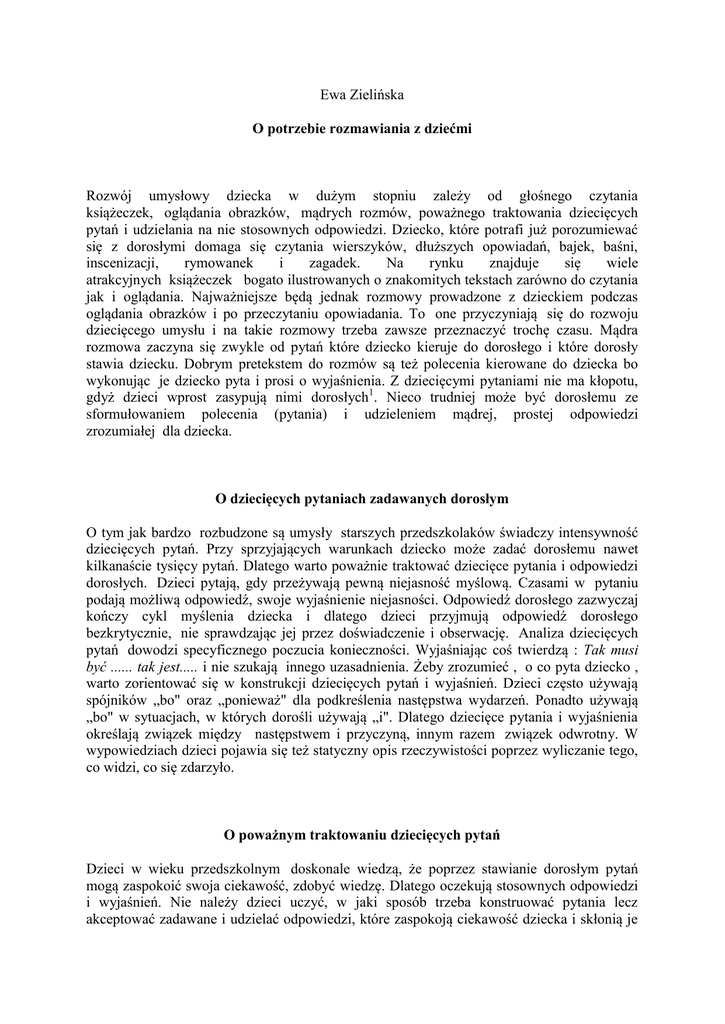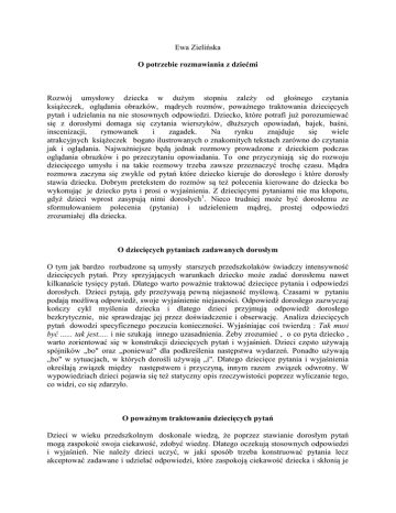 Ewa Zielińska O potrzebie rozmawiania z dziećmi Rozwój umysłowy dziecka w dużym stopniu zależy od głośnego czytania książeczek, oglądania obrazków, mądrych rozmów, poważnego traktowania dziecięcych pytań i udzielania na nie stosownych odpowiedzi. Dziecko, które potrafi już porozumiewać się z dorosłymi domaga się czytania wierszyków, dłuższych opowiadań, bajek, baśni, inscenizacji, rymowanek i zagadek. Na rynku znajduje się wiele atrakcyjnych książeczek bogato ilustrowanych o znakomitych tekstach zarówno do czytania jak i oglądania. Najważniejsze będą jednak rozmowy prowadzone z dzieckiem podczas oglądania obrazków i po przeczytaniu opowiadania. To one przyczyniają się do rozwoju dziecięcego umysłu i na takie rozmowy trzeba zawsze przeznaczyć trochę czasu. Mądra rozmowa zaczyna się zwykle od pytań które dziecko kieruje do dorosłego i które dorosły stawia dziecku. Dobrym pretekstem do rozmów są też polecenia kierowane do dziecka bo wykonując je dziecko pyta i prosi o wyjaśnienia. Z dziecięcymi pytaniami nie ma kłopotu, gdyż dzieci wprost zasypują nimi dorosłych1. Nieco trudniej może być dorosłemu ze sformułowaniem polecenia (pytania) i udzieleniem mądrej, prostej odpowiedzi zrozumiałej dla dziecka. O dziecięcych pytaniach zadawanych dorosłym O tym jak bardzo rozbudzone są umysły starszych przedszkolaków świadczy intensywność dziecięcych pytań. Przy sprzyjających warunkach dziecko może zadać dorosłemu nawet kilkanaście tysięcy pytań. Dlatego warto poważnie traktować dziecięce pytania i odpowiedzi dorosłych. Dzieci pytają, gdy przeżywają pewną niejasność myślową. Czasami w pytaniu podają możliwą odpowiedź, swoje wyjaśnienie niejasności. Odpowiedź dorosłego zazwyczaj kończy cykl myślenia dziecka i dlatego dzieci przyjmują odpowiedź dorosłego bezkrytycznie, nie sprawdzając jej przez doświadczenie i obserwację. Analiza dziecięcych pytań dowodzi specyficznego poczucia konieczności. Wyjaśniając coś twierdzą : Tak musi być ...... tak jest..... i nie szukają innego uzasadnienia. Żeby zrozumieć , o co pyta dziecko , warto zorientować się w konstrukcji dziecięcych pytań i wyjaśnień. Dzieci często używają spójników „bo" oraz „ponieważ" dla podkreślenia następstwa wydarzeń. Ponadto używają „bo" w sytuacjach, w których dorośli używają „i". Dlatego dziecięce pytania i wyjaśnienia określają związek między następstwem i przyczyną, innym razem związek odwrotny. W wypowiedziach dzieci pojawia się też statyczny opis rzeczywistości poprzez wyliczanie tego, co widzi, co się zdarzyło. O poważnym traktowaniu dziecięcych pytań Dzieci w wieku przedszkolnym doskonale wiedzą, że poprzez stawianie dorosłym pytań mogą zaspokoić swoja ciekawość, zdobyć wiedzę. Dlatego oczekują stosownych odpowiedzi i wyjaśnień. Nie należy dzieci uczyć, w jaki sposób trzeba konstruować pytania lecz akceptować zadawane i udzielać odpowiedzi, które zaspokoją ciekawość dziecka i skłonią je do formułowania następnych dociekliwych pytań. W domu rodzinnym dzieci zadają więcej pytań niż w przedszkolu. Przyczyna tkwi w organizacji przedszkola: nauczyciel jest jeden i nie może odpowiedzieć jednocześnie na wszystkie kierowane do niego pytania bo dzieci jest dużo. Ponadto onieśmielone gromadką rówieśników dzieci pytają rzadziej. W domu dziecko może swobodnie zadawać pytania: skupia wówczas uwagę na sobie, formułuje pytanie i dopomina się odpowiedzi. Jest odważniejsze gdyż włącza się w nurt prowadzonych rozmów . Niezależnie od tego, gdzie dzieci formułują pytania i czego te pytania dotyczą, dorośli muszą cierpliwie słuchać i odpowiadać . O udzielaniu dobrych odpowiedzi na dziecięce pytania Zadaniem dorosłych jest udzielanie odpowiedzi na pytania stawiane przez dzieci. Powinni oni: - odpowiadać chętnie i swobodnie na dziecięce pytania. Nie mogą pouczać dziecka, mówić zniecierpliwionym tonem ale włączyć odpowiedź na pytanie w miłą, przyjazną rozmowę w czasie której dziecko będzie miało okazje stawiać następne pytania i przedstawiać swe wątpliwości; - udzielając odpowiedzi uwzględniać możliwości dziecięcego umysłu. Dzieci formułują krótkie pytania i od dorosłych oczekują krótkich odpowiedzi. Zbyt obszerne odpowiedzi męczą dziecko, nużą je i zniechęcają do formułowania dalszych pytań; - brać pod uwagę to, że udzielana dziecku odpowiedź jest podstawowa i tymczasowa. Odpowiedź udzielona na pytanie pomaga budować aktualny system wiedzy, pobudza ciekawość i zachęca do stawiania następnych pytań na które trzeba odpowiedzieć już bardziej wyczerpująco; - odpowiadać zgodnie z prawdą , ale na miarę dziecięcych możliwości intelektualnych. Nie wolno okłamywać dziecka i podawać mylnych informacji. Jeżeli dorosły nie potrafi natychmiast udzielić odpowiedzi, powinien powiedzieć: Nie wiem, ale dowiem się i odpowiem ci. Potem obietnicę należy spełnić. Dziecko zadające pytania zwykle wie, jakiej odpowiedzi oczekuje. Dlatego trzeba uważnie słuchać dziecięcych pytań a potem udzielać mądrych odpowiedzi. Jest to niebywale skuteczny sposób wspomagania rozwoju intelektualnego dzieci. Znakomitym pretekstem do zadawania przez dzieci pytań i do prowadzenia rozmowy z dzieckiem jest wspólne oglądanie obrazków. Wówczas można połączyć rozmowę ze wspomaganiem rozwoju pamięci wzrokowej u dzieci. O korzyściach wynikających ze wspólnego z dzieckiem oglądania obrazków Dobrze rozwinięta pamięć wzrokowa jest potrzebna dzieciom w początkowej nauce czytania i pisania a także w nauce matematyki. Dla przyswojenia tego, co jest przedstawione na obrazku, dziecko musi umieć skupić się dużej i objąć wzrokiem nie tylko to, co znajduje się na środku obrazka, lecz także to, co znajduje się na jego obrzeżach. Towarzyszy temu spory wysiłek intelektualny, g