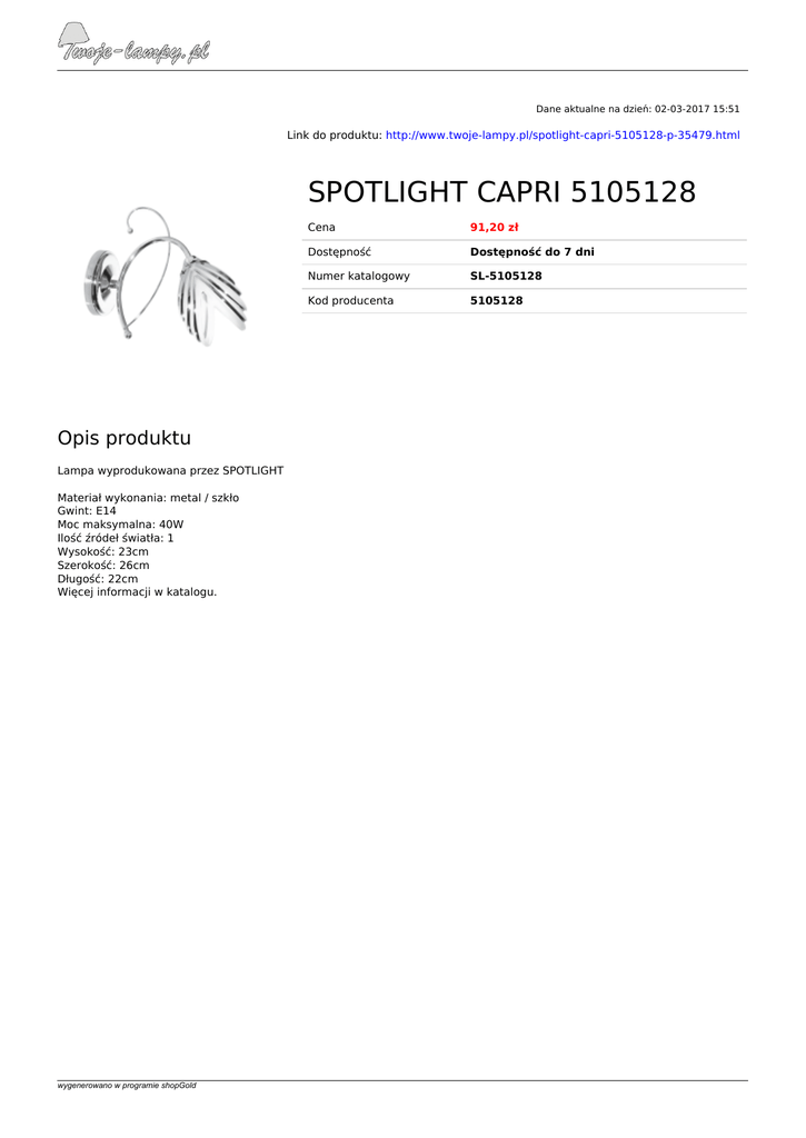 Dane aktualne na dzień: 02-03-2017 15:51 Link do produktu: http://www.twoje-lampy.pl/spotlight-capri-5105128-p-35479.html SPOTLIGHT CAPRI 5105128 Opis produktu Lampa wyprodukowana przez SPOTLIGHT Materiał wykonania: metal / szkło Gwint: E14 Moc maksymalna: 40W Ilość źródeł światła: 1 Wysokość: 23cm Szerokość: 26cm Długość: 22cm Więcej informacji w katalogu. wygenerowano w programie shopGold Powered by TCPDF (www.tcpdf.org) Cena 91,20 zł Dostępność Dostępność do 7 dni Numer katalogowy SL-5105128 Kod producenta 5105128