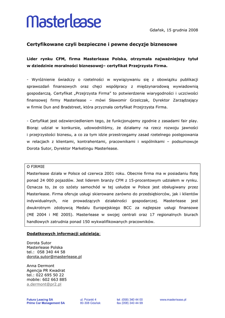 Gdańsk, 15 grudnia 2008 Certyfikowane czyli bezpieczne i pewne decyzje biznesowe Lider rynku CFM, firma Masterlease Polska, otrzymała najwaŜniejszy tytuł w dziedzinie moralności biznesowej– certyfikat Przejrzysta Firma. - WyróŜnienie świadczy o rzetelności w wywiązywaniu się z obowiązku publikacji sprawozdań finansowych oraz chęci współpracy z międzynarodową wywiadownią gospodarczą. Certyfikat „Przejrzysta Firma” to potwierdzenie wiarygodności i uczciwości finansowej firmy Masterlease – mówi Sławomir Grzelczak, Dyrektor Zarządzający w firmie Dun and Bradstreet, która przyznała certyfikat Przejrzysta Firma. - Certyfikat jest odzwierciedleniem tego, Ŝe funkcjonujemy zgodnie z zasadami fair play. Biorąc udział w konkursie, udowodniliśmy, Ŝe działamy na rzecz rozwoju jawności i przejrzystości biznesu, a co za tym idzie przestrzegamy zasad rzetelnego postępowania w relacjach z klientami, kontrahentami, pracownikami i wspólnikami – podsumowuje Dorota Sutor, Dyrektor Marketingu Masterlease. O FIRMIE Masterlease działa w Polsce od czerwca 2001 roku. Obecnie firma ma w posiadaniu flotę ponad 24 000 pojazdów. Jest liderem branŜy CFM z 15-procentowym udziałem w rynku. Oznacza to, Ŝe co szósty samochód w tej usłudze w Polsce jest obsługiwany przez Masterlease. Firma oferuje usługi skierowane zarówno do przedsiębiorców, jak i klientów indywidualnych, nie prowadzących działalności gospodarczej. Masterlease jest dwukrotnym zdobywcą Medalu Europejskiego BCC za najlepsze usługi finansowe (ME 2004 i ME 2005). Masterlease w swojej centrali oraz 17 regionalnych biurach handlowych zatrudnia ponad 150 wykwalifikowanych pracowników. Dodatkowych informacji udzielają: Dorota Sutor Masterlease Polska tel.: 058 340 44 58 [email protected] Anna Dermont Agencja PR Kwadrat tel.: 022 695 50 22 mobile: 602 663 885 [email protected]