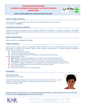 SPOTKANIE PRODUKTOWE Z ZAKRESU NARZĘDZI WSPIERAJĄCYCH PROCES REWIZJI FINANSOWEJ KARTY DOKUMENTACJI REWIZYJNEJ KDR 2015 Termin i miejsce szkolenia: 14 grudzień 2015 r. (poniedziałek), godz. 16:30-19:30, siedziba RO KIBR w Łodzi, ul. Nowa 6/12 Cena szkolenia: nieodpłatnie Do kogo kierowane jest szkolenie: Spotkanie produktowe kierowane jest do biegłych rewidentów, kandydatów na biegłych rewidentów, aplikantów, pracowników, współpracowników oraz klientów podmiotów uprawnionych do badań sprawozdań finansowych, klientów biegłych rewidentów. Kwestie organizacyjne: Zajęcia prowadzone są w grupie min. 15 osób. Program szkolenia: Kolejna edycja uznanego programu wspierającego biegłych rewidentów w procesie dokumentowania badania sprawozdania finansowego. W kolejnej edycji program zawiera zmiany stopniowo dostosowujące do Międzynarodowych Standardów Badania. Program pozwala na: Przyspieszenie procesu badania Poszerzenie wiedzy biegłych rewidentów Zwiększenie umiejętności biegłych rewidentów w zakresie dokumentacji badania Program zawiera między innymi: Dobór Próby – narzędzie wspomagające proces wyboru próby metodami statystycznymi USF – narzędzie do uzgadniania zestawienia obrotów i sald ze sprawozdaniem finansowym Bank Wiedzy – załączone przepisy prawne oraz odwołania z programu do konkretnych przepisów Przewodnik dla biegłych rewidentów do poszczególnych pozycji sprawozdania finansowego oraz VAT Wzory sprawozdań finansowych i automatycznych ich upload do systemu Wzory opinii i raportów Wzory dokumentów i wiele innych funkcjonalności Prowadzący: Anna Mierzejewska biegły rewident nr rej. 11280 Posiada kilkunastoletnie doświadczenie zawodowe. Od 2012 roku pracuje w U-FIN Sp. z o.o. jako Dyrektor ds. Audytu. Odpowiedzialna za badania sprawozdań finansowych jak również doskonalenie programu KDR. Wszystkich zainteresowanych prosimy o odesłanie do Regionalnego Oddziału w Łodzi wypełnionych kart zgłoszeniowych na adres meilowy: [email protected] lub faxem: 42/674-35-01 KRAJOWA IZBA BIEGŁYCH REWIDENTÓW REGIONALNY ODDZIAŁ W ŁODZI ul. Nowa 6/12 • 90-031 Łódź tel. (42) 639-99-23 fax (42) 674-35-01 • [email protected] • www.lodz.kibr.org.pl