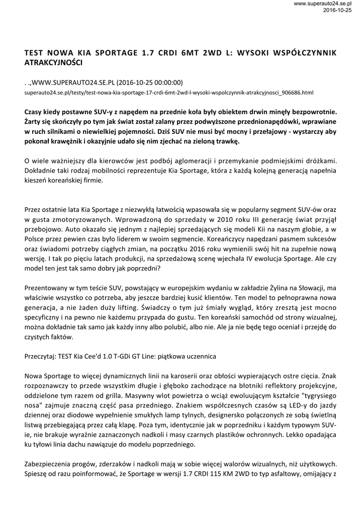 www.superauto24.se.pl 2016-10-25 TEST NOWA KIA SPORTAGE 1.7 CRDI 6MT 2WD L: WYSOKI WSPÓŁCZYNNIK ATRAKCYJNOŚCI . .,WWW.SUPERAUTO24.SE.PL (2016-10-25 00:00:00) superauto24.se.pl/testy/test-nowa-kia-sportage-17-crdi-6mt-2wd-l-wysoki-wspolczynnik-atrakcyjnosci_906686.html Czasy kiedy postawne SUV-y z napędem na przednie koła były obiektem drwin minęły bezpowrotnie. Żarty się skończyły po tym jak świat został zalany przez podwyższone przednionapędówki, wprawiane w ruch silnikami o niewielkiej pojemności. Dziś SUV nie musi być mocny i przełajowy - wystarczy aby pokonał krawężnik i okazyjnie udało się nim zjechać na zieloną trawkę. O wiele ważniejszy dla kierowców jest podbój aglomeracji i przemykanie podmiejskimi dróżkami. Dokładnie taki rodzaj mobilności reprezentuje Kia Sportage, która z każdą kolejną generacją napełnia kieszeń koreańskiej firmie. Przez ostatnie lata Kia Sportage z niezwykłą łatwością wpasowała się w popularny segment SUV-ów oraz w gusta zmotoryzowanych. Wprowadzoną do sprzedaży w 2010 roku III generację świat przyjął przebojowo. Auto okazało się jednym z najlepiej sprzedających się modeli Kii na naszym globie, a w Polsce przez pewien czas było liderem w swoim segmencie. Koreańczycy napędzani pasmem sukcesów oraz świadomi potrzeby ciągłych zmian, na początku 2016 roku wymienili swój hit na zupełnie nową wersję. I tak po pięciu latach produkcji, na sprzedażową scenę wjechała IV ewolucja Sportage. Ale czy model ten jest tak samo dobry jak poprzedni? Prezentowany w tym teście SUV, powstający w europejskim wydaniu w zakładzie Żylina na Słowacji, ma właściwie wszystko co potrzeba, aby jeszcze bardziej kusić klientów. Ten model to pełnoprawna nowa generacja, a nie żaden duży lifting. Świadczy o tym już śmiały wygląd, który zresztą jest mocno specyficzny i na pewno nie każdemu przypada do gustu. Ten koreański samochód od strony wizualnej, można dokładnie tak samo jak każdy inny albo polubić, albo nie. Ale ja nie będę tego oceniał i przejdę do czystych faktów. Przeczytaj: TEST Kia Cee'd 1.0 T-GDi GT Line: piątkowa uczennica Nowa Sportage to więcej dynamicznych linii na karoserii oraz obłości wypierających ostre cięcia. Znak rozpoznawczy to przede wszystkim długie i głęboko zachodzące na błotniki reflektory projekcyjne, oddzielone tym razem od grilla. Masywny wlot powietrza o wciąż ewoluującym kształcie "tygrysiego nosa" zajmuje znaczną część pasa przedniego. Znakiem współczesnych czasów są LED-y do jazdy dziennej oraz diodowe wypełnienie smukłych lamp tylnych, designersko połączonych ze sobą świetlną listwą przebiegającą przez całą klapę. Poza tym, identycznie jak w poprzedniku i każdym typowym SUVie, nie brakuje wyraźnie zaznaczonych nadkoli i masy czarnych plastików ochronnych. Lekko opadająca ku tyłowi linia dachu nawiązuje do modelu poprzedniego. Zabezpieczenia progów, zderzaków i nadkoli mają w sobie więcej walorów wizualnych, niż użytkowych. Spieszę od razu poinformować, że Sportage w wersji 1.7 CRDI 115 KM 2WD to typ asfaltowy, omijający z www.superauto24.se.pl 2016-10-25 daleka teren. Niech nikogo tu nie zmyli wyższy prześwit, bo to auto sprawdzi się co najwyżej na polskich dziurach, wysokich krawężnikach i w trakcie przejazdu przez głębszą kałużę. W przypływie zaufania do pojazdu pokonamy też wzniesienie. Na bardziej śmiałe wyczyny nie pozwoli napęd na przednie koła, na który klienci decydują się najczęściej po przekroczeniu progu dilerskiego salonu. Sportage 2WD pozbawiona przełajowych umiejętności szybko się podda po zabraniu w teren. W przypadku chęci jeżdżenia po bardziej niepewnym podłożu, lepiej będzie dołożyć pieniądze i wybrać wersję 4WD. Z automatycznie dołączającym się mechanizmem napędu kół tylnych, po wjeździe do lasu uda się przejechać przez dukty, piaszczystą ścieżkę lub płytki bród. Zobacz też: TEST Kia Optima 1.7 CRDI 7DCT XL: wcale nie egzotyczna Auto ma dość komfortowe zawieszenie, nie hałasujące na poważniejszych ubytkach w jezdni. Dzięki wielowahaczowej konstrukcji oraz daleko rozstawionych od siebie osi (2670 mm), nierówności są czysto niwelowane. Nowa Sportage wyczuwalnie lepiej prowadzi się od poprzednika, jest zwyczajnie zwinniejsza i szybciej hamuje. To zasługa kilku czynników - niższej masy własnej, precyzyjniejszego układu kierowniczego oraz poprawionych hamulców. Typowo osobowe nastawy pozwalają z dużą dozą pewności przemierzać zakręty, ale już wysoka pozycja za kierownicą i wyżej rozlokowany punkt ciężkości pojazdu, nie pozwalają zapomnieć, że wciąż jedzie się SUV-em. Fani sztywniejszych podwozi znajdą takie w wersji GT Line. Pozostając w temacie jazdy, czas na kilka spostrzeżeń odnoszących się do układu napędowego. Jak już wspomniałem wyżej, prezentowana Kia to wersja z wysokoprężnym 1.7 CRDI o mocy 115 KM i 280 Nm. Ta turbodoładowana jednostka spełniająca jakżeby inaczej normę ekologiczną EURO 6, nie jest pobudzającym silnikiem. To najsłabszy motor w całej gamie, ale nie podstawowy. Na początku oferty cenowej umiejscowiono benzynowe 132-konne 1.6 GDI. Druga znacznie mocniejsza benzyna obdarzona turbodoładowaniem (1.6 T-GDI) dostarcza 177 KM. Wśród diesli jest jeszcze 2.0 CRDI w dwóch wariantach mocy (136 KM i 185 KM) z seryjnym napędem 4WD. Sprawdź: Kia Optima GT: CENNIK podrasowanego sedana i kombi Podstawowy diesel o pojemności 1.7 litra wystarcza do sprawnej codziennej jazdy. Nie drażni natarczywym dźwiękiem, a moment obrotowy nie rwie jak szalony. Kultura pracy robi dobre wrażenie, czego nie da się już powiedzieć o osiągach. Model ten nie jest mistrzem sprintów, ale szczerze powiedziawszy wcale nie musi być. Sportage z tym dieslem ma zużywać przyzwoite ilości oleju napędowego, a nie służyć do dynamicznych wyprzedzeń. Suche dane techniczne dekl