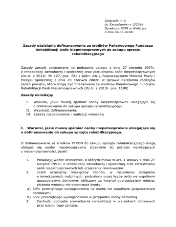 Załącznik nr 2 do Zarządzenia nr 3/2014 Dyrektora PCPR w Wieliczce z dnia 04.03.2014r. Zasady udzielania dofinansowania ze środków Państwowego Funduszu Rehabilitacji Osób Niepełnosprawnych do zakupu sprzętu rehabilitacyjnego Zasady zostały opracowane na podstawie ustawy z dnia 27 sierpnia 1997r. o rehabilitacji zawodowej i społecznej oraz zatrudnianiu osób niepełnosprawnych (Dz.U. z 2011r. Nr 127, poz. 721 z późn. zm.), Rozporządzenie Ministra Pracy i Polityki Społecznej z dnia 25 czerwca 2002r. w sprawie określenia rodzajów zadań powiatu, które mogą być finansowane ze środków Państwowego Funduszu Rehabilitacji Osób Niepełnosprawnych (Dz.U. z 2013r. poz. 1190) Zasady określają: I. Warunki, jakie muszą spełniać osoby niepełnosprawne ubiegające się o dofinansowanie do zakupu sprzętu rehabilitacyjnego. II. Wysokość dofinansowania. III. Zasady rozpatrywania i realizacji wniosków. I. Warunki, jakie muszą spełniać osoby niepełnosprawne ubiegające się o dofinansowanie do zakupu sprzętu rehabilitacyjnego. O dofinansowanie ze środków PFRON do zakupu sprzętu rehabilitacyjnego mogą ubiegać się osoby niepełnosprawne stosownie do potrzeb wynikających z niepełnosprawności, jeżeli: 1. 2. a) b) 3. Posiadają ważne orzeczenie, o którym mowa w art. 1 ustawy z dnia 27 sierpnia 1997r. o rehabilitacji zawodowej i społecznej oraz zatrudnianiu osób niepełnosprawnych lub orzeczenia równoważne. Jeżeli przeciętny miesięczny dochód, w rozumieniu przepisów o świadczeniach rodzinnych, podzielony przez liczbę osób we wspólnym gospodarstwie domowym obliczony za kwartał poprzedzający miesiąc złożenia wniosku nie przekracza kwoty: 50% przeciętnego wynagrodzenia na osobę we wspólnym gospodarstwie domowym; 65% przeciętnego wynagrodzenia w przypadku osoby samotnej. Zachodzi potrzeba prowadzenia rehabilitacji w warunkach domowych przy użyciu tego sprzętu. 4. O dofinansowanie ze środków PFRON do zakupu sprzętu rehabilitacyjnego mogą ubiegać się jeden raz w roku osoby fizyczne prowadzące działalność gospodarczą, osoby prawne i jednostki organizacyjne nie posiadające osobowości prawnej, jeżeli prowadzą działalność związaną z rehabilitacją osób niepełnosprawnych przez okres co najmniej 2 lat przed dniem złożenia wniosku oraz udokumentują posiadanie środków własnych lub pozyskanych z innych źródeł na sfinansowanie przedsięwzięcia w wysokości nie objętej dofinansowaniem ze środków Funduszu. 5. Osoba niepełnosprawna ubiegająca się o dofinansowanie ze środków PFRON do zakupu sprzętu rehabilitacyjnego składa wniosek w Powiatowym Centrum Pomocy Rodzinie w Wieliczce wraz z poniższymi załącznikami: kopia aktualnego orzeczenia o niepełnosprawność (oryginał do wglądu), zaświadczenie lekarskie wydane dla potrzeb przyznania dofinansowania do zakupu sprzętu rehabilitacyjnego, wypełnione przez lekarza specjalistę np. ortopedę, reumatologa, neurologa, ważne jeden miesiąc od dnia wystawienia. Faktura pro – forma, oferta cenowa wystawiona na wnioskodawcę. Zaświadczenie o dochodach netto Wnioskodawcy i osób prowadzących wspólne gospodarstwo domowe, potwierdzające złożone we wniosku oświadczenie o dochodach. Pełnomocnictwo lub postanowienie sądu (jeżeli ustanowiono pełnomocnika lub opiekuna prawnego). a) b) c) d) e) II. Wysokość dofinansowania: 1. Wysokość dofinansowania ze środków PFRON do zakupu sprzętu rehabilitacyjnego wynosi do 60% kosztów tego sprzętu, nie więcej jednak niż do wysokości pięciokrotnego przeciętnego wynagrodzenia. 2. Wnioskodawca pokrywa ze środków własnych lub pozyskanych z innych źródeł część kosztów w wysokości nie objętej dofinansowaniem ze środków PFRON. 3. Ustala się wysokość maksymalnego dofinansowania do zakupu sprzętu rehabilitacyjnego ze środków PFRON: 60% dofinansowania, nie więcej niż 2 100,00 zł. III. Zasady rozpatrywania i realizacji wniosków: 1. Wnioski wydawane i przyjmowane są w ciągu całego roku kalendarzowego. 2. Wnioski rozpatrywane są w miarę posiadanych środków finansowych do wyczerpania limitu środków przeznaczonych na w/w zadanie w danym roku kalendarzowym. 3. Wnioski o przyznanie dofinansowania ze środków PFRON do zakupu sprzętu rehabilitacyjnego rozpatrywane są w terminie 30 dni od dnia złożenia kompletnego wniosku. 4. Przy rozpatrywaniu wniosku bierze się pod uwagę: a) Stopień i rodzaj niepełnosprawności. b) Uzasadnienie składanego wniosku. 5. W przypadku pozytywnego rozpatrzenia wniosku PCPR wystawia zaświadczenie o wysokości przyznanego dofinansowania. 6. W przypadku negatywnego rozpatrzenia wniosku wnioskodawca otrzymuje decyzję wraz z uzasadnieniem odmowy. 7. Podstawę dofinansowania ze środków Funduszu stanowi umowa. Środki Funduszu przekazywane są zgodnie z warunkami określonymi w umowie. 8. Przedłożone dokumenty rozliczeniowe podlegają weryfikacji pod względem zgodności z wnioskiem, uzgodnionym kosztem i zakresem oraz podpisaną umową. 9. Dofinansowanie nie może obejmować kosztów realizacji zadania poniesionych przed przyznaniem środków finansowych i zawarciem umowy o dofinansowanie ze środków Funduszu. 10. Przekroczenie kosztów ponad wysokość przyznanego dofinansowania Wnioskodawca pokrywa ze środków własnych lub pozyskanych z innych źródeł 11. Wnioski rozpatrzone negatywnie z powodu braku środków finansowych nie przechodzą do realizacji w roku następnym. 12. Kwota dofinansowania przekazywana jest na konto wskazane przez wnioskodawcę. Katalog sprzętu rehabilitacyjnego objętego dofinansowaniem ze środków PFRON: 1. 2. 3. 4. 5. 6. Rower rehabilitacyjny stacjonarny Trenażer eliptyczny (orbitrek) Materac rehabilitacyjny Urządzenie do hydromasażu ozonoterapii Atlas do ćwiczeń Drobny sprzęt rehabilitacyjny (np. piłki rehabilitacyjne, wałki, kliny, maty rehabilitacyjne). 13. W przypadku złożenia wniosku o dofinansowanie sprzętu rehabil