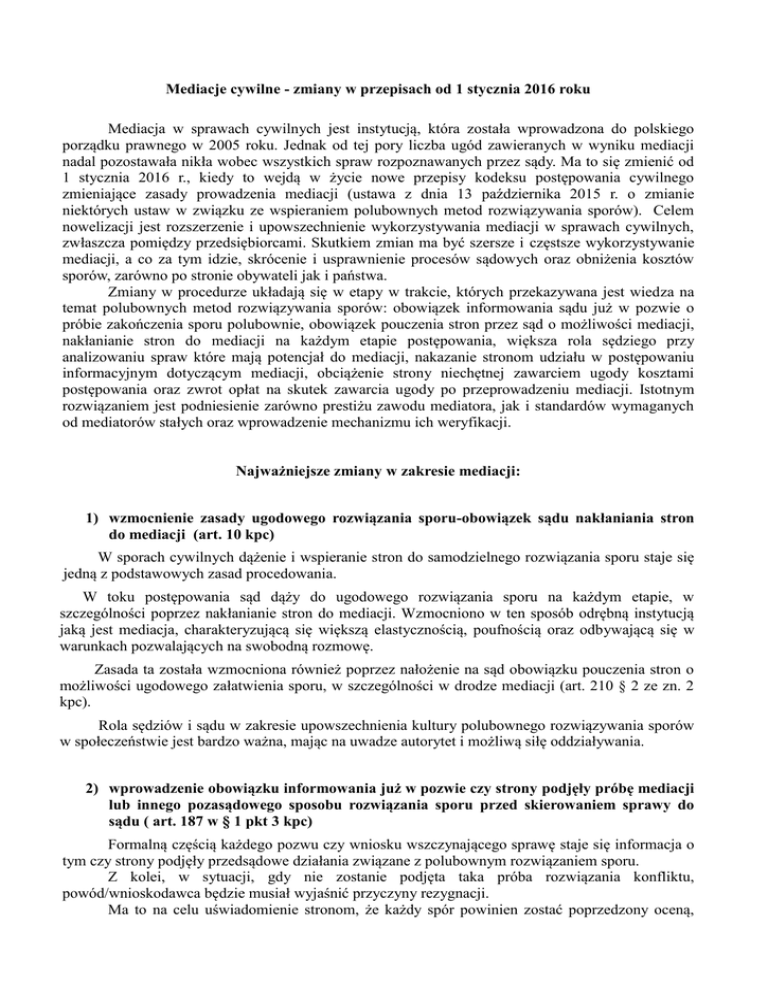 Mediacje cywilne - zmiany w przepisach od 1 stycznia 2016 roku Mediacja w sprawach cywilnych jest instytucją, która została wprowadzona do polskiego porządku prawnego w 2005 roku. Jednak od tej pory liczba ugód zawieranych w wyniku mediacji nadal pozostawała nikła wobec wszystkich spraw rozpoznawanych przez sądy. Ma to się zmienić od 1 stycznia 2016 r., kiedy to wejdą w życie nowe przepisy kodeksu postępowania cywilnego zmieniające zasady prowadzenia mediacji (ustawa z dnia 13 października 2015 r. o zmianie niektórych ustaw w związku ze wspieraniem polubownych metod rozwiązywania sporów). Celem nowelizacji jest rozszerzenie i upowszechnienie wykorzystywania mediacji w sprawach cywilnych, zwłaszcza pomiędzy przedsiębiorcami. Skutkiem zmian ma być szersze i częstsze wykorzystywanie mediacji, a co za tym idzie, skrócenie i usprawnienie procesów sądowych oraz obniżenia kosztów sporów, zarówno po stronie obywateli jak i państwa. Zmiany w procedurze układają się w etapy w trakcie, których przekazywana jest wiedza na temat polubownych metod rozwiązywania sporów: obowiązek informowania sądu już w pozwie o próbie zakończenia sporu polubownie, obowiązek pouczenia stron przez sąd o możliwości mediacji, nakłanianie stron do mediacji na każdym etapie postępowania, większa rola sędziego przy analizowaniu spraw które mają potencjał do mediacji, nakazanie stronom udziału w postępowaniu informacyjnym dotyczącym mediacji, obciążenie strony niechętnej zawarciem ugody kosztami postępowania oraz zwrot opłat na skutek zawarcia ugody po przeprowadzeniu mediacji. Istotnym rozwiązaniem jest podniesienie zarówno prestiżu zawodu mediatora, jak i standardów wymaganych od mediatorów stałych oraz wprowadzenie mechanizmu ich weryfikacji. Najważniejsze zmiany w zakresie mediacji: 1) wzmocnienie zasady ugodowego rozwiązania sporu-obowiązek sądu nakłaniania stron do mediacji (art. 10 kpc) W sporach cywilnych dążenie i wspieranie stron do samodzielnego rozwiązania sporu staje się jedną z podstawowych zasad procedowania. W toku postępowania sąd dąży do ugodowego rozwiązania sporu na każdym etapie, w szczególności poprzez nakłanianie stron do mediacji. Wzmocniono w ten sposób odrębną instytucją jaką jest mediacja, charakteryzującą się większą elastycznością, poufnością oraz odbywającą się w warunkach pozwalających na swobodną rozmowę. Zasada ta została wzmocniona również poprzez nałożenie na sąd obowiązku pouczenia stron o możliwości ugodowego załatwienia sporu, w szczególności w drodze mediacji (art. 210 § 2 ze zn. 2 kpc). Rola sędziów i sądu w zakresie upowszechnienia kultury polubownego rozwiązywania sporów w społeczeństwie jest bardzo ważna, mając na uwadze autorytet i możliwą siłę oddziaływania. 2) wprowadzenie obowiązku informowania już w pozwie czy strony podjęły próbę mediacji lub innego pozasądowego sposobu rozwiązania sporu przed skierowaniem sprawy do sądu ( art. 187 w § 1 pkt 3 kpc) Formalną częścią każdego pozwu czy wniosku wszczynającego sprawę staje się informacja o tym czy strony podjęły przedsądowe działania związane z polubownym rozwiązaniem sporu. Z kolei, w sytuacji, gdy nie zostanie podjęta taka próba rozwiązania konfliktu, powód/wnioskodawca będzie musiał wyjaśnić przyczyny rezygnacji. Ma to na celu uświadomienie stronom, że każdy spór powinien zostać poprzedzony oceną, czy sprawa może zostać zakończona polubownie, a także ułatwić sędziemu podjęcie decyzji o skierowaniu stron na spotkanie informacyjne i/lub do mediacji w toku postępowania sądowego. 3) wzmocnienie obowiązku informowania przez sąd o możliwości skierowania sprawy do mediacji, szczególnie na wstępnym etapie postępowania ( art. 183 ze zn. 8 kpc) Sąd będzie mógł skierować strony do mediacji na każdym etapie sprawy a także więcej niż raz w toku postępowania. Zmiana ta umożliwia sądowi podjęcie racjonalnej decyzji uwzględniającej okoliczności konkretnej sprawy. Do mediacji strony będą kierowane w sytuacji, gdy w sposób oczywisty sprzyjało to będzie ugodowemu załatwieniu sprawy. Postanowienie kierujące strony do mediacji może być wydane na posiedzeniu niejawnym. Mediacji nie prowadzi się, jeżeli strona w terminie tygodnia od dnia ogłoszenia lub doręczenia jej postanowienia kierującego strony do mediacji nie wyraziła zgody na mediację. Przewodniczący może wezwać strony do udziału w spotkaniu informacyjnym dotyczącym polubownych metod rozwiązywania sporów, w szczególności mediacji. Takie spotkanie może prowadzić sędzia, referendarz sądowy, urzędnik sądowy, asystent sędziego lub stały mediator. Spotkanie informacyjne ma stanowi dodatkową formę zachęcenia do mediacji lub wyboru innego rodzaju metody pozasądowego rozwiązywania sporów. Sposób przeprowadzenia spotkań informacyjnych może być zróżnicowany i zależeć od indywidualnych możliwości organizacyjnych w poszczególnych sądach. Przed pierwszym posiedzeniem wyznaczonym na rozprawę przewodniczący dokonuje oceny czy skierować strony do mediacji. W tym celu przewodniczący, jeżeli zachodzi potrzeba wysłuchania stron, może wezwać je do osobistego stawiennictwa na posiedzeniu niejawnym. Taka zmiana eksponuje sędziowski obowiązek dokonania, w każdym indywidualnym przypadku, wszechstronnej oceny, czy sprawa nadaje się do mediacji i czy mediacja może pomóc stronom w polubownym rozwiązaniu sporu. W ten również sposób sędzia uzyskuje możliwość osobistego zachęcenia stron do mediacji. 4) uporządkowanie kwestii proceduralnych dotyczących mediacji (art. 183 ze zn. 9 kpc) Strony uzyskują pierwszeństwo przy wyborze mediatora, który będzie mógł zapoznać się z aktami sprawy zaraz po przystąpieniu stron do mediacji. Dane kontaktowe stron sąd przekazuje mediatorowi w jak najkrótszym czasie, dzięki czemu mediacja zostanie przeprow