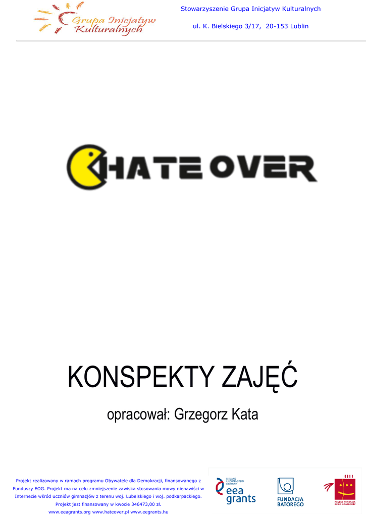 Stowarzyszenie Grupa Inicjatyw Kulturalnych ul. K. Bielskiego 3/17, 20-153 Lublin KONSPEKTY ZAJĘĆ opracował: Grzegorz Kata Projekt realizowany w ramach programu Obywatele dla Demokracji, finansowanego z Funduszy EOG. Projekt ma na celu zmniejszenie zawiska stosowania mowy nienawiści w Internecie wśród uczniów gimnazjów z terenu woj. Lubelskiego i woj. podkarpackiego. Projekt jest finansowany w kwocie 346473,00 zł. www.eeagrants.org www.hateover.pl www.eegrants.hu Stowarzyszenie Grupa Inicjatyw Kulturalnych ul. K. Bielskiego 3/17, 20-153 Lublin WSTĘP W porównaniu ze światem nastolatków sprzed kilkudziesięciu lat codzienne życie współczesnych nastolatków jest znacznie bogatsze: to już nie tylko rodzinne spotkania, chodzenie do szkoły i wyjścia z kolegami, ale także maile, facebook, fora internetowe, blogi i smsy. Wszystkie trudności i problemy, z którymi młodzi ludzie stykają się na co dzień, pojawiają się także w świecie wirtualnym. O ile jednak w rodzinie czy w szkole zazwyczaj znajdzie się odpowiedzialny dorosły, który czuwa nad działaniami młodzieży, o tyle w przypadku nowych mediów ta kontrola jest znacznie ograniczona. Z tego powodu niezwykle ważne jest uczenie nastolatków właściwego i bezpiecznego poruszania się w świecie cyfrowych mediów. Wyzwań stojących przed młodymi ludźmi jest wiele: bezpieczeństwo, stawianie granic, radzenie sobie z agresją… Poniższy program podzielony jest na trzy łączące się ze sobą tematycznie moduły: komunikację, asertywność i cyberprzemoc. Program skierowany jest głównie na uczenie umiejętności, które pomogą młodzieży radzić sobie z mową nienawiści – bardziej dojrzale funkcjonować w świecie, zwłaszcza tym, który jest bliski współczesnym nastolatkom: internetowym świecie maili, portali społecznościowych i komentarzy pod fotografiami. Te same umiejętności będą jednak przydatne także we wszystkich innych sytuacjach, które wymagają współdziałania z innymi ludźmi: dzieleniu pokoju z rodzeństwem, negocjacjach z rodzicami czy przekładaniu sprawdzianu. Forma zajęć ma umożliwiać młodzieży jak najaktywniejsze i twórcze podejście do omawianych tematów. Scenariusze skonstruowane są w taki sposób, by zachęcać do dzielenia się własnymi przemyśleniami i doświadczeniami. Każdy ze scenariuszy oparto na cyklu Kolba (por. Koźmiński, Jamielniak, 2008): w początkowej fazie młodzi ludzie najpierw działają i angażują się, korzystając z już zdobytej wiedzy lub radząc sobie w całkowicie nowych okolicznościach. Drugi etap to ćwiczenia mające inspirować do wyciągania wniosków i dzielenia się przemyśleniami z innymi. W kolejnej, trzeciej części zajęć, należy ustalać nowe, adekwatne reguły postępowania po to, by w części czwartej włączać je do działania w codziennym życiu. praktyka zastosowanie doświadczenie refleksja Rys. 1 Cykl Kolba (Koźmiński, Jamielniak, 2008) Projekt realizowany w ramach programu Obywatele dla Demokracji, finansowanego z Funduszy EOG. Projekt ma na celu zmniejszenie zawiska stosowania mowy nienawiści w Internecie wśród uczniów gimnazjów z terenu woj. Lubelskiego i woj. podkarpackiego. Projekt jest finansowany w kwocie 346473,00 zł. www.eeagrants.org www.hateover.pl www.eegrants.hu Stowarzyszenie Grupa Inicjatyw Kulturalnych ul. K. Bielskiego 3/17, 20-153 Lublin Prawidłowo przeprowadzone zajęcia będą miały charakter psychoprofilaktyczny (pierwszo- lub drugorzędowy), obejmując swoim działaniem strategię informacyjną i edukacyjną. Ze względu na specyfikę zajęć i wykorzystanie aktywnych metod nauczania w scenariuszach należy pamiętać, że: - jedynym właściwym sposobem prowadzenia zajęć jest prowadzenie ich w kręgu: każdy z uczestników (także nauczyciel) powinien zajmować takie samo miejsce i dobrze widzieć innych. Taka organizacja przestrzeni wskazuje na równość opinii uczestników, pozwala na zwiększenie bliskości i zaufania, ułatwia większą rotację podczas tworzenia grup zadaniowych oraz wychodzenie z przypisanych ról klasowych. Niedopuszczalne jest wstawianie wewnątrz kręgu stołów lub (co gorsza) prowadzenie zajęć w ławkach. - konspekty przygotowane są dla przeciętnie funkcjonujących klas. Jeśli uczniowie z jakiegoś powodu przeżywają w klasie kryzys lub poważny konflikt, lub jeśli któryś z uczniów przejawia daleko idące zachowania dysfunkcjonalne, konspekty należy zmodyfikować według własnego wyczucia wychowawczego. Pomocne może być zmniejszenie ilości ćwiczeń, rezygnacja z trudniejszych zadań lub wydłużenie czasu realizacji poszczególnych części konspektu. W skrajnych przypadkach należy najpierw rozwiązać kryzysową sytuację a dopiero później przystąpić do realizacji konspektów z poniższego programu. Wyjątkiem mogą być sytuacje, które bezpośrednio dotyczą poruszanych w scenariuszach problemów. - ważniejsze od precyzyjnego wykonania opisu ćwiczeń jest zachowanie celu zajęć i praca na własnych doświadczeniach uczniów. Specyfika problemów i doświadczeń młodzieży może być różna w zależności od ich wieku, miejsca zamieszkania, sytuacji rodzinnej – kluczowe jest wykorzystanie ich wiedzy i aktywności. - przed przeprowadzeniem zajęć należy zapoznać się z krótkimi informacjami dotyczącymi omawianego działu. Zostały tam zebrane wszystkie potrzebne do omówienia ćwiczeń definicje i wiadomości. - wszelkie pomoce do projektu opracowane zostały ze szczególnym uwzględnieniem autentyczności i specyfiki funkcjonowania współczesnej młodzieży. Dołożono starań, aby użyty język był zbliżony do tego, jakim posługują się młodzi ludzie, a problemy – jak najbardziej autentyczne. W niektórych przypadkach wiąże się to z użyciem słów uznanych powszechnie za obraźliwe, kolokwializmów, itp. Jeśli prowadzący uważa, że w tym zakresie należy dokonać zmian – ma do tego prawo. 