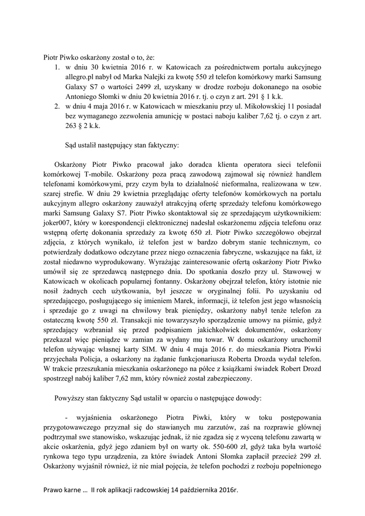 Piotr Piwko oskarżony został o to, że: 1. w dniu 30 kwietnia 2016 r. w Katowicach za pośrednictwem portalu aukcyjnego allegro.pl nabył od Marka Nalejki za kwotę 550 zł telefon komórkowy marki Samsung Galaxy S7 o wartości 2499 zł, uzyskany w drodze rozboju dokonanego na osobie Antoniego Słomki w dniu 20 kwietnia 2016 r. tj. o czyn z art. 291 § 1 k.k. 2. w dniu 4 maja 2016 r. w Katowicach w mieszkaniu przy ul. Mikołowskiej 11 posiadał bez wymaganego zezwolenia amunicję w postaci naboju kaliber 7,62 tj. o czyn z art. 263 § 2 k.k. Sąd ustalił następujący stan faktyczny: Oskarżony Piotr Piwko pracował jako doradca klienta operatora sieci telefonii komórkowej T-mobile. Oskarżony poza pracą zawodową zajmował się również handlem telefonami komórkowymi, przy czym była to działalność nieformalna, realizowana w tzw. szarej strefie. W dniu 29 kwietnia przeglądając oferty telefonów komórkowych na portalu aukcyjnym allegro oskarżony zauważył atrakcyjną ofertę sprzedaży telefonu komórkowego marki Samsung Galaxy S7. Piotr Piwko skontaktował się ze sprzedającym użytkownikiem: joker007, który w korespondencji elektronicznej nadesłał oskarżonemu zdjęcia telefonu oraz wstępną ofertę dokonania sprzedaży za kwotę 650 zł. Piotr Piwko szczegółowo obejrzał zdjęcia, z których wynikało, iż telefon jest w bardzo dobrym stanie technicznym, co potwierdzały dodatkowo odczytane przez niego oznaczenia fabryczne, wskazujące na fakt, iż został niedawno wyprodukowany. Wyrażając zainteresowanie ofertą oskarżony Piotr Piwko umówił się ze sprzedawcą następnego dnia. Do spotkania doszło przy ul. Stawowej w Katowicach w okolicach popularnej fontanny. Oskarżony obejrzał telefon, który istotnie nie nosił żadnych cech użytkowania, był jeszcze w oryginalnej folii. Po uzyskaniu od sprzedającego, posługującego się imieniem Marek, informacji, iż telefon jest jego własnością i sprzedaje go z uwagi na chwilowy brak pieniędzy, oskarżony nabył tenże telefon za ostateczną kwotę 550 zł. Transakcji nie towarzyszyło sporządzenie umowy na piśmie, gdyż sprzedający wzbraniał się przed podpisaniem jakichkolwiek dokumentów, oskarżony przekazał więc pieniądze w zamian za wydany mu towar. W domu oskarżony uruchomił telefon używając własnej karty SIM. W dniu 4 maja 2016 r. do mieszkania Piotra Piwki przyjechała Policja, a oskarżony na żądanie funkcjonariusza Roberta Drozda wydał telefon. W trakcie przeszukania mieszkania oskarżonego na półce z książkami świadek Robert Drozd spostrzegł nabój kaliber 7,62 mm, który również został zabezpieczony. Powyższy stan faktyczny Sąd ustalił w oparciu o następujące dowody: - wyjaśnienia oskarżonego Piotra Piwki, który w toku postępowania przygotowawczego przyznał się do stawianych mu zarzutów, zaś na rozprawie głównej podtrzymał swe stanowisko, wskazując jednak, iż nie zgadza się z wyceną telefonu zawartą w akcie oskarżenia, gdyż jego zdaniem był on warty ok. 550-600 zł, gdyż taka była wartość rynkowa tego typu urządzenia, za które świadek Antoni Słomka zapłacił przecież 299 zł. Oskarżony wyjaśnił również, iż nie miał pojęcia, że telefon pochodzi z rozboju popełnionego Prawo karne … II rok aplikacji radcowskiej 14 października 2016r. na osobie Antoniego Słomki, był bowiem przekonany, iż jest to telefon stanowiący własność sprzedającego mężczyzny o imieniu Marek, o czym ten go zapewniał. Odnośnie posiadanego przez siebie naboju oskarżony Piotr Piwko wyjaśnił, iż jest to pamiątka, jaką dostał od kolegi – zawodowego żołnierza Jacka Zmyski, z którym przyjaźnił się od dzieciństwa, a który zginął w Karbali w trakcie pełnienia służby wojskowej w ramach misji stabilizacyjnej w Iraku. Oskarżony dodał, iż nie miał świadomości, że posiadanie naboju jest nielegalne i stanowi przestępstwo. - zeznania Antoniego Słomki, który wskazał, iż w dniu 20 kwietnia 2016 r. zawarł umowę o świadczenie usług telekomunikacyjnych z siecią T-mobile, w ramach której nabył również telefon komórkowy marki Samsung Galaxy S7 za kwotę promocyjną 299 zł. Tego samego dnia wracając do domu wstąpił do baru przy ul. Słowackiego, gdzie bawiąc się telefonem wypił kilka piw. Gdy wychodził z baru podbiegł do niego jakiś mężczyzna, przewrócił go i wyrwał z rąk reklamówkę, w której Antoni Słomka miał zarówno telefon jak i wszystkie dokumenty otrzymane od operatora. Kiedy Antoni Słomka wstał mężczyzny już nie było, dlatego poprosił barmankę o wezwanie Policji. Następnego dnia Antoni Słomka zgłosił się w Komisariacie I Policji w Katowicach, złożył tam zeznania i dołączył do akt sprawy duplikat dokumentacji uzyskanej od operatora. Świadek nie był w stanie opisać wyglądu napastnika, gdyż całe zdarzenie rozegrało się zbyt szybko. Świadek wskazał również, iż przy okazji uzyskania duplikatów dokumentów zastrzegł swój telefon jako skradziony w systemie komputerowym operatora. - zeznania Marka Nalejki, który wskazał, iż jest użytkownikiem portalu allegro.pl i posługuje się nickiem joker007. Świadek potwierdził, iż w dniu 30 kwietnia 2016 r. sprzedał oskarżonemu Piotrowi Piwko telefon komórkowy marki Samsung Galaxy S7 za kwotę około 500 zł. Świadek wskazał, iż telefon ten kupił od jakiegoś młodego chłopaka, którego spotkał pod salonem gier „Las Vegas” przy ul. Warszawskiej w Katowicach za kwotę 150 zł. Marek Nalejko nigdy wcześniej ani później tego chłopaka nie widział, ale skusiła go okazja, bo widział, że telefon oferowany do sprzedaży jest praktycznie nowy. Telefon ten nie miał pudełka a chłopak dysponował jedynie ładowarką. - zeznania Roberta Drozda, który wskazał, iż uczestniczył w zatrzymaniu oskarżonego Piotra Piwko, po tym jak operator sieci telefonicznej T-mobile poinformował organy ścigania, iż telefon komór
