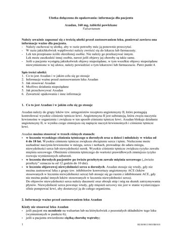 Ulotka dołączona do opakowania: informacja dla pacjenta Axudan, 160 mg, tabletki powlekane Valsartanum Należy uważnie zapoznać się z treścią ulotki przed zastosowaniem leku, ponieważ zawiera ona informacje ważne dla pacjenta. - Należy zachować tę ulotkę, aby w razie potrzeby móc ją ponownie przeczytać. - W razie jakichkolwiek wątpliwości należy zwrócić się do lekarza lub farmaceuty. - Lek ten przepisano ściśle określonej osobie. Nie należy go przekazywać innym. Lek może zaszkodzić innej osobie, nawet jeśli objawy jej choroby są takie same. - Jeśli u pacjenta wystąpią jakiekolwiek objawy niepożądane, w tym wszelkie objawy niepożądane niewymienione w tej ulotce, należy powiedzieć o tym lekarzowi lub farmaceucie. Patrz punkt 4. Spis treści ulotki: 1. Co to jest Axudan i w jakim celu się go stosuje 2. Informacje ważne przed zastosowaniem leku Axudan 3. Jak stosować Axudan 4. Możliwe działania niepożądane 5. Jak przechowywać Axudan 6. Zawartość opakowania i inne informacje 1. Co to jest Axudan i w jakim celu się go stosuje Axudan należy do grupy leków tzw. antagonistów receptora angiotensyny II, które pomagają kontrolować wysokie ciśnienie tętnicze krwi. Angiotensyna II jest substancją, która zwęża naczynia krwionośne w organizmie i zwiększa w ten sposób ciśnienie tętnicze krwi. Axudan blokuje działanie angiotensyny II, w wyniku czego zmniejsza się napięcie naczyń krwionośnych i ciśnienie tętnicze krwi. Axudan można stosować w trzech różnych stanach: w leczeniu wysokiego ciśnienia tętniczego u dorosłych oraz u dzieci i młodzieży w wieku od 6 do 18 lat. Wysokie ciśnienie tętnicze zwiększa obciążenie serca i tętnic. Nieleczone może uszkadzać naczynia krwionośne w mózgu, sercu i nerkach, prowadząc do udaru mózgu, niewydolności serca lub niewydolności nerek. Wysokie ciśnienie tętnicze zwiększa ryzyko zawału mięśnia sercowego. Obniżenie ciśnienia tętniczego do wartości prawidłowych zmniejsza ryzyko rozwoju wymienionych zaburzeń. w leczeniu dorosłych pacjentów po świeżo przebytym zawale mięśnia sercowego („świeżo przebyty” oznacza tu od 12 godzin do 10 dni). w leczeniu objawowej niewydolności serca u dorosłych. Axudan stosuje się wtedy, gdy nie można zastosować leku z grupy tzw. inhibitorów konwertazy angiotensyny ACE (leków stosowanych w leczeniu niewydolności serca) lub stosuje się go razem z inhibitorami ACE, gdy nie można podać innych leków stosowanych w leczeniu niewydolności serca). Do objawów niewydolności serca należy duszność oraz obrzęk stóp i nóg na skutek zatrzymywania płynów. Niewydolność serca powstaje wtedy, gdy mięsień sercowy nie jest w stanie wystarczająco silnie pompować krwi, aby dostarczyć ją do całego organizmu. 2. Informacje ważne przed zastosowaniem leku Axudan Kiedy nie stosować leku Axudan jeśli pacjent ma uczulenie na walsartan lub na którykolwiek z pozostałych składników tego leku (wymienionych w punkcie 6); jeśli u pacjenta stwierdzono ciężką chorobę wątroby; 1 SE/H/0813/003/IB/018 jeśli pacjentka jest w ciąży dłużej niż 3 miesiące (we wczesnym okresie ciąży również lepiej nie przyjmować leku Axudan – patrz punkt poświęcony ciąży); jeśli pacjent ma cukrzycę lub zaburzenia czynności nerek i przyjmuje lek zmniejszający ciśnienie tętnicze krwi, zawierający aliskiren. Jeśli którakolwiek z powyższych sytuacji dotyczy pacjenta, nie należy przyjmować leku Axudan. Ostrzeżenia i środki ostrożności Przed rozpoczęciem przyjmowania leku Axudan należy omówić to z lekarzem, jeśli: pacjent ma chorobę wątroby pacjent ma ciężką chorobę nerek lub jest poddawany dializie pacjent ma zwężenie tętnicy nerkowej pacjent przebył niedawno zabieg przeszczepienia nerki (otrzymał nową nerkę) pacjent przebył zawał mięśnia sercowego lub ma niewydolność serca; lekarz może kontrolować czynność jego nerek. pacjent ma ciężką chorobę serca (inną niż niewydolność serca lub zawał mięśnia sercowego) kiedykolwiek podczas stosowania innych leków (w tym inhibitorów ACE) wystąpił u pacjenta obrzęk języka i twarzy (tzw. obrzęk naczynioruchowy) na skutek reakcji alergicznej. Jeśli takie objawy wystąpią podczas stosowania leku Axudan, należy natychmiast przerwać jego przyjmowanie i już nigdy więcej go nie stosować. Patrz także punkt 4 „Możliwe działania niepożądane”. pacjent przyjmuje leki, które zwiększają ilość potasu we krwi. Należą do nich suplementy potasu lub zamienniki soli kuchennej zawierające potas, leki oszczędzające potas i heparyna. Może być konieczne regularne kontrolowanie ilości potasu we krwi. pacjent ma mniej niż 18 lat i przyjmuje Axudan w skojarzeniu z innymi lekami, które hamują układ renina-angiotensyna-aldosteron (leki obniżające ciśnienie tętnicze krwi), lekarz może zalecić regularne kontrolowanie czynności nerek pacjenta i stężenia potasu we krwi. u pacjenta stwierdzono hiperaldosteronizm – chorobę, w której nadnercza wytwarzają za dużo hormonu aldosteronu. W takim przypadku stosowanie leku Axudan nie jest zalecane. pacjent utracił dużą ilość płynów (odwodnienie) na skutek biegunki, wymiotów lub przyjmowania dużych dawek leków moczopędnych pacjentka jest w ciąży (lub może zajść w ciążę), konieczne jest poinformowanie o tym lekarza. Axudan nie jest zalecany we wczesnej ciąży i przeciwwskazany po 3. miesiącu ciąży, gdyż jego stosowanie w tym czasie może być bardzo szkodliwe dla dziecka (patrz punkt dotyczący ciąży) pacjent przyjmuje którykolwiek z poniższych leków stosowanych w leczeniu wysokiego ciśnienia tętniczego krwi: - inhibitor ACE (np. enalapryl, lizynopryl, ramipryl), zwłaszcza jeśli pacjent ma chorobę nerek spowodowaną cukrzycą - aliskiren przyjmuje inhibitor ACE razem z niektórymi innymi lekami stosowanymi w leczeniu niewydolności serca - tzw. anta