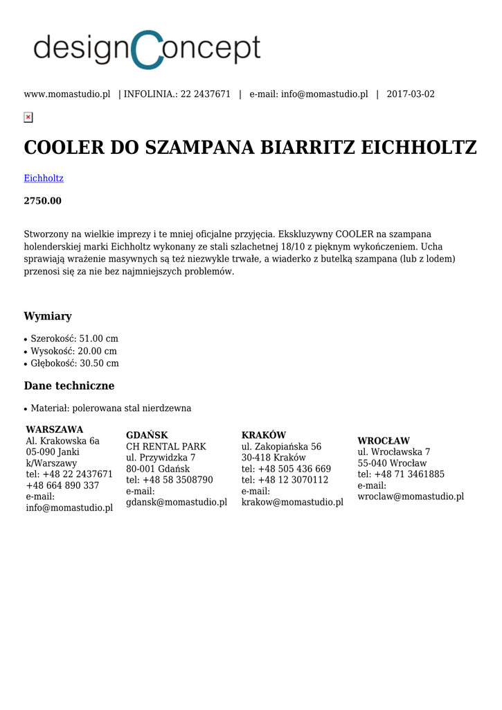www.momastudio.pl | INFOLINIA.: 22 2437671 | e-mail: [email protected] | 2017-03-02 COOLER DO SZAMPANA BIARRITZ EICHHOLTZ Eichholtz 2750.00 Stworzony na wielkie imprezy i te mniej oficjalne przyjęcia. Ekskluzywny COOLER na szampana holenderskiej marki Eichholtz wykonany ze stali szlachetnej 18/10 z pięknym wykończeniem. Ucha sprawiają wrażenie masywnych są też niezwykle trwałe, a wiaderko z butelką szampana (lub z lodem) przenosi się za nie bez najmniejszych problemów. Wymiary ● ● ● Szerokość: 51.00 cm Wysokość: 20.00 cm Głębokość: 30.50 cm Dane techniczne ● Materiał: polerowana stal nierdzewna WARSZAWA Al. Krakowska 6a 05-090 Janki k/Warszawy tel: +48 22 2437671 +48 664 890 337 e-mail: [email protected] GDAŃSK CH RENTAL PARK ul. Przywidzka 7 80-001 Gdańsk tel: +48 58 3508790 e-mail: [email protected] KRAKÓW ul. Zakopiańska 56 30-418 Kraków tel: +48 505 436 669 tel: +48 12 3070112 e-mail: [email protected] WROCŁAW ul. Wrocławska 7 55-040 Wrocław tel: +48 71 3461885 e-mail: [email protected]