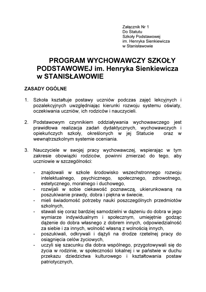 Załącznik Nr 1 Do Statutu Szkoły Podstawowej im. Henryka Sienkiewicza w Stanisławowie PROGRAM WYCHOWAWCZY SZKOŁY PODSTAWOWEJ im. Henryka Sienkiewicza w STANISŁAWOWIE ZASADY OGÓLNE 1. Szkoła kształtuje postawy uczniów podczas zajęć lekcyjnych i pozalekcyjnych uwzględniając kierunki rozwoju systemu oświaty, oczekiwania uczniów, ich rodziców i nauczycieli. 2. Podstawowym czynnikiem oddziaływania wychowawczego jest prawidłowa realizacja zadań dydaktycznych, wychowawczych i opiekuńczych szkoły, określonych w jej Statucie oraz w wewnątrzszkolnym systemie oceniania. 3. Nauczyciele w swojej pracy wychowawczej, wspierając w tym zakresie obowiązki rodziców, powinni zmierzać do tego, aby uczniowie w szczególności: - - znajdowali w szkole środowisko wszechstronnego rozwoju intelektualnego, psychicznego, społecznego, zdrowotnego, estetycznego, moralnego i duchowego, rozwijali w sobie ciekawość poznawczą, ukierunkowaną na poszukiwanie prawdy, dobra i piękna w świecie, mieli świadomość potrzeby nauki poszczególnych przedmiotów szkolnych, stawali się coraz bardziej samodzielni w dążeniu do dobra w jego wymiarze indywidualnym i społecznym, umiejętnie godząc dążenie do dobra własnego z dobrem innych, odpowiedzialność za siebie i za innych, wolność własną z wolnością innych, poszukiwali, odkrywali i dążyli na drodze rzetelnej pracy do osiągnięcia celów życiowych, uczyli się szacunku dla dobra wspólnego, przygotowywali się do życia w rodzinie, w społeczności lokalnej i w państwie w duchu przekazu dziedzictwa kulturowego i kształtowania postaw patriotycznych, - przygotowywali się do rozpoznawania wartości moralnych, kształtowali umiejętność słuchania innych i rozumienia ich poglądów. ZAŁOŻENIA PROGRAMU WYCHOWANIA 1. Wychowanie w naszej szkole ma charakter integralny (obejmuje wszystkie sfery osoby ucznia: fizyczną, psychiczną, duchową i społeczną), personalistyczny (stawia w centrum osobę ucznia), indywidualny (tempo nauczania, wychowania, dobór treści i metod uwzględnia indywidualne możliwości psychofizyczne ucznia). 2. Cała społeczność szkolna organizuje i uczestniczy w akademiach, apelach organizowanych z okazji ważnych wydarzeń historii narodu, regionu i szkoły (np. 1 Września, Dzień Komisji Edukacji Narodowej, Święto Niepodległości, Święto Patrona Szkoły, Międzynarodowy Dzień Dziecka itp.). 3. Szkoła poprzez działalność wychowawczo-dydaktyczną, współpracę z rodzicami i środowiskiem lokalnym wspomaga wszechstronny rozwój ucznia poprzez: • rozbudzanie jego ciekawości poznawczej, • inspirowanie do wyrażania własnych myśli i przeżyć, • uczenie samodzielności w podejmowaniu i rozwiązywaniu zadań, • pobudzanie motywacji do ciągłego uczenia się i samorozwoju, • kształtowanie indywidualnych zdolności twórczych, • uwrażliwianie na piękno, dobro i prawdę, • postępowanie wg norm i zasad moralnych. 4. Uczniowie bardziej sprawni i uzdolnieni pomagają słabszym fizycznie i słabszym w nauce. 5. Zwracamy uwagę, aby sposób zwracania się do siebie był życzliwy i piękny pod względem kulturowym i językowym. 6. Dbamy o zachowanie form grzecznościowych: przepraszam, proszę, dziękuję. 7. Zapoznajemy uczniów z dokumentami szkoły. 8. Upowszechniamy wiedzę na temat praw człowieka, dziecka. Promujemy zachowania potwierdzające poszanowanie praw człowieka. 9. Wzory kultury zachowania i mowy czerpiemy z dziedzictwa kultury, bogactwa i piękna poezji, literatury oraz wzorców osobowych ludzi o wysokim autorytecie moralnym. 10. Staramy się, aby każdy uczeń dbał o własne ciało, rozwijał sprawność fizyczną, uczył się kierować własnym postępowaniem, bronił się przed zagrożeniami niszczącymi zdrowie, jak: nikotyna, narkotyki, alkohol, agresja, cyberprzemoc. 11. Wychowawcy, rodzice i uczniowie tworzą system wzajemnego wspomagania się w sytuacjach życiowo trudnych dla ucznia i jego rodziny, dotyczy to spraw dydaktycznych i materialnych (świadczenie pomocy materialnej o charakterze socjalnym, „Wyprawka szkolna”). 12. Szkoła prowadzi działania zapobiegające wszelkiej dyskryminacji. 13. Szkoła prowadzi dożywianie uczniów, świadczy pomoc materialną i rzeczową uczniom w trudnej sytuacji losowej oraz pomoc psychologiczno-pedagogiczną, logopedyczną i korekcyjno – kompensacyjną („Szklanka mleka”, „Owoce w szkole”, dofinansowanie do obiadów szkolnych). 14. Każda klasa organizuje przynajmniej 1 raz w roku wycieczkę krajoznawczą w celu poznania przyrody, zabytków, kultury okolicy, regionu, kraju. 15. Organizowane są również wyjazdy do kina, teatru czy muzeów. 16. Stosujemy rozluźnienie systemu lekcyjnego przez wycieczki, spotkania z ciekawymi ludźmi, konkursy, apele, przedstawienia, wieczornice, audycje itp. 17. Stwarzamy naszym uczniom możliwość atrakcyjnego spędzania wolnego czasu i rozwoju zainteresowań ( zajęcia rekreacyjno – sportowe, koła przedmiotowe, zainteresowań, dyskoteki klasowe, szkolne itp.) 18. Ciekawe spostrzeżenia, refleksje, zamieszczamy w kronice szkoły. fotografie, reportaże 19. Wychowawcy klas organizują z uczniami „Mikołajki”, ”Wigilie klasowe”, ”Dzień Babci i Dziadka”, „Dzień Matki”. 20. Tradycją szkoły są uroczystości: - pasowanie na ucznia kl. I – ślubowanie uczniów - Andrzejkowe wróżby i zabawy - zabawy z Mikołajem - pasowanie na czytelnika - dzień samorządności - dzień Patrona Szkoły - udział w ogólnopolskich zlotach szkół sienkiewiczowskich - dzień sportu powiązany z Dniem Dziecka - uroczyste zakończenie szkoły podstawowej przez uczniów klas VI. 21. Szkoła gromadzi pamiątki i dokumenty, które dobrowolnie przekazują osoby dorosłe – rodziny lub organizacje. 22. Wychowawcy klas i Samorząd Uczniowski organizują ogniska, dyskoteki. 20. Każdy wychowawca na początku roku szkolnego opracowuje własny program godzin wychowawczych or
