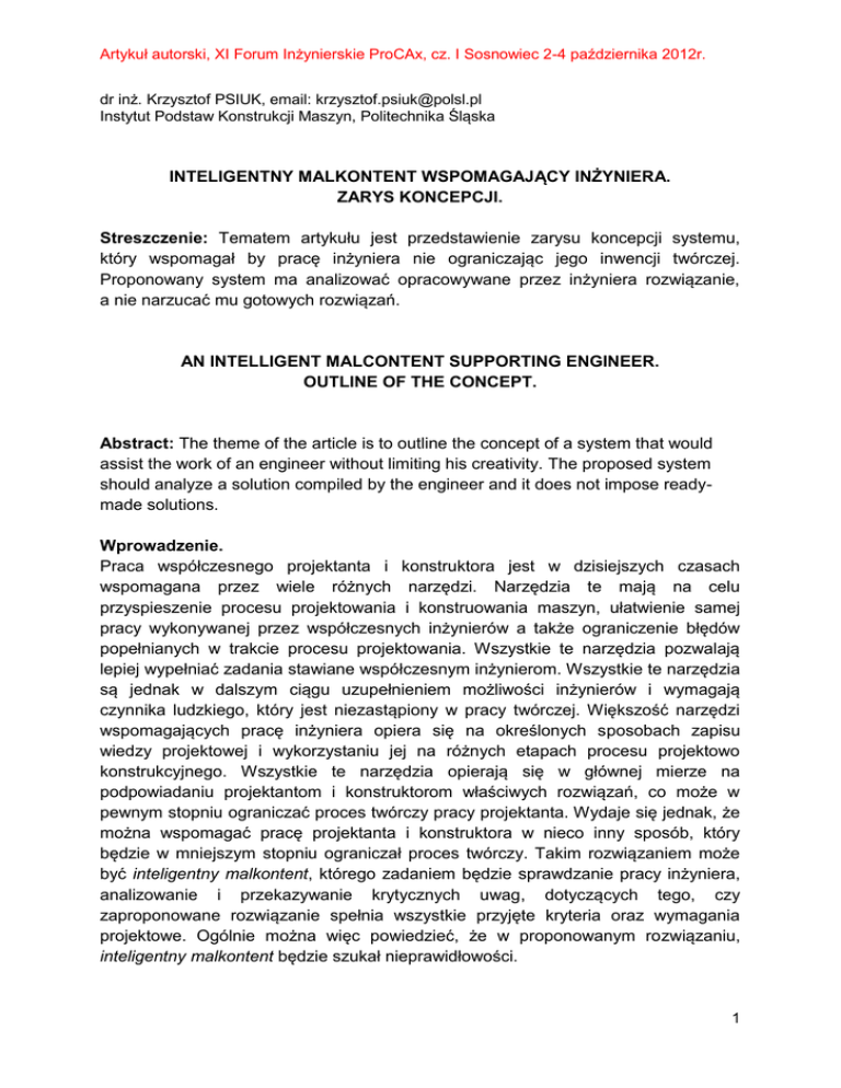 Artykuł autorski, XI Forum Inżynierskie ProCAx, cz. I Sosnowiec 2-4 października 2012r. dr inż. Krzysztof PSIUK, email: [email protected] Instytut Podstaw Konstrukcji Maszyn, Politechnika Śląska INTELIGENTNY MALKONTENT WSPOMAGAJĄCY INŻYNIERA. ZARYS KONCEPCJI. Streszczenie: Tematem artykułu jest przedstawienie zarysu koncepcji systemu, który wspomagał by pracę inżyniera nie ograniczając jego inwencji twórczej. Proponowany system ma analizować opracowywane przez inżyniera rozwiązanie, a nie narzucać mu gotowych rozwiązań. AN INTELLIGENT MALCONTENT SUPPORTING ENGINEER. OUTLINE OF THE CONCEPT. Abstract: The theme of the article is to outline the concept of a system that would assist the work of an engineer without limiting his creativity. The proposed system should analyze a solution compiled by the engineer and it does not impose readymade solutions. Wprowadzenie. Praca współczesnego projektanta i konstruktora jest w dzisiejszych czasach wspomagana przez wiele różnych narzędzi. Narzędzia te mają na celu przyspieszenie procesu projektowania i konstruowania maszyn, ułatwienie samej pracy wykonywanej przez współczesnych inżynierów a także ograniczenie błędów popełnianych w trakcie procesu projektowania. Wszystkie te narzędzia pozwalają lepiej wypełniać zadania stawiane współczesnym inżynierom. Wszystkie te narzędzia są jednak w dalszym ciągu uzupełnieniem możliwości inżynierów i wymagają czynnika ludzkiego, który jest niezastąpiony w pracy twórczej. Większość narzędzi wspomagających pracę inżyniera opiera się na określonych sposobach zapisu wiedzy projektowej i wykorzystaniu jej na różnych etapach procesu projektowo konstrukcyjnego. Wszystkie te narzędzia opierają się w głównej mierze na podpowiadaniu projektantom i konstruktorom właściwych rozwiązań, co może w pewnym stopniu ograniczać proces twórczy pracy projektanta. Wydaje się jednak, że można wspomagać pracę projektanta i konstruktora w nieco inny sposób, który będzie w mniejszym stopniu ograniczał proces twórczy. Takim rozwiązaniem może być inteligentny malkontent, którego zadaniem będzie sprawdzanie pracy inżyniera, analizowanie i przekazywanie krytycznych uwag, dotyczących tego, czy zaproponowane rozwiązanie spełnia wszystkie przyjęte kryteria oraz wymagania projektowe. Ogólnie można więc powiedzieć, że w proponowanym rozwiązaniu, inteligentny malkontent będzie szukał nieprawidłowości. 1 Artykuł autorski, XI Forum Inżynierskie ProCAx, cz. I Sosnowiec 2-4 października 2012r. Systemy wspomagające pracę inżyniera Analizując fazy istnienia wytworu (Rys. 1) można wyróżnić kilka etapów. Pierwszy etap jest związany z analizą potrzeby oraz pracą koncepcyjną związaną ze znalezieniem rozwiązania zaspokajającego daną potrzebę. Drugi etap jest związany z procesem projektowania i konstruowania zadanego środka technicznego, którego ogólna koncepcja została opracowana na poprzednim etapie. Kolejnym etapem jest etap wytworzenia danego środka technicznego, a następnie jego eksploatacja i utylizacja. Na każdym z tych etapów wymagana jest określona wiedza uwzględniająca w czasie projektowania wszystkie fazy istnienia wytworu. Rys. 1 Fazy istnienia wytworu [3] Współczesny inżynier ma do swojej dyspozycji szereg różnych narzędzi wspomagających jego pracę. Analizując proces rozwoju wytworu od potrzeby do jego wytworzenia (Rys. 2), można zauważyć, że na każdym etapie tego procesu inżynier jest wspomagany przez różne systemy komputerowe, które mają ułatwić mu wykonywanie pracy i przyspieszyć poszczególne etapy powstawania wytworu. Można tutaj wymienić systemy klasy Computer Aided Design (CAD), Computer Aided Engineering (CAE), czy też Computer Aided Conceptual Design (CACD), wspomagające pracę inżynierów na etapie identyfikacji potrzeby i jej opisu oraz opisu koncepcji spełniających daną potrzebę. Systemy klasy CAD oraz CAE, a także Finite Element Analysis (FEA) są wykorzystywane również na etapie projektowania i konstruowania środka technicznego. Na etapie wytwarzania są z powodzeniem wykorzystywane systemy klasy Computer Aided Manufacturing (CAM), Computer Numeric Controlled (CNC) czy też Computer Aided Quality (CAQ). Równie ważne na tym etapie są systemy wspomagające zarządzanie procesem wytwarzania takie jak Product Data Management (PDM) czy Product Lifecycle Management (PLM). Stosowane dotychczas rozwiązania mające wspomagać inżyniera w jego pracy są rozwiązaniami, których głównym zadaniem jest prowadzenie projektanta i konstruktora wg ustalonej ścieżki rozwiązania zadania, dającego poprawne 2 Artykuł autorski, XI Forum Inżynierskie ProCAx, cz. I Sosnowiec 2-4 października 2012r. rozwiązanie. Można tutaj spotkać się z różnymi rozwiązaniami ułatwiającymi pracę inżyniera. Narzędzia te możemy podzielić na kilka kategorii: Systemy pomocy, Poradniki, Kreatory, Kalkulatory, Narzędzia klasy Osobisty asystent. Narzędzia wspomagając reprezentację wiedzy projektowej. Wymagania projektowe Koncepcja Projekt Projekt wstępny Konstrukcja Prototyp rozwiązania CAS/ CAAD CAD/CAE/ CACD CAD/CAE CAD/CNC Testowanie CAT CAD/CAR/ CACD Model główny CAD/CNC Pomysł Oczekiwania rynku CAD CAM CAE CAP CAT CIM CAGD CAS CAAD CAID CACD CASE CAPL CNC FEA PDM PLM Computer Aided Design Computer Aided Manufacturing Computer Aided Engineering/Simulation Computer Aided Process planning Computer Aided Testing Computer Integrated Manufacturing Computer Aided Geometric Design Computer Aided Styling Computer Aided Aesthetic Design Computer Aided Industrial Design Computer Aided Conceptual Design Computer Aided Software Engineering Computer Aided Plant Layout Computer Numeric Controlled Finite Element Analysis Product Data Management Product Lifecycle Management Prototypowanie/ Planowanie produkcji CAP/CAPL Przygotowanie produktu CAD/CAE Przygotowanie produkcji CAM/CAQ Pro