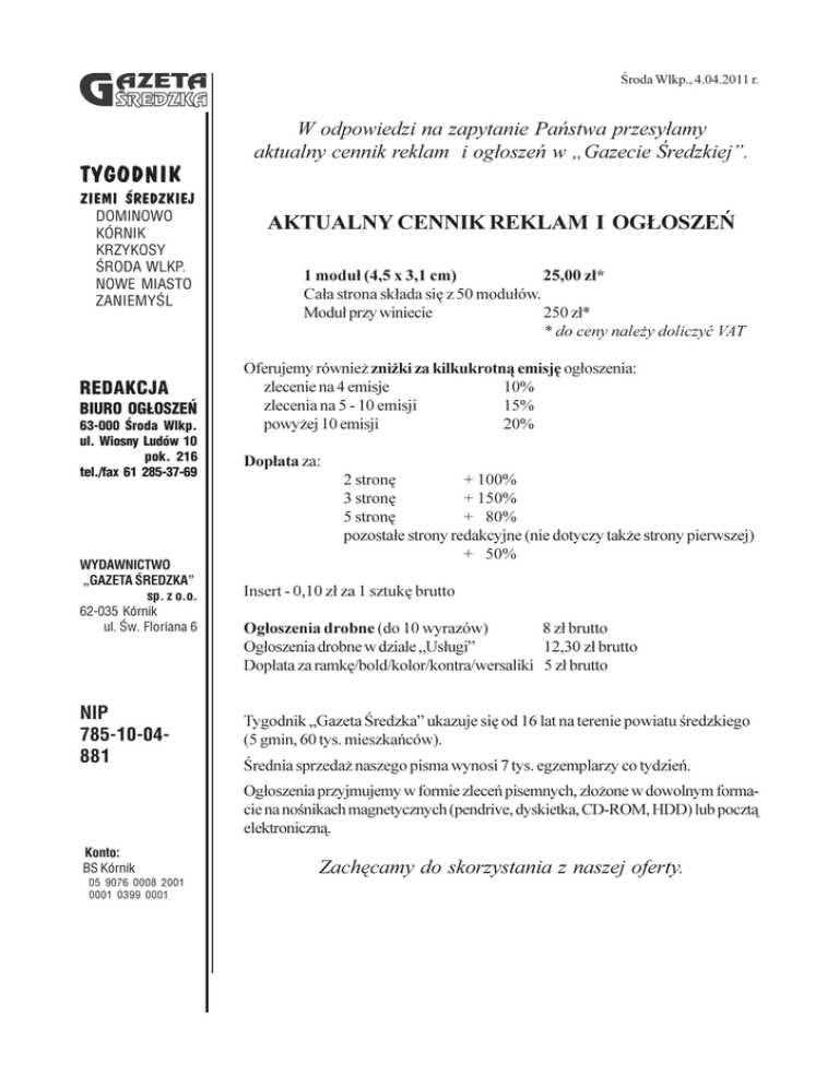 Œroda Wlkp., 4.04.2011 r. W odpowiedzi na zapytanie Pañstwa przesy³amy aktualny cennik reklam i og³oszeñ w „Gazecie Œredzkiej”. TYGODNIK ZIEMI ŒREDZKIEJ DOMINOWO KÓRNIK KRZYKOSY ŒRODA WLKP. NOWE MIASTO ZANIEMYŒL REDAKCJA BIURO OG£OSZEÑ 63-000 Œroda Wlkp. ul. Wiosny Ludów 10 pok. 216 tel./fax 61 285-37-69 AKTUALNY CENNIK REKLAM I OG£OSZEÑ 1 modu³ (4,5 x 3,1 cm) 25,00 z³* Ca³a strona sk³ada siê z 50 modu³ów. Modu³ przy winiecie 250 z³* * do ceny nale¿y doliczyæ VAT Oferujemy równie¿ zni¿ki za kilkukrotn¹ emisjê og³oszenia: zlecenie na 4 emisje 10% zlecenia na 5 - 10 emisji 15% powy¿ej 10 emisji 20% Dop³ata za: 2 stronê + 100% 3 stronê + 150% 5 stronê + 80% pozosta³e strony redakcyjne (nie dotyczy tak¿e strony pierwszej) + 50% WYDAWNICTWO „GAZETA ŒREDZKA” sp. z o.o. 62-035 Kórnik ul. Œw. Floriana 6 Insert - 0,10 z³ za 1 sztukê brutto NIP 785-10-04881 Tygodnik „Gazeta Œredzka” ukazuje siê od 16 lat na terenie powiatu œredzkiego (5 gmin, 60 tys. mieszkañców). Og³oszenia drobne (do 10 wyrazów) 8 z³ brutto Og³oszenia drobne w dziale „Us³ugi” 12,30 z³ brutto Dop³ata za ramkê/bold/kolor/kontra/wersaliki 5 z³ brutto Œrednia sprzeda¿ naszego pisma wynosi 7 tys. egzemplarzy co tydzieñ. Og³oszenia przyjmujemy w formie zleceñ pisemnych, z³o¿one w dowolnym formacie na noœnikach magnetycznych (pendrive, dyskietka, CD-ROM, HDD) lub poczt¹ elektroniczn¹. Konto: BS Kórnik 05 9076 0008 2001 0001 0399 0001 Zachêcamy do skorzystania z naszej oferty. 31 mm A Ceny og³oszeñ w Gazecie Œredzkiej na kolumnach reklamowych. C D E z³ 100 z³ 125 z³ z³ 150 z³ 200 z³ 250 z³ 150 z³ 225 z³ 300 z³ 375 z³ z³ 200 z³ 300 z³ 400 z³ 500 z³ z³ 250 z³ 375 z³ 500 z³ 625 z³ 25 z³ 50 50 z³ 100 75 z³ 100 125 z³ 75 65 mm 1 B 98 mm 2 131 mm 3 165 mm 4 5 45 mm 93 mm 141 mm 189 mm 237 mm Do cen nale¿y doliczyæ VAT 23%. Ceny og³oszeñ w Gazecie Œredzkiej na kolumnach reklamowych. B C D E 198 mm A 150 z³ 300 z³ 450 z³ 600 z³ 750 z³ 175 z³ 350 z³ 525 z³ 700 z³ 875 z³ 200 z³ 400 z³ 600 z³ 800 z³ 1.000 225 z³ 450 z³ 675 z³ 900 z³ 1.125 250 z³ 500 z³ 750 z³ 232 mm 6 265 mm 7 z³ 298 mm 8 z³ 355 mm 9 0 45 mm 93 mm 141 mm 1000 1.250 z³ z³ 189 mm 237 mm Do cen nale¿y doliczyæ VAT 23%. Warunki techniczne dla reklam przygotowanych samodzielnie przez klienta 1. Materia³y mog¹ byæ przesy³ane poczt¹ elektroniczn¹. Materia³y mog¹ byæ te¿ dostarczane na noœnikach elektronicznych: • dyskietki 3 1/2" (1,44MB), mog¹ byæ spakowane programami ARJ lub ZIP (w takim wypadku w³aœciwe jest do³¹czenie programu w której reklama zosta³a spakowana), • CD, CD/RW, DVD, • pamiêæ flash (np. SD, miniSD, MS, XD, CF) • pendrive. 2. Materia³ powinien byæ przygotowany w nastêpuj¹cych formatach: • Page Maker w wielkoœci naturalnej, wszystkie kolory CMYK, nale¿y do³¹czyæ czcionki i wstawione ilustracje, • grafika rastrowa (np. Adobe Photoshop) w formacie eps z prewiev 75 dpi, tiff grayscale max 160 dpi, tiff CMYK max 300 dpi, jpg CMYK max 300 dpi (zalecane) • z innych programów (np. Corel Draw) w formacie tiff, jpg lub eps (wyeksportowane w rozdzielczoœci 300 dpi), • w przypadku dostarczenia w formacie cdr nale¿y zamieniæ wszystkie teksty na krzywe, a wersja cdr nie wy¿sza ni¿ 12.0 Nie przyjmujemy reklam w formacie doc. 3. Prosimy o zwróceniu bacznej uwagi na zamienienie wszystkich kolorów na rozbarwialne w CMYK. Przy zapisywaniu reklam prosimy o zwrócenie baczniejszej uwagi, czy w danej pracy nie wystepuj¹: kolory indeksowane, tryb duotone lub RGB (Photoshop), kolory PANTONE (Corel, Adobe Ilustrator, Quark). Je¿eli tak, to nale¿y je bezwzglêdnie zamieniæ na kolory rozbarwialne w trybie CMYK. Napisy o stopniu pisma do 8 punktów musz¹ byæ tylko w jednym kolorze (cyan, magenta, yellow lub black). 4. Zalecamy do³¹czenie kolorowego wydruku - w przypadku jego braku nie ponosimy odpowiedzialnoœci za umieszczenie przez klienta na dysku b³êdnych plików b¹dŸ kolorów niezgodnych z oczekiwaniem klienta. Tym samym traci on prawo reklamacji og³oszenia. 5. Prosimy o dok³adne opisywanie plików na dostarczonym dysku. 6. Nie ma mo¿liwoœci dostarczania materia³ów w formie klisz do druku. 7. Nie nanosimy ¿adnych poprawek w gotowych materia³ach. 8. Og³oszenia musz¹ byæ zrobione dok³adnie w przewidzianym wymiarze wed³ug siatki modu³owej Gazety Œredzkiej. www.gazetasredzka.pl 63-000 Sroda Wlkp., ul. Wiosny Ludów 10, pok. 216 tel. +48 61 285-37-69, 0-608 44-65-61, 0-606 500-170, e-mail [email protected]