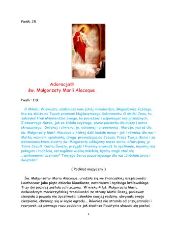 Pieśń: 25 Adoracja św. Małgorzaty Marii Alacoque Pieśń : 119 O Miłości Wiekuista, odsłaniasz nam zdrój miłosierdzia. Błogosławisz każdego, kto się zbliży do Twych promieni Najświętszego Sakramentu. O słodki Jezu, tu założyłeś tron Miłosierdzia Swego, by pocieszać i wspomagać nas grzesznych, Z otwartego Serca, jak ze źródła czystego, płynie pociecha dla duszy i serca skruszonego. Dotykaj i otwieraj je, odnawiaj i przemieniaj . Maryjo, jesteś dla św. Małgorzaty Marii Alacoque o której dziś będzie mowa – jak i również dla nas – Matką, wzorem, opiekunką, drogą prowadzącą do Jezusa. Przez Twoje dłonie i za wstawiennictwem siostry św. Małgorzaty oddajemy nasze serca, ofiarujemy je Tobie Jezu!!! Duchu Święty, przyjdź ! Prosimy prowadź to spotkanie, napełnij nas pokojem i radością, szczególnie wielką miłością, byśmy mogli stać się „ umiłowanymi uczniami” Twojego Serca pozostającego dla nas „źródłem życia i świętości”. ( Podkład muzyczny ) Św. Małgorzata- Maria Alacoque, urodziła się we francuskiej miejscowości Lauthecour jako piąte dziecko Klaudiusza, notariusza i sędziego królewskiego. Trzy dni później została ochrzczona. W wieku 4 lat, Małgorzata Maria doświadczyła macierzyńskiej troskliwości ze strony Matki Bożej, ponieważ cierpiała z powodu nie życzliwości członków swojej rodziny, ukrywała swoje cierpienie, chroniąc się w kącie ogrodu…. Również nie stroniła od przyjemności i rozrywek, aż pewnego razu podobnie jak siostrze Faustynie ukazała się postać 1 bolesna, ubiczowanego Zbawiciela. Złożyła ślub dozgonnej czystości. Pisze św. Małgorzata : Jezus powiedział mi „Wybrałem Cię na oblubienicę moją i przyrzekaliśmy sobie wierność , kiedy złożyłaś mi ślub czystości . To Ja cię do tego przynagliłem, zanim świat miał jakkolwiek cząstkę w sercu twoim, gdyż chciałem je mieć całkowicie czyste i niesplamione. (…) Potem oddałem cię pod opiekę Mojej Najświętszej Matki, żeby cię kształtowała według Moich zamiarów”. Toteż Maryja okazywała mi się zawsze dobrą Matką, (…) uciekałam się do Niej we wszystkich moich cierpieniach i potrzebach, i to z taką ufnością, że zdawało mi się, iż nie muszę się niczego obawiać pod Jej macierzyńską opieką. (Aut. 21-22) W wieku 14 lat odzyskała zdrowie. Pisze: Nie można było znaleźć żadnego lekarstwa na moje cierpienie, więc ofiarowano mnie Najświętszej Maryi Pannie. Zaledwie uczyniłam ten ślub , zaraz otrzymałam zdrowie, a z nim opiekę Maryi która stała się Panią mojego serca, karcąc mnie za upadki i ucząc mnie , jak spełniać wolę Bożą. * * * Maryjo, nasza Mamusiu, za wstawiennictwem św. Małgorzaty, Marii Alacoque oddajemy się Tobie na własność, prowadź nas do Jezusa, by być całkowicie dla Niego i robić wszystko dla Jego miłości. Oddajemy nasze troski, zmartwienia i wszelkie cierpienia. Ty również i do nas mówisz za wstawiennictwem św. Małgorzaty : „Nie lękaj się niczego, będziesz prawdziwym synem, córką moją a ja będę zawsze twoją dobrą Matką”. We wszystkim co nas spotyka pokładajmy wielką ufność w Maryi i uczymy się mówić każdego dnia tak jak Ona: „Oto ja służebnica Pana: niech mi się stanie według Jego słowa!” Pieśń: Oto Matka nasza 140 ( Podkład muzyczny) Małgorzata-Maria Alacoque przed wstąpieniem do klasztoru wizytek w Parayle-Monial, miała tylko jednego kierownika duchowego. W trosce o wyrzeczenie się 2 własnej woli, będąc posłuszną zwróciła się do Pana: Proszę, daj mi kogoś, kto by mnie prowadził do Ciebie . Pan uczynił mi taki zarzut: „Cóż więc! Nie wystarczę Ci Ja? Który jestem początkiem i końcem?”(…) Zapomnienie o sobie, oddanie, cisza - trzy zasadnicze elementy postawy życia duchowego, których Jezus uczył Małgorzatę Marię. „Całkowicie oddałam się Najświętszemu Sercu Jezusa Chrystusa i wybrałam go na mojego kierownika chcącego wyświadczyć mi tą łaskę”. Podczas rekolekcji poprzedzających jej obłóczyny , Chrystus objawił jej prawdziwe powołanie duchowe. Jezus powiedział jej, że serce Jego płonie miłością do ludzi. Ona zaś została wybrana, aby roztaczać wśród nich płomienie miłosierdzia, którego to Serce nie mogło pomieścić. Chrystus ukazując swe Serce i polecając ustanowienie specjalnego święta ku Jego czci. Jezus ukazywał się jej zazwyczaj w obecności Najświętszego Sakramentu lub po przyjęciu Komunii Świętej. Właśnie podczas Komunii Świętej zostały jej udzielone największe łaski. Pierwsze i trzecie wielkie objawienie miały również miejsce przed wystawionym Najświętszym Sakramentem. Również w momencie przyjmowania Komunii Świętej podczas Mszy świętej celebrowanej przez Ojca Colombiere, Jezus ukazał jej Swe serce w postaci płonącego ogniska, w którym także miały spłonąć ich serca. Zdarzało się, że kiedy była chora, podczas podniesienia nagle zdrowiała. Czasem, podczas Komunii Świętej Hostia wydawała jej się rozpłomieniać jak słońce i wówczas Pan zbliżał się, aby na jej głowę włożyć koronę cierniową. Celem ustanowienia święta Najświętszego Serca, o które prosił Chrystus, było wynagrodzenie obelg i niewdzięczności popełnionych wobec Sakramentu Miłości. W ten sposób powiernica Serca Jezusa została sama świętą Eucharystii. Jak sama napisała: "Ogromną łaskę wyświadczył mi Boski Oblubieniec, której ja zupełnie nie jestem godna, że pozwolił mi spoczywać na swym Sercu wraz z umiłowanym uczniem i podarował mi to Serce wraz z krzyżem swoim i swoją miłością". * * * Pieśń:30 3 Panie Jezu, dziękujemy Ci za łaskę Adorowania Ciebie w tym cudownym czasie, kiedy to obdarzasz nas skarbami i uświęcającymi łaskami. Dziękujemy za dar wielkiej Twojej miłości- dar Eucharystii. Kochamy Ciebie i pragniemy przez wszystkie Twoje dobrodziejstwa, aby nas