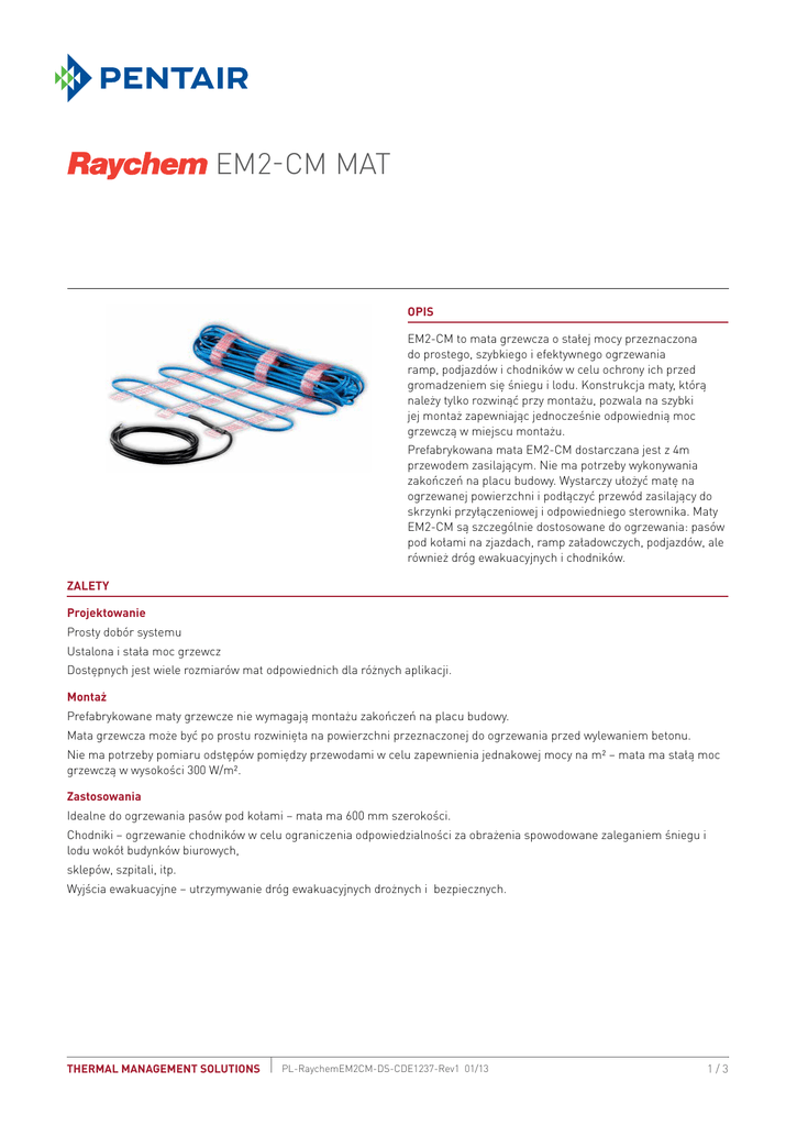 EM2-CM MAT Opis EM2-CM to mata grzewcza o stałej mocy przeznaczona do prostego, szybkiego i efektywnego ogrzewania ramp, podjazdów i chodników w celu ochrony ich przed gromadzeniem się śniegu i lodu. Konstrukcja maty, którą należy tylko rozwinąć przy montażu, pozwala na szybki jej montaż zapewniając jednocześnie odpowiednią moc grzewczą w miejscu montażu. Prefabrykowana mata EM2-CM dostarczana jest z 4m przewodem zasilającym. Nie ma potrzeby wykonywania zakończeń na placu budowy. Wystarczy ułożyć matę na ogrzewanej powierzchni i podłączyć przewód zasilający do skrzynki przyłączeniowej i odpowiedniego sterownika. Maty EM2-CM są szczególnie dostosowane do ogrzewania: pasów pod kołami na zjazdach, ramp załadowczych, podjazdów, ale również dróg ewakuacyjnych i chodników. Zalety Projektowanie Prosty dobór systemu Ustalona i stała moc grzewcz Dostępnych jest wiele rozmiarów mat odpowiednich dla różnych aplikacji. Montaż Prefabrykowane maty grzewcze nie wymagają montażu zakończeń na placu budowy. Mata grzewcza może być po prostu rozwinięta na powierzchni przeznaczonej do ogrzewania przed wylewaniem betonu. Nie ma potrzeby pomiaru odstępów pomiędzy przewodami w celu zapewnienia jednakowej mocy na m² – mata ma stałą moc grzewczą w wysokości 300 W/m². Zastosowania Idealne do ogrzewania pasów pod kołami – mata ma 600 mm szerokości. Chodniki – ogrzewanie chodników w celu ograniczenia odpowiedzialności za obrażenia spowodowane zaleganiem śniegu i lodu wokół budynków biurowych, sklepów, szpitali, itp. Wyjścia ewakuacyjne – utrzymywanie dróg ewakuacyjnych drożnych i bezpiecznych. THERMAL MANAGEMENT SOLUTIONS PL-RaychemEM2CM-DS-CDE1237-Rev1 01/13 1/3 EM2-CM MAT Dane techniczne Moc nominalna: 300 W/m² Napięcie: 230Vac Maks. temperatura ekspozycji: 65°C Minimalna temperatura montażu: +5°C Wymiary: Szerokość maty 600 mm. Długość zależna od zamówionego rozmiaru maty. Wymagany wyłącznik nadmiarowy: Charakterystyka C Wył. różnicowo-prądowy: 30mA Konstrukcja przewodu: Dwużyłowy, mata grzewcza o stałej mocy Certyfikaty: CE, VDE Produkty powiązane VIA-DU-20 Programowalny sterownik przeznaczony do ogrzewania ramp, podjazdów i chodników z czujnikami temperatury i wilgotności gruntu oraz czujnikiem temperatury powietrza. Opakowania i nr katalogowe Maty grzewcze EM2-CM do ogrzewania podjazdów dostępne są w następujących rozmiarach: Symbol produktu Nr katalogowy Wymiary maty Powierzchnia EM2-CM-Mat-2m 1244-004887 2m x 0,6m 1,2 m² EM2-CM-Mat-3m 1244-004888 3m x 0,6m 1,8 m² EM2-CM-Mat-4m 1244-004889 4m x 0,6m 2,4 m² EM2-CM-Mat-5m 1244-004890 5m x 0,6m 3,0 m² EM2-CM-Mat-7m 1244-004891 7m x 0,6m 4,2 m² EM2-CM-Mat-10m 1244-004892 10m x 0,6m 6,0 m² EM2-CM-Mat-13m 1244-004893 13m x 0,6m 7,8 m² EM2-CM-Mat-16m 1244-004894 16m x 0,6m 9,6 m² EM2-CM-Mat-21m 1244-004895 21m x 0,6m 12,6 m² Przygotowanie podłoża przed montażem Mata grzewcza powinna być układana na stabilnym podłożu. Dla konstrukcji wiszących podłoże może składać się z gotowych płyt, sprężonego lub wylewanego betonu. Mata grzewcza może być układana na wszystkich podłożach. W przypadku wylewanego betonu należy upewnić się, że powierzchnia jest gładka a wszystkie ostre obiekty zostały usunięte. Rampy na stałych podłożach nie wymagają dodatkowej izolacji termicznej. Dodatkowego przygotowania wymaga montaż czujnika wilgotności i temperatury gruntu. Instrukcja montażu Kompletne instrukcje montażu dostarczane są wraz z produktem, są również dostępne w formie elektronicznej za pośrednictwem Pentair Thermal Management. Proszę pytać o instrukcję montażu, o numerze: INST-272. Dobór produktu Specyfikacja doboru produktu dostępna jest na życzenie za pośrednictwem Pentair Thermal Management. Jest również dostępna na stronie internetowej: www.thermal.pentair.com 2/3 PL-RaychemEM2CM-DS-CDE1237-Rev1 01/13 THERMAL MANAGEMENT SOLUTIONS WWW.THERMAL.PENTAIR.COM Polska Tel. +48 22 331 29 50 Fax +48 22 331 29 51 [email protected] All Pentair trademarks and logos are owned by Pentair. All other brand or product names are trademarks or registered marks of their respective owners. Because we are continuously improving our products and services, Pentair reserves the right to change specifications without prior notice. Pentair is an equal opportunity employer. © 2013 Pentair. All Rights Reserved. THERMAL MANAGEMENT SOLUTIONS PL-RaychemEM2CM-DS-CDE1237-Rev1 01/13 3/3