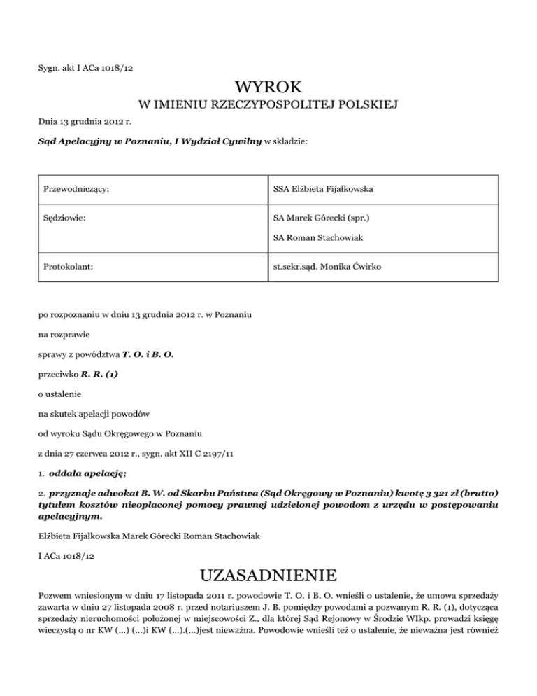 Sygn. akt I ACa 1018/12 WYROK W IMIENIU RZECZYPOSPOLITEJ POLSKIEJ Dnia 13 grudnia 2012 r. Sąd Apelacyjny w Poznaniu, I Wydział Cywilny w składzie: Przewodniczący: SSA Elżbieta Fijałkowska Sędziowie: SA Marek Górecki (spr.) SA Roman Stachowiak Protokolant: st.sekr.sąd. Monika Ćwirko po rozpoznaniu w dniu 13 grudnia 2012 r. w Poznaniu na rozprawie sprawy z powództwa T. O. i B. O. przeciwko R. R. (1) o ustalenie na skutek apelacji powodów od wyroku Sądu Okręgowego w Poznaniu z dnia 27 czerwca 2012 r., sygn. akt XII C 2197/11 1. oddala apelację; 2. przyznaje adwokat B. W. od Skarbu Państwa (Sąd Okręgowy w Poznaniu) kwotę 3 321 zł (brutto) tytułem kosztów nieopłaconej pomocy prawnej udzielonej powodom z urzędu w postępowaniu apelacyjnym. Elżbieta Fijałkowska Marek Górecki Roman Stachowiak I ACa 1018/12 UZASADNIENIE Pozwem wniesionym w dniu 17 listopada 2011 r. powodowie T. O. i B. O. wnieśli o ustalenie, że umowa sprzedaży zawarta w dniu 27 listopada 2008 r. przed notariuszem J. B. pomiędzy powodami a pozwanym R. R. (1), dotycząca sprzedaży nieruchomości położonej w miejscowości Z., dla której Sąd Rejonowy w Środzie WIkp. prowadzi księgę wieczystą o nr KW (...) (...)i KW (...).(...)jest nieważna. Powodowie wnieśli też o ustalenie, że nieważna jest również przedwstępna umowa sprzedaży tej nieruchomości zawarta między stronami w dniu 4 grudnia 2008 r. Wskazali, że są to czynności prawne pozorne ukrywające umowę pożyczki. Pozwany wniósł o oddalenie powództwa w całości i obciążenie powodów kosztami postępowania. Wyrokiem z dnia 27 czerwca 2012 Sąd Okręgowy w Poznaniu powództwo oddalił i rozstrzygnął o kosztach procesu. Podstawą tego orzeczenia są następujące ustalenia faktyczne. T. O. i B. O. są małżeństwem. Powód, od kwietnia 2004 r. był zatrudniony w należącym do pozwanego R. R. (1) Przedsiębiorstwie (...) z siedzibą w Z.. Od maja 2007 r. do końca maja 2008 r. powódka była zatrudniona w założonym przez pozwanego wydawnictwie gazety lokalnej (...). W listopadzie 2008 r. powódka poinformowała pozwanego o groźbie utraty mieszkania, z uwagi na bardzo trudną sytuację finansową i poprosiła go o pożyczenie kwoty 110.000 zł, którą małżonkowie chcieli przeznaczyć na spłatę długów. Pozwany wiedząc o trudnej sytuacji finansowej powodów odmówił udzielenia pożyczki. Powódka jeszcze kilkakrotnie przychodziła do pozwanego w tej sprawie. Pozwany zaoferował powodom inne rozwiązanie. Zaproponował, że odkupi od powodów mieszkanie, które na okres 3 lat pozostawi do ich dyspozycji, z możliwością odkupu. Strony ustaliły, że cena za mieszkanie wyniesie 140.000 zł, z czego powodowie otrzymają 110.000 zł, natomiast pozostałe 30.000 zł zostanie przeznaczone przez pozwanego na niezbędny remont dachu, przy czym kwota ta będzie stanowić udział własny powodów w momencie odkupu mieszkania. Strony oszacowały wstępnie remont na kwotę 35.000 zł. Po zawarciu umowy sprzedaży nieruchomości strony miały zawrzeć przedwstępną umowę odsprzedaży, tak aby powodowie mogli odzyskać mieszkanie po zwrocie kwoty przekazanej im przez pozwanego, powiększonej o 12 % w skali roku. Odkupienie nieruchomości miało nastąpić po upływie 3 lat ze środków pochodzących z zaciągniętego przez powodów kredytu. W dniu 27 listopada 2008 r. doszło do zawarcia umowy sprzedaży nieruchomości, której stronami byli - powodowie po stronie sprzedającego i pozwany jako kupujący. Przedmiotem sprzedaży był lokal mieszkalny nr (...) stanowiący odrębną własność, położony w budynku nr (...) w miejscowości Z. o łącznej pow. 163,44 m2 z 3 piwnicami, dla którego Sąd Rejonowy w Środzie Wlkp. prowadzi księgę wieczystą o nr KW (...).(...) oraz związany z nim udział we współwłasności gruntu i częściach wspólnych nieruchomości wynoszący (...), objęty księgą KW (...).(...). Cena sprzedaży została ustalona na kwotę 140.000 zł płatną: w zakresie kwoty 10.000 zł gotówką w dniu zawarcia umowy, w zakresie kwoty 100.000 zł przelewem na rachunek bankowy powodów w dniu zawarcia umowy, a w zakresie pozostałych 30.000 zł do 31 marca 2009 r. W § 5 umowy sprzedający zobowiązali się wydać kupującemu lokal do 27 listopada 2011 r., a w § 7 kupujący ustanowił na rzecz sprzedających prawo pierwokupu i odkupu lokalu przez okres 3 lat. W dniu 4 grudnia 2008 r., pomiędzy powodami jako zobowiązanymi do nabycia i pozwanym jako zobowiązanym do sprzedaży, doszło do zawarcia przedwstępnej umowy sprzedaży przedmiotowej nieruchomości, nabytej przez pozwanego na mocy umowy z dnia 27 listopada 2008 r. W § 3 umowy strony uzgodniły, ze cena za nabycie powyższego lokalu i udziału w nieruchomości wynosić będzie - 156.800 zł, jeżeli do zawarcia umowy dojdzie do dnia 31 grudnia 2009 r., 173.600 zł jeżeli do zawarcia umowy dojdzie do 31 grudnia 2010 r., 190.400 zł jeżeli do zawarcia umowy dojdzie do 31 grudnia 2009r. W § 4 umowy strony uzgodniły, że przyrzeczoną umowę sprzedaży zawrą najpóźniej w terminie do dnia 31 grudnia 2011 r. Na podstawie aktu notarialnego z dnia 27 listopada 2008 r. Sąd Rejonowy w Środzie Wielkopolskiej wpisał powoda w dziele II księgi wieczystej nr Kw (...) jako właściciela, a w dziale II księgi wieczystej nr Kw (...) jako współwłaściciela w 757/1000 części nieruchomości. W dniu 23 lipca 2010 r. pozwany zawarł porozumienie z Gminą Ś., dotyczące remontu dachu budynku, w którym położony jest przedmiotowy lokal, w którym zobowiązał się do przeprowadzenia remontu dachu, za kwotę nieprzekraczającą 106.456,49 zł, a Gmina zobowiązała się do partycypowania w kosztach remontu w kwocie odpowiadającej wysokości udziału ww. nieruchomości tj. 24,3 % należności za remont. Pozwany zlecił remont dachu na przedmiotowym budynku za kwotę łącznie wynoszącą 57.543,44 zł, z czego Gmina Ś. W. zwróciła około 20.00
