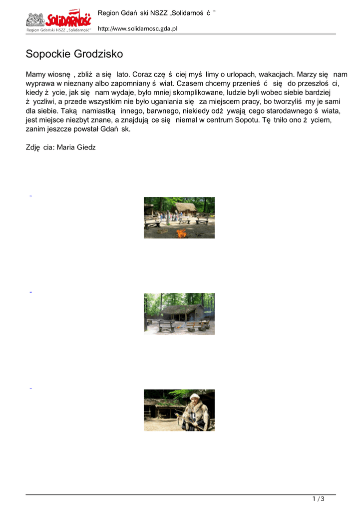 Region Gda ski NSZZ „Solidarno http://www.solidarnosc.gda.pl Sopockie Grodzisko Mamy wiosn , zbli a si lato. Coraz cz ciej my limy o urlopach, wakacjach. Marzy si nam wyprawa w nieznany albo zapomniany wiat. Czasem chcemy przenie si do przeszło ci, kiedy ycie, jak si nam wydaje, było mniej skomplikowane, ludzie byli wobec siebie bardziej yczliwi, a przede wszystkim nie było uganiania si za miejscem pracy, bo tworzyli my je sami dla siebie. Tak namiastk innego, barwnego, niekiedy od ywaj cego starodawnego wiata, jest miejsce niezbyt znane, a znajduj ce si niemal w centrum Sopotu. T tniło ono yciem, zanim jeszcze powstał Gda sk. Zdj cia: Maria Giedz 1/3 Region Gda ski NSZZ „Solidarno http://www.solidarnosc.gda.pl Mo na do niego trafi , id ulic c Haffneraw stron Kamiennego Potoku. Usytuowane jest na tak zwanej Górze Zamkowej, zwanej te „Patelni , czyli jednym z polodowcowych wzgórz Wschodniej Wysoczyzny Kaszubskiej. W dobie wczesnego redniowiecza, a wi c w czasach przedpiastowskich, czyli w IX-X wieku, sopocki gród był nie do zdobycia. Wznosił si na wzgórzu o stromych zboczach, oddzielonym od pozostałych wzgórz gł bokimi jarami ze strumieniami. Naukowcy twierdz , e u jego podnó a najprawdopodobniej znajdowało si morze, tworz c naturaln fos . Sk d takie przypuszczenie? Otó gród otoczony jest wałem obronnym, ale tylko od strony l du. Od strony morza wału nie było. Teraz gród od brzegu 2/3 Region Gda ski NSZZ „Solidarno http://www.solidarnosc.gda.pl morskiego oddalony jest jakie 400 metrów. Owo sopockie grodzisko funkcjonowało w okresie, kiedy Gda skjeszcze nie istniał. Niektórzy archeolodzy twierdz , e jest najstarszym grodem na Pomorzu. To oczywi cie nie oznacza, e wcze niej nie było adnego osadnictwa na tych ziemiach, gdy tylko na terenie dzisiejszego Sopotu lady bytno ci człowieka si gaj epoki kamienia. Ponadto, zanim na owym wzgórzu wzniesiono gród, to w VIII w. w tym miejscu istniała osada. Zało enie grodu nast piło około połowy IX w. Umieszczono w nim wojów, gdy był to gród stra niczy do obserwacji przybrze nego pasa nadmorskiego. Z wykopalisk wiadomo, e mieszkało w nim zapewne siedem, mo e osiem rodzin, czyli około 30 osób. Nie było to jeszcze miasto, bowiem Sopot prawa miejskie uzyskał dopiero tysi c lat pó niej, bo w 1901 roku, a uroczyste ich nadanie nast piło w roku 1902. Niemniej miał charakter takiej wczesnej struktury miejskiej, gdy jego mieszka cy byli te rzemie lnikami. Zajmowali si tkactwem, prz dzalnictwem, bursztyniarstwem, rogowiarstwem, kowalstwem. Czynno ci te wykonywali nie tylko na potrzeby własne. Handlowali swoimi towarami z przybyszami z południa, z kupcami przybywaj cymi z bardzo odległych krain, np. z Bizancjum, o czym wiadcz m.in. znalezione tu szklane paciorki wytwarzane w bizantyjskich warsztatach. Na własne potrzeby wykonywali naczynia gliniane, zdobi c je rytym ornamentem. W grodzie przebywały te kobiety, o czym wiadcz znalezione przez archeologów prz liki ‒ przedmioty ułatwiaj ce prz dzenie, kolie ‒ du e bursztynowe wisiory i owe przywiezione z daleka szklane paciorki. Znaleziono te eliwne no yce, a tak e ceramiczn miseczk i to w cało ci. Te wszystkie wykopane z ziemi przedmioty mo na obecnie ogl da w pawilonie wystawowym wzniesionym poni ej grodu. Sam gród, jak ju wspomniałam wcze niej, był otoczony wysokim wałem drewniano-ziemnym z ustawion na nim palisad . Wchodziło si do niego przez bram wej ciow wzmocnion murem kamiennym. Wewn trz stało kilka drewnianych chat i półziemianek, w których nie tylko mieszkali ludzie i zwierz ta, ale te znajdowały si warsztaty rzemie lnicze. Ten wczesno redniowieczny gród został z du pieczołowito ci zrekonstruowany. W miejscach starych chat czy półziemianek wzniesiono współczesne chaty, ale utrzymane w charakterze redniowiecznym. W ten sposób powstał skansen, w którym z okazji najró niejszych pikników czy wszelkich imprez, równie prywatnych, mo na zobaczy , jak wygl dało ycie grodowe przed wiekami. W przydomowej zagrodzie mieszkaj zwierz ta, odbywaj si prezentacje rzemiosł, s pokazy walk rycerskich, ale te samemu mo na postrzela z łuku, wzi do r ki miecz, topór, spróbowa ulepi gliniany garnek czy te porozmawia z mieszka cami owego grodu o ich strojach, sposobie ycia, zajrze do chaty z paleniskiem, a nawet spróbowa redniowiecznego jadła. Tekst i zdj cia Maria Giedz 3/3 Powered by TCPDF (www.tcpdf.org)