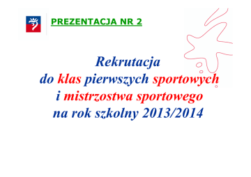 PREZENTACJA NR 2 Rekrutacja do klas pierwszych sportowych i mistrzostwa sportowego na rok szkolny 2013/2014 ZASADY ELEKTRONICZNEJ REKRUTACJI DO KLAS PIERWSZYCH GIMNAZJALNYCH Do sportowych klas pierwszych i klas mistrzostwa sportowego tworzonych w publicznych gimnazjach obwodowych przyjmowani są kandydaci bez względu na ich miejsce zameldowania. Istotne znaczenie w tym przypadku mają: • wynik kandydata uzyskany podczas testu sprawności fizycznej; • aktualne zaświadczenie lekarskie wydane przez lekarza przychodni rodzinnej; • wyniki kandydata uzyskane na świadectwie ukończenia klasy piątej oraz z pierwszego półrocza klasy szóstej; • dodatkowe osiągnięcia (zapoznać się na stronie NABÓR 2013 z regulaminami przeprowadzania rekrutacji do klas sportowych i mistrzostwa sportowego w gimnazjach publicznych). HARMONOGRAM DZIAŁAŃ TERMIN SKŁADANIA DOKUMENTÓW Od 25.03. – do dnia organizacji testu sprawnościowego w danym gimnazjum OGÓLNY TERMIN PRZEPROWADZANIA TESTÓW SPRAWNOŚCIOWYCH DO KLAS SPORTOWYCH i MS 25.03. – 17.04.2013 r. Wykaz gimnazjów, w których planowane jest utworzenie klas sportowych i klas mistrzostwa sportowego: PIŁKA SIATKOWA: Gimnazjum Gimnazjum Gimnazjum Gimnazjum Gimnazjum nr nr nr nr nr 7 9 15 24 w Zespole Szkół nr 2 (dziewczęta) 43 w Zespole Szkół nr 5 (dziewczęta) PIŁKA NOŻNA: Gimnazjum Gimnazjum Gimnazjum Gimnazjum Gimnazjum Gimnazjum Mistrzostwa Sportowego w CKS z Oddziałami Sportowymi w CKS (chłopcy) nr 27 nr 34 (dziewczęta) nr 43 w Zespole Szkół nr 5 (chłopcy) Sportowe nr 1 w ZCEMiP (chłopcy) Wykaz gimnazjów, w których planowane jest utworzenie klas sportowych i klas mistrzostwa sportowego: LEKKA ATLETYKA: Gimnazjum Gimnazjum Gimnazjum Gimnazjum nr nr nr nr 11 w Zespole Szkół Sportowych 14 w Zespole Szkół Ogólnokształcących nr 4 24 w Zespole Szkół nr 2 34 PIŁKA RĘCZNA: Gimnazjum z Oddziałami Sportowymi w CKS Gimnazjum nr 11 w Zespole Szkół Sportowych KOSZYKÓWKA Gimnazjum nr 7 Gimnazjum Mistrzostwa Sportowego w CKS SZERMIERKA Gimnazjum nr 11 w Zespole Szkół Sportowych KOLARSTWO Gimnazjum nr 11 w Zespole Szkół Sportowych Wykaz gimnazjów, w których planowane jest utworzenie klas sportowych i klas mistrzostwa sportowego: TENIS STOŁOWY Gimnazjum nr 11 w Zespole Szkół Sportowych WIOŚLARSTWO Gimnazjum nr 11 w Zespole Szkół Sportowych KAJAKARSTWO Gimnazjum z Oddziałami Sportowymi w CKS PŁYWANIE Gimnazjum Mistrzostwa Sportowego w CKS Gimnazjum z Oddziałami Sportowymi w CKS BOKS Gimnazjum Mistrzostwa Sportowego w CKS ŻEGLARSTWO Gimnazjum z Oddziałami Sportowymi w CKS Gimnazjum nr 43 w Zespole Szkół nr 5 TRIATHLON/ PIŁKA WODNA Gimnazjum z Oddziałami Sportowymi w CKS HARMONOGRAM DZIAŁAŃ KANDYDATA TERMIN i MIEJSCE PRZEPROWADZENIA TESTU SPRAWNOŚCI FIZYCZNEJ Nazwa gimnazjum Termin Miejsce Gimnazjum nr 7 piłka siatkowa, koszykówka 16.04.2013 r. godz. 14:00 Gimnazjum nr 7 Gimnazjum nr 9 piłka siatkowa (dziewczęta i chłopcy) 11.04.2013 r. godz. 17:00 Gimnazjum nr 9 (ul. Nałkowskiej 33) (ul. Dunikowskiego 1) HARMONOGRAM DZIAŁAŃ KANDYDATA TERMIN i MIEJSCE PRZEPROWADZENIA TESTU SPRAWNOŚCI FIZYCZNEJ Nazwa gimnazjum Termin Gimnazjum nr 11 25.03.2013 r. godz. 17:00 lekka atletyka, tenis stołowy, szermierka, kolarstwo, wioślarstwo, piłka ręczna Gimnazjum nr 14 lekka atletyka Miejsce lekka atletyka / tenis stołowy kolarstwo/szermierka Zespół Szkół Sportowych ul. Małopolska 22 26.03.2013 r. godz. 17:00 wioślarstwo 26.03.2013 r. godz. 16:00 piłka ręczna 10.04.2013 r. godz. 17:00 16.04.2013r. godz. 15:30 Szczeciński Dom Sportu ul. Wąska 16 Zespół Szkół Ogólnokształcących nr 3 ul. Orawska 1 Zespół Szkół Ogólnokształcących nr 4 (ul. Romera 2) HARMONOGRAM DZIAŁAŃ KANDYDATA TERMIN i MIEJSCE PRZEPROWADZENIA TESTU SPRAWNOŚCI FIZYCZNEJ Nazwa gimnazjum Gimnazjum nr 15 piłka siatkowa dziewczęta i chłopcy Gimnazjum nr 27 piłka nożna dziewczęta i chłopcy Gimnazjum nr 34 lekka atletyka, piłka nożna dziewcząt Termin Miejsce 15.04.2013r. godz. 16:00 Gimnazjum nr 15 I ETAP 26.03.2013 r. godz. (chłopcy) 28.03.2013 r. godz. (dziewczęta) II ETAP 09.04.2013 r. godz. (chłopcy) 11.04.2013 r. godz. (dziewczęta) (ul. Floriana Szarego 12) 16:00 16:00 Gimnazjum nr 27 16:00 (ul. Mikołajczyka 20) 16:00 15.04.2013 r. godz. 15:00 Gimnazjum nr 34 (ul. Wojciechowskiego 50) HARMONOGRAM DZIAŁAŃ KANDYDATA TERMIN i MIEJSCE PRZEPROWADZENIA TESTU SPRAWNOŚCI FIZYCZNEJ Nazwa gimnazjum Gimnazjum nr 43 piłka siatkowa dziewcząt, piłka nożna chłopców, żeglarstwo Gimnazjum Sportowe nr 1 piłka nożna chłopców Gimnazjum nr 24 piłka siatkowa dziewcząt, lekka atletyka Termin piłka siatkowa 17.04.2013 r. godz. 14:00 żeglarstwo 15.04.2013 r. godz. 16:00 Miejsce Zespół Szkół nr 5 (ul. Hoża 3) piłka nożna 16.04.2013 r. godz. 14:00 Szkoła Podstawowa nr 11 12.04.2013 r. godz. 15:30 obiekty sportowe w ZCEMiP (ul. Hoża 6) 16.04.2013 r. godz. 15:00 Zespół Szkół nr 2 (ul. Portowa 21) (ul. E. Plater 20) boisko „Orlik” HARMONOGRAM DZIAŁAŃ KANDYDATA TERMIN i MIEJSCE PRZEPROWADZENIA TESTU SPRAWNOŚCI FIZYCZNEJ Nazwa gimnazjum Gimnazjum z Oddziałami Sportowymi piłka ręczna dz. i chł., piłka nożna chł., pływanie, triathlon, piłka wodna, kajakarstwo i żeglarstwo Nazwa gimnazjum Gimnazjum Mistrzostwa Sportowego piłka nożna, boks, pływanie, koszykówka Termin Miejsce I ETAP 15.04.2013 r. godz. 15:00 CKS ul. Rydla 49 II ETAP 16.04.2013 r. godz. 15:00 CKS ul. Rydla 49 Termin Miejsce I ETAP 16.04.2013 r. godz. 16:00 CKS ul. Mazurska 40 II ETAP 16.04.2013 r. godz. 17:00 CKS ul. Mazurska 40 UWAGA! Kandydaci do klasy pierwszej piłki nożnej, którzy zaliczą specjalistyczny test sprawności fizycznej organizowany przez MKS „POGOŃ” są zwolnieni z testów organizowanych w dniach 15 i 16 kwietnia 2013 r. przez CKS. DOKUMENTY: • ZGŁOSZENIE (Nie można wypełnić elektronicznie!), • OŚWIADCZENIE (Nie można wypełnić elektronicznie!), • ZAŚWIADCZENIE LEKARSKIE, • KAR
