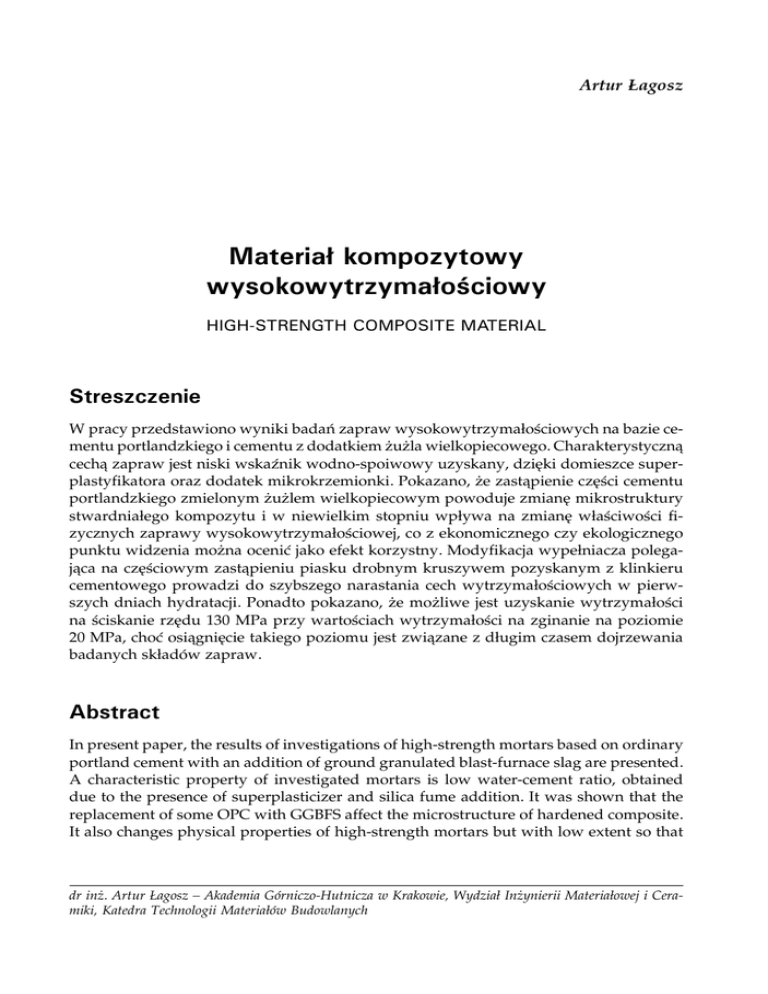 Artur Łagosz Materiał kompozytowy wysokowytrzymałościowy HIGH-STRENGTH COMPOSITE MATERIAL Streszczenie W pracy przedstawiono wyniki badań zapraw wysokowytrzymałościowych na bazie cementu portlandzkiego i cementu z dodatkiem żużla wielkopiecowego. Charakterystyczną cechą zapraw jest niski wskaźnik wodno-spoiwowy uzyskany, dzięki domieszce superplastyfikatora oraz dodatek mikrokrzemionki. Pokazano, że zastąpienie części cementu portlandzkiego zmielonym żużlem wielkopiecowym powoduje zmianę mikrostruktury stwardniałego kompozytu i w niewielkim stopniu wpływa na zmianę właściwości fizycznych zaprawy wysokowytrzymałościowej, co z ekonomicznego czy ekologicznego punktu widzenia można ocenić jako efekt korzystny. Modyfikacja wypełniacza polegająca na częściowym zastąpieniu piasku drobnym kruszywem pozyskanym z klinkieru cementowego prowadzi do szybszego narastania cech wytrzymałościowych w pierwszych dniach hydratacji. Ponadto pokazano, że możliwe jest uzyskanie wytrzymałości na ściskanie rzędu 130 MPa przy wartościach wytrzymałości na zginanie na poziomie 20 MPa, choć osiągnięcie takiego poziomu jest związane z długim czasem dojrzewania badanych składów zapraw. Abstract In present paper, the results of investigations of high-strength mortars based on ordinary portland cement with an addition of ground granulated blast-furnace slag are presented. A characteristic property of investigated mortars is low water-cement ratio, obtained due to the presence of superplasticizer and silica fume addition. It was shown that the replacement of some OPC with GGBFS affect the microstructure of hardened composite. It also changes physical properties of high-strength mortars but with low extent so that dr inż. Artur Łagosz – Akademia Górniczo-Hutnicza w Krakowie, Wydział Inżynierii Materiałowej i Ceramiki, Katedra Technologii Materiałów Budowlanych the economical and ecological effects of this replacement is advantageous. The partial replacement of sand with filling material prepared from portland clinker have an effect on higher speed of strengths development during the first days of hardening. Moreover it was demonstrated, that it is possible to obtain the compressive strength as high as 130 MPa and flexural strength as high as 20 MPa, however long curing terms are needed to obtain those levels of strength.