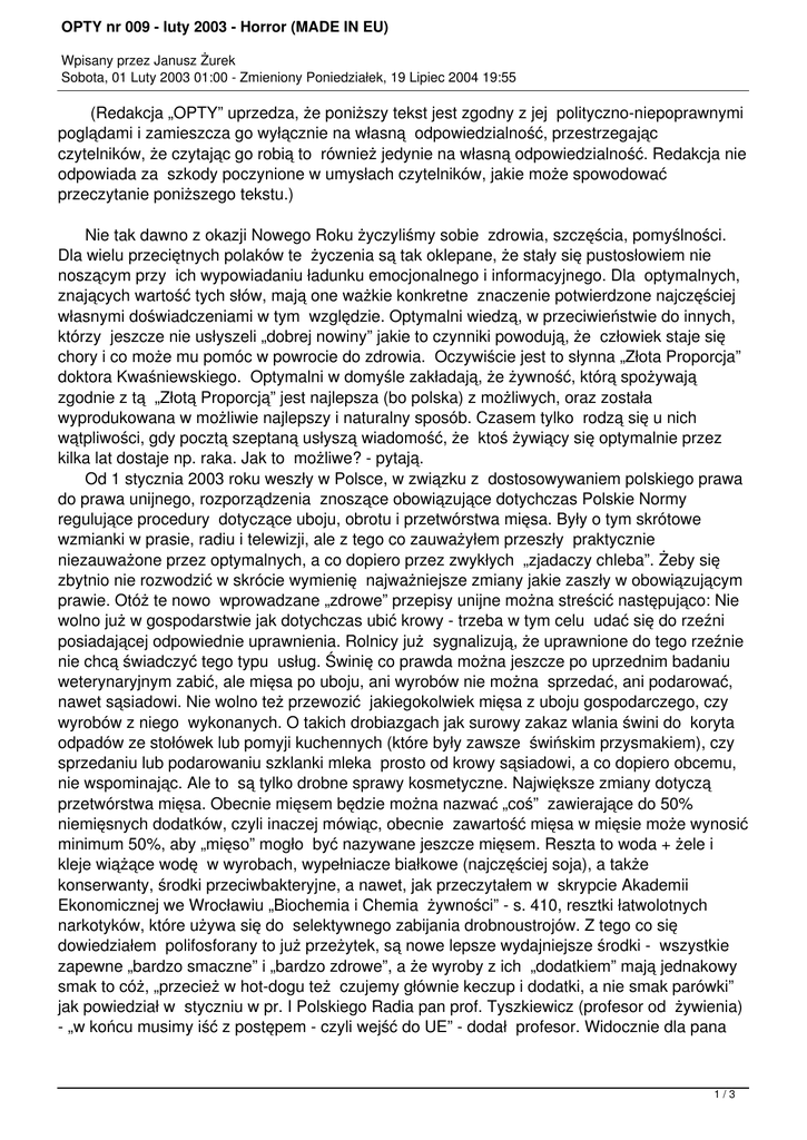OPTY nr 009 - luty 2003 - Horror (MADE IN EU) Wpisany przez Janusz Żurek Sobota, 01 Luty 2003 01:00 - Zmieniony Poniedziałek, 19 Lipiec 2004 19:55 (Redakcja „OPTY” uprzedza, że poniższy tekst jest zgodny z jej polityczno-niepoprawnymi poglądami i zamieszcza go wyłącznie na własną odpowiedzialność, przestrzegając czytelników, że czytając go robią to również jedynie na własną odpowiedzialność. Redakcja nie odpowiada za szkody poczynione w umysłach czytelników, jakie może spowodować przeczytanie poniższego tekstu.) Nie tak dawno z okazji Nowego Roku życzyliśmy sobie zdrowia, szczęścia, pomyślności. Dla wielu przeciętnych polaków te życzenia są tak oklepane, że stały się pustosłowiem nie noszącym przy ich wypowiadaniu ładunku emocjonalnego i informacyjnego. Dla optymalnych, znających wartość tych słów, mają one ważkie konkretne znaczenie potwierdzone najczęściej własnymi doświadczeniami w tym względzie. Optymalni wiedzą, w przeciwieństwie do innych, którzy jeszcze nie usłyszeli „dobrej nowiny” jakie to czynniki powodują, że człowiek staje się chory i co może mu pomóc w powrocie do zdrowia. Oczywiście jest to słynna „Złota Proporcja” doktora Kwaśniewskiego. Optymalni w domyśle zakładają, że żywność, którą spożywają zgodnie z tą „Złotą Proporcją” jest najlepsza (bo polska) z możliwych, oraz została wyprodukowana w możliwie najlepszy i naturalny sposób. Czasem tylko rodzą się u nich wątpliwości, gdy pocztą szeptaną usłyszą wiadomość, że ktoś żywiący się optymalnie przez kilka lat dostaje np. raka. Jak to możliwe? - pytają. Od 1 stycznia 2003 roku weszły w Polsce, w związku z dostosowywaniem polskiego prawa do prawa unijnego, rozporządzenia znoszące obowiązujące dotychczas Polskie Normy regulujące procedury dotyczące uboju, obrotu i przetwórstwa mięsa. Były o tym skrótowe wzmianki w prasie, radiu i telewizji, ale z tego co zauważyłem przeszły praktycznie niezauważone przez optymalnych, a co dopiero przez zwykłych „zjadaczy chleba”. Żeby się zbytnio nie rozwodzić w skrócie wymienię najważniejsze zmiany jakie zaszły w obowiązującym prawie. Otóż te nowo wprowadzane „zdrowe” przepisy unijne można streścić następująco: Nie wolno już w gospodarstwie jak dotychczas ubić krowy - trzeba w tym celu udać się do rzeźni posiadającej odpowiednie uprawnienia. Rolnicy już sygnalizują, że uprawnione do tego rzeźnie nie chcą świadczyć tego typu usług. Świnię co prawda można jeszcze po uprzednim badaniu weterynaryjnym zabić, ale mięsa po uboju, ani wyrobów nie można sprzedać, ani podarować, nawet sąsiadowi. Nie wolno też przewozić jakiegokolwiek mięsa z uboju gospodarczego, czy wyrobów z niego wykonanych. O takich drobiazgach jak surowy zakaz wlania świni do koryta odpadów ze stołówek lub pomyji kuchennych (które były zawsze świńskim przysmakiem), czy sprzedaniu lub podarowaniu szklanki mleka prosto od krowy sąsiadowi, a co dopiero obcemu, nie wspominając. Ale to są tylko drobne sprawy kosmetyczne. Największe zmiany dotyczą przetwórstwa mięsa. Obecnie mięsem będzie można nazwać „coś” zawierające do 50% niemięsnych dodatków, czyli inaczej mówiąc, obecnie zawartość mięsa w mięsie może wynosić minimum 50%, aby „mięso” mogło być nazywane jeszcze mięsem. Reszta to woda + żele i kleje wiążące wodę w wyrobach, wypełniacze białkowe (najczęściej soja), a także konserwanty, środki przeciwbakteryjne, a nawet, jak przeczytałem w skrypcie Akademii Ekonomicznej we Wrocławiu „Biochemia i Chemia żywności” - s. 410, resztki łatwolotnych narkotyków, które używa się do selektywnego zabijania drobnoustrojów. Z tego co się dowiedziałem polifosforany to już przeżytek, są nowe lepsze wydajniejsze środki - wszystkie zapewne „bardzo smaczne” i „bardzo zdrowe”, a że wyroby z ich „dodatkiem” mają jednakowy smak to cóż, „przecież w hot-dogu też czujemy głównie keczup i dodatki, a nie smak parówki” jak powiedział w styczniu w pr. I Polskiego Radia pan prof. Tyszkiewicz (profesor od żywienia) - „w końcu musimy iść z postępem - czyli wejść do UE” - dodał profesor. Widocznie dla pana 1/3 OPTY nr 009 - luty 2003 - Horror (MADE IN EU) Wpisany przez Janusz Żurek Sobota, 01 Luty 2003 01:00 - Zmieniony Poniedziałek, 19 Lipiec 2004 19:55 profesora postęp to oczywiście także kilkukrotny wzrost w ciągu ostatnich 10 lat zachorowań na niektóre postacie raka (np. jelita grubego i kości) - i wzrost dolegliwości gastrycznych. Na efekty zmian prawnych obowiązujących od 1 stycznia tego roku nie trzeba było długo czekać. Nastrzykiwarki w zakładach mięsnych, do tej pory testowane @ i pracujące na pół mocy ruszyły pełną parą. W końcu jesli taka maszyna kosztuje 1 mln (nowych złotych) to taka inwestycjka (najczęściej kredytowana) musi się szybko zwrócić. Kto więcej napompuje ten jest górą. Kto nie „nastrzykuje” ten wypada z gry. A jeśli komuś uda się nawet chwilowo nie wypaść z interesu to wkrótce po wejściu do unii wykończą go obowiązujące tam surowe przepisy sanitarne. Kolejnych utrzymujących się jeszcze na rynku wykończą odbiorcy hurtowi żądający wyrobów o długiej trwałości, ergo nasyconych mocno konserwantami i środkami bakterio i grzybobójczymi. W obecnej chwili 3 z 5 wielkich zmodernizowanych zakładów przetwórstwa mięsnego wystarczą, aby przerobić całą „masę mięsną” produkowaną w Polsce. Niezależnie ocenia się, że conajmniej 70% wszystkich zakładów mięsnych, a przede wszystkim małych i średnich nie spełni wysokich wymagań przepisów unijnych i ulegnie likwidacji. W tym momencie mogą sobie Państwo już odpowiedzieć na pytanie: Dlaczego rolnicy obecnie strajkują blokując drogi w czasie tak niedogodnym dla tego typu akcji. - Przypuszczam, że nawet rolnicy nie zdają sobie 