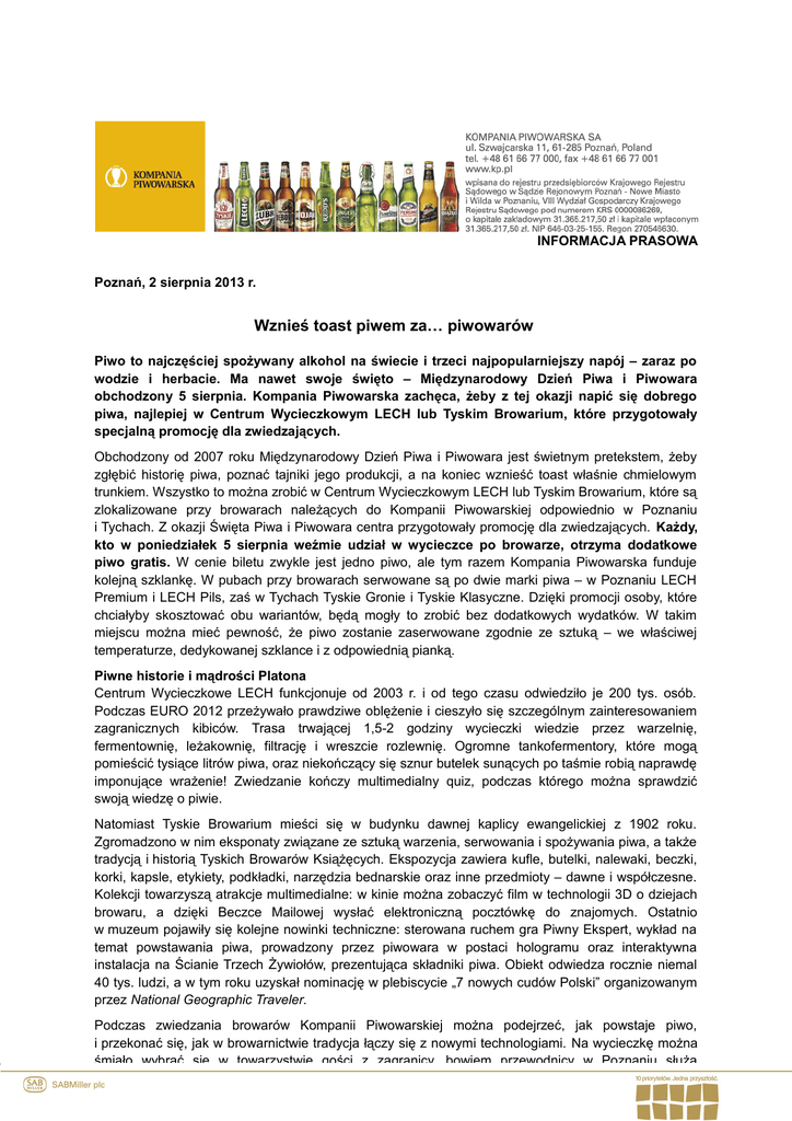 INFORMACJA PRASOWA Poznań, 2 sierpnia 2013 r. Wznieś toast piwem za… piwowarów Piwo to najczęściej spożywany alkohol na świecie i trzeci najpopularniejszy napój – zaraz po wodzie i herbacie. Ma nawet swoje święto – Międzynarodowy Dzień Piwa i Piwowara obchodzony 5 sierpnia. Kompania Piwowarska zachęca, żeby z tej okazji napić się dobrego piwa, najlepiej w Centrum Wycieczkowym LECH lub Tyskim Browarium, które przygotowały specjalną promocję dla zwiedzających. Obchodzony od 2007 roku Międzynarodowy Dzień Piwa i Piwowara jest świetnym pretekstem, żeby zgłębić historię piwa, poznać tajniki jego produkcji, a na koniec wznieść toast właśnie chmielowym trunkiem. Wszystko to można zrobić w Centrum Wycieczkowym LECH lub Tyskim Browarium, które są zlokalizowane przy browarach należących do Kompanii Piwowarskiej odpowiednio w Poznaniu i Tychach. Z okazji Święta Piwa i Piwowara centra przygotowały promocję dla zwiedzających. Każdy, kto w poniedziałek 5 sierpnia weźmie udział w wycieczce po browarze, otrzyma dodatkowe piwo gratis. W cenie biletu zwykle jest jedno piwo, ale tym razem Kompania Piwowarska funduje kolejną szklankę. W pubach przy browarach serwowane są po dwie marki piwa – w Poznaniu LECH Premium i LECH Pils, zaś w Tychach Tyskie Gronie i Tyskie Klasyczne. Dzięki promocji osoby, które chciałyby skosztować obu wariantów, będą mogły to zrobić bez dodatkowych wydatków. W takim miejscu można mieć pewność, że piwo zostanie zaserwowane zgodnie ze sztuką – we właściwej temperaturze, dedykowanej szklance i z odpowiednią pianką. Piwne historie i mądrości Platona Centrum Wycieczkowe LECH funkcjonuje od 2003 r. i od tego czasu odwiedziło je 200 tys. osób. Podczas EURO 2012 przeżywało prawdziwe oblężenie i cieszyło się szczególnym zainteresowaniem zagranicznych kibiców. Trasa trwającej 1,5-2 godziny wycieczki wiedzie przez warzelnię, fermentownię, leżakownię, filtrację i wreszcie rozlewnię. Ogromne tankofermentory, które mogą pomieścić tysiące litrów piwa, oraz niekończący się sznur butelek sunących po taśmie robią naprawdę imponujące wrażenie! Zwiedzanie kończy multimedialny quiz, podczas którego można sprawdzić swoją wiedzę o piwie. Natomiast Tyskie Browarium mieści się w budynku dawnej kaplicy ewangelickiej z 1902 roku. Zgromadzono w nim eksponaty związane ze sztuką warzenia, serwowania i spożywania piwa, a także tradycją i historią Tyskich Browarów Książęcych. Ekspozycja zawiera kufle, butelki, nalewaki, beczki, korki, kapsle, etykiety, podkładki, narzędzia bednarskie oraz inne przedmioty – dawne i współczesne. Kolekcji towarzyszą atrakcje multimedialne: w kinie można zobaczyć film w technologii 3D o dziejach browaru, a dzięki Beczce Mailowej wysłać elektroniczną pocztówkę do znajomych. Ostatnio w muzeum pojawiły się kolejne nowinki techniczne: sterowana ruchem gra Piwny Ekspert, wykład na temat powstawania piwa, prowadzony przez piwowara w postaci hologramu oraz interaktywna instalacja na Ścianie Trzech Żywiołów, prezentująca składniki piwa. Obiekt odwiedza rocznie niemal 40 tys. ludzi, a w tym roku uzyskał nominację w plebiscycie „7 nowych cudów Polski” organizowanym przez National Geographic Traveler. Podczas zwiedzania browarów Kompanii Piwowarskiej można podejrzeć, jak powstaje piwo, i przekonać się, jak w browarnictwie tradycja łączy się z nowymi technologiami. Na wycieczkę można śmiało wybrać się w towarzystwie gości z zagranicy, bowiem przewodnicy w Poznaniu służą komentarzem w języku angielskim i niemieckim, a w Tychach dodatkowo francuskim, włoskim, hiszpańskim, czeskim i rosyjskim. Ponadto dla mieszkańców tego regionu przygotowano oprowadzanie w gwarze śląskiej. Nie wolno jednak zabierać dzieci, ponieważ wycieczki są przeznaczone jedynie dla osób pełnoletnich. Jednak prawdziwym finałem wyprawy jest degustacja zimnego złocistego trunku w pubie. Ten, kto wymyślił piwo, był mędrcem – powiedział ponoć Platon i trudno się z nim nie zgodzić. Ci mędrcy zasługują na to, żeby obchodzić swoje święto i żeby wznieść za nich toast, szczególnie 5 sierpnia. Rezerwacje i więcej informacji o Tyskim Browarium na stronie http://www.tyskiebrowarium.pl/, zaś o Centrum Wycieczkowym LECH na stronie http://www.zwiedzaniebrowaru.pl/. Do redaktora: Kompania Piwowarska – Lider branży piwowarskiej w Polsce Kompania Piwowarska jest największym przedsiębiorstwem piwowarskim w Polsce. Kilkusetletnie doświadczenia w warzeniu piwa, nowoczesne technologie i rygorystyczne przestrzeganie zasad produkcji na światowym poziomie gwarantują najwyższą jakość naszych produktów. Do portfela marek KP należą najpopularniejsze polskie piwa – m.in. Tyskie, Żubr, Lech, Dębowe Mocne, Redd's, a także międzynarodowe marki premium: Pilsner Urquell, Grolsch oraz Peroni Nastro Azzurro. Kompania Piwowarska (utworzona w 1999 roku) posiada trzy browary (w Tychach, Poznaniu i Białymstoku) oraz oddziały handlowe na terenie całego kraju. Kompania Piwowarska prowadzi także działalność społeczną oraz programy edukacyjne popularyzujące odpowiedzialność i umiar w konsumowaniu alkoholu. Wielkość sprzedaży osiągniętej przez KP w roku finansowym zakończonym 31 marca 2013 r. wyniosła 14,5 mln hektolitrów piwa. SABMiller – jeden z największych na świecie producentów piwa Kompania Piwowarska jest częścią jednego z największych na świecie producentów piwa – SABMiller plc. Grupa produkuje lub dystrybuuje piwo na sześciu kontynentach, a jej ogólnoświatowy portfel obejmuje międzynarodowe piwa premium, takie jak Grolsch, Miller Genuine Draft, Peroni Nastro Azzurro czy Pilsner Urquell oraz czołowe marki lokalne, takie jak Aquila, Castle, Miller Lite, Snow czy Tyskie. SABMiller jest jedną z największych na świecie (poza USA) firm rozlewających produkty CocaColi. W roku finansowym zak
