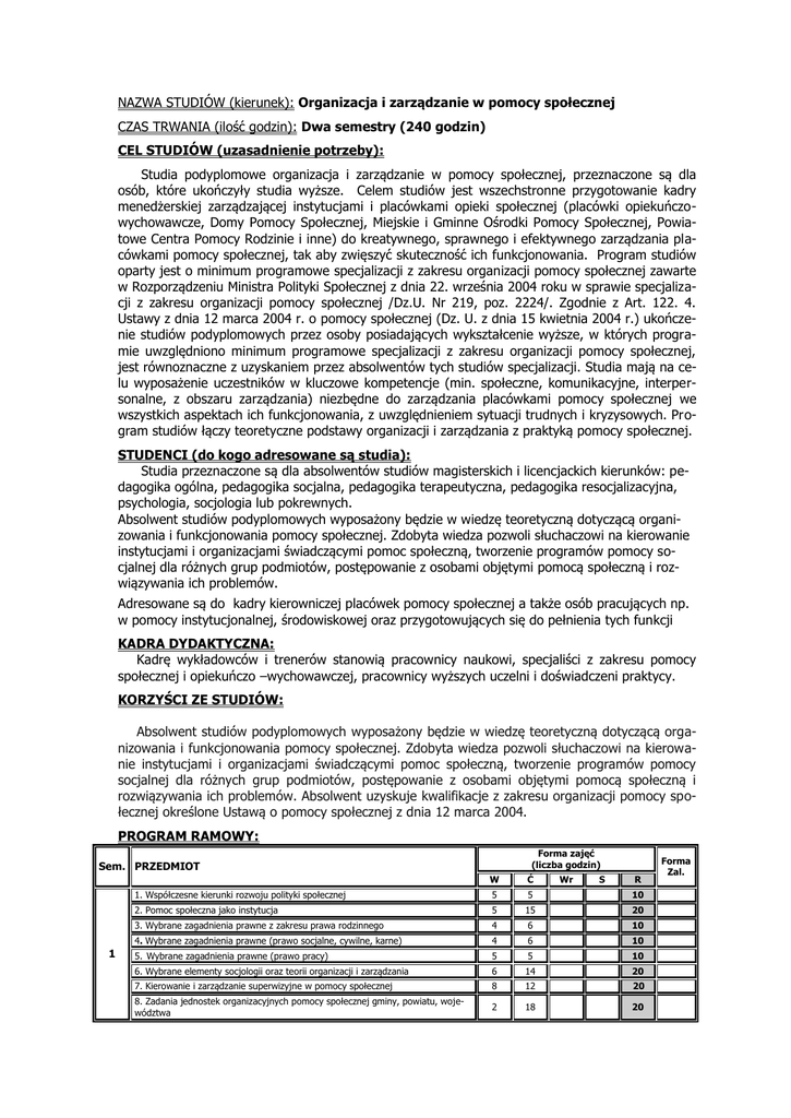 NAZWA STUDIÓW (kierunek): Organizacja i zarządzanie w pomocy społecznej CZAS TRWANIA (ilość godzin): Dwa semestry (240 godzin) CEL STUDIÓW (uzasadnienie potrzeby): Studia podyplomowe organizacja i zarządzanie w pomocy społecznej, przeznaczone są dla osób, które ukończyły studia wyższe. Celem studiów jest wszechstronne przygotowanie kadry menedżerskiej zarządzającej instytucjami i placówkami opieki społecznej (placówki opiekuńczowychowawcze, Domy Pomocy Społecznej, Miejskie i Gminne Ośrodki Pomocy Społecznej, Powiatowe Centra Pomocy Rodzinie i inne) do kreatywnego, sprawnego i efektywnego zarządzania placówkami pomocy społecznej, tak aby zwięszyć skuteczność ich funkcjonowania. Program studiów oparty jest o minimum programowe specjalizacji z zakresu organizacji pomocy społecznej zawarte w Rozporządzeniu Ministra Polityki Społecznej z dnia 22. września 2004 roku w sprawie specjalizacji z zakresu organizacji pomocy społecznej /Dz.U. Nr 219, poz. 2224/. Zgodnie z Art. 122. 4. Ustawy z dnia 12 marca 2004 r. o pomocy społecznej (Dz. U. z dnia 15 kwietnia 2004 r.) ukończenie studiów podyplomowych przez osoby posiadających wykształcenie wyższe, w których programie uwzględniono minimum programowe specjalizacji z zakresu organizacji pomocy społecznej, jest równoznaczne z uzyskaniem przez absolwentów tych studiów specjalizacji. Studia mają na celu wyposażenie uczestników w kluczowe kompetencje (min. społeczne, komunikacyjne, interpersonalne, z obszaru zarządzania) niezbędne do zarządzania placówkami pomocy społecznej we wszystkich aspektach ich funkcjonowania, z uwzględnieniem sytuacji trudnych i kryzysowych. Program studiów łączy teoretyczne podstawy organizacji i zarządzania z praktyką pomocy społecznej. STUDENCI (do kogo adresowane są studia): Studia przeznaczone są dla absolwentów studiów magisterskich i licencjackich kierunków: pedagogika ogólna, pedagogika socjalna, pedagogika terapeutyczna, pedagogika resocjalizacyjna, psychologia, socjologia lub pokrewnych. Absolwent studiów podyplomowych wyposażony będzie w wiedzę teoretyczną dotyczącą organizowania i funkcjonowania pomocy społecznej. Zdobyta wiedza pozwoli słuchaczowi na kierowanie instytucjami i organizacjami świadczącymi pomoc społeczną, tworzenie programów pomocy socjalnej dla różnych grup podmiotów, postępowanie z osobami objętymi pomocą społeczną i rozwiązywania ich problemów. Adresowane są do kadry kierowniczej placówek pomocy społecznej a także osób pracujących np. w pomocy instytucjonalnej, środowiskowej oraz przygotowujących się do pełnienia tych funkcji KADRA DYDAKTYCZNA: Kadrę wykładowców i trenerów stanowią pracownicy naukowi, specjaliści z zakresu pomocy społecznej i opiekuńczo –wychowawczej, pracownicy wyższych uczelni i doświadczeni praktycy. KORZYŚCI ZE STUDIÓW: Absolwent studiów podyplomowych wyposażony będzie w wiedzę teoretyczną dotyczącą organizowania i funkcjonowania pomocy społecznej. Zdobyta wiedza pozwoli słuchaczowi na kierowanie instytucjami i organizacjami świadczącymi pomoc społeczną, tworzenie programów pomocy socjalnej dla różnych grup podmiotów, postępowanie z osobami objętymi pomocą społeczną i rozwiązywania ich problemów. Absolwent uzyskuje kwalifikacje z zakresu organizacji pomocy społecznej określone Ustawą o pomocy społecznej z dnia 12 marca 2004. PROGRAM RAMOWY: Forma zajęć (liczba godzin) Sem. PRZEDMIOT 1 W Ć 1. Współczesne kierunki rozwoju polityki społecznej 5 5 Wr S 10 R 2. Pomoc społeczna jako instytucja 5 15 20 3. Wybrane zagadnienia prawne z zakresu prawa rodzinnego 4 6 10 4. Wybrane zagadnienia prawne (prawo socjalne, cywilne, karne) 4 6 10 5. Wybrane zagadnienia prawne (prawo pracy) 5 5 10 6. Wybrane elementy socjologii oraz teorii organizacji i zarządzania 6 14 20 7. Kierowanie i zarządzanie superwizyjne w pomocy społecznej 8 12 20 8. Zadania jednostek organizacyjnych pomocy społecznej gminy, powiatu, województwa 2 18 20 Forma Zal. RAZEM W SEMESTRZE 1 2 35 85 120 9. Zadania jednostek organizacyjnych pomocy społecznej gminy, powiatu, województwa 2 28 30 10. Metody statystyczne w pomocy społecznej 5 5 10 11. Etyka pracy socjalnej 2 8 10 12. Instytucje i organizacje realizujące cele pomocy społecznej z uwzględnieniem organizacji pozarządowych 2 8 10 13. Kategorie osób i rodzin uprawnionych do korzystania z pomocy społecznej. Pomoc rodzinie i dziecku 5 5 10 14. Pomoc społeczna wobec różnych kategorii klientów (osoby bezrobotne) 5 5 10 15. Pomoc społeczna wobec różnych kategorii klientów (praca socjalna z osobami 5 5 10 starszymi) 16. Formy komunikacji w grupie 10 17. Pomoc w kryzysie 10 18. Seminarium dyplomowe 10 10 10 10 RAZEM W SEMESTRZE 2 26 64 20 10 120 RAZEM 61 147 20 10 240 Legenda: W – wykład, Ć – ćwiczenia, Wr – warsztaty, R – Razem, E – egzamin, Z – zaliczenie. SZCZEGÓŁOWE TREŚCI KSZTAŁCENIA: Współczesne kierunki rozwoju polityki społecznej – 10 godzin: Teoretyczne aspekty polityki społecznej, w tym m.in. interpretacja pojęcia, doktryny i modele polityki społecznej, wartości, instrumenty, podmioty polityki społecznej, diagnozowanie i ewaluacja w polityce społecznej; wybrane problemy stanowiące przedmiot działań polityki społecznej we współczesnej Polsce, m.in. przemiany życia rodzinnego i polityki rodzinnej, edukacja, ochrona zdrowia i kwestia mieszkaniowa, społeczne problemy pracy, dyskryminacja i równouprawnienie, migracje; współczesne wyzwania i kierunki rozwoju polityki społecznej, m.in. przeciwdziałanie wykluczeniu społecznemu, marginalizacji i ekskluzji, kontrowersje wokół socjalnej funkcji państwa, mechanizmy gospodarki rynkowej w polityce społecznej, europejski model socjalny Pomoc społeczna jako instytucja – 20 godzin: Celem zajęć jest przedstawienie miejsca pomocy społecznej w ramach polityki społecznej i zabezpieczenia społecznego, jej struktury o