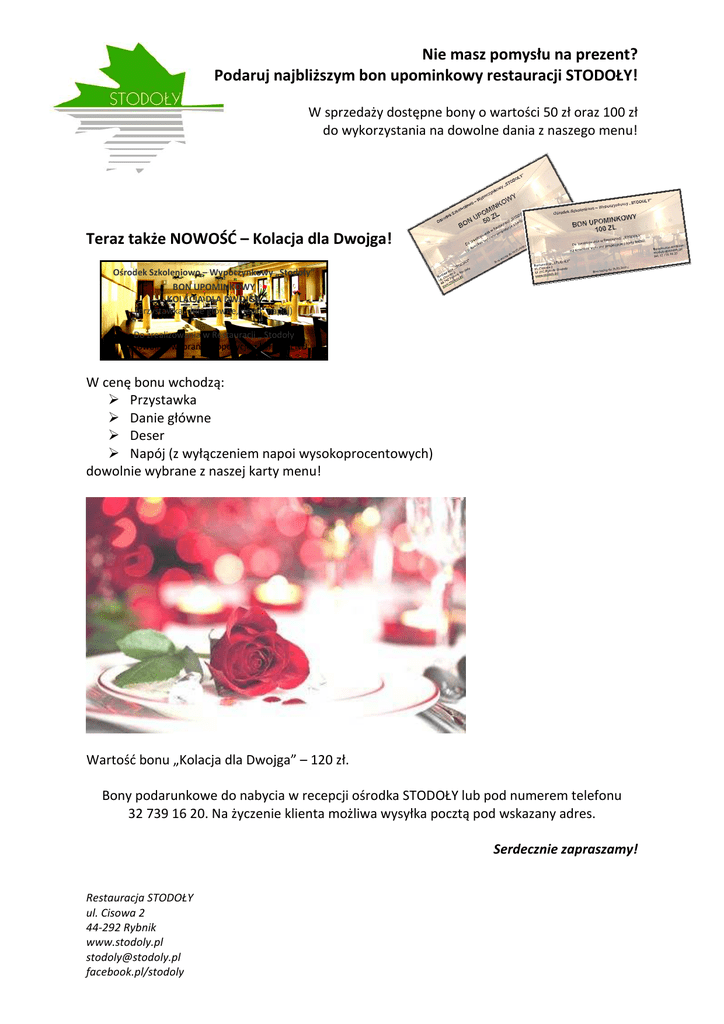 Nie masz pomysłu na prezent? Podaruj najbliższym bon upominkowy restauracji STODOŁY! W sprzedaży dostępne bony o wartości 50 zł oraz 100 zł do wykorzystania na dowolne dania z naszego menu! Teraz także NOWOŚĆ – Kolacja dla Dwojga! Ośrodek Szkoleniowo – Wypoczynkowy „Stodoły” BON UPOMINKOWY KOLACJA DLA DWOJGA (przystawka, dnie główne, deser, napój) Do zrealizowania w Restauracji „ Stodoły na dowolnie wybrane propozycje z karty MENU W cenę bonu wchodzą: Przystawka Danie główne Deser Napój (z wyłączeniem napoi wysokoprocentowych) dowolnie wybrane z naszej karty menu! Wartość bonu „Kolacja dla Dwojga” – 120 zł. Bony podarunkowe do nabycia w recepcji ośrodka STODOŁY lub pod numerem telefonu 32 739 16 20. Na życzenie klienta możliwa wysyłka pocztą pod wskazany adres. Serdecznie zapraszamy! Restauracja STODOŁY ul. Cisowa 2 44-292 Rybnik www.stodoly.pl [email protected] facebook.pl/stodoly