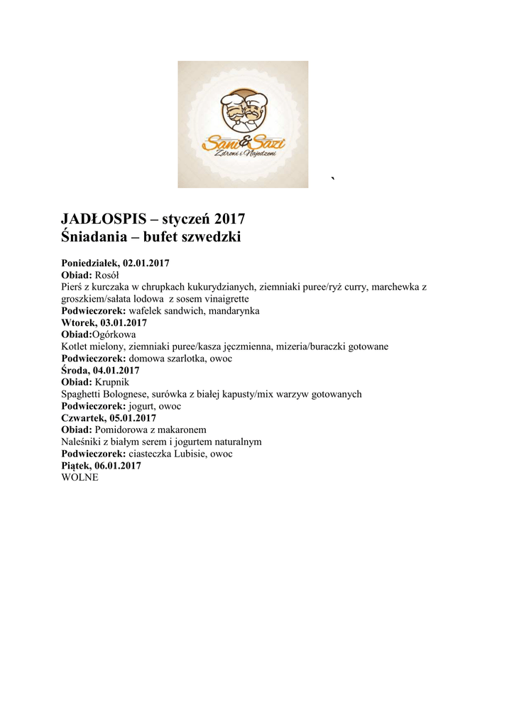 ` JADŁOSPIS – styczeń 2017 Śniadania – bufet szwedzki Poniedziałek, 02.01.2017 Obiad: Rosół Pierś z kurczaka w chrupkach kukurydzianych, ziemniaki puree/ryż curry, marchewka z groszkiem/sałata lodowa z sosem vinaigrette Podwieczorek: wafelek sandwich, mandarynka Wtorek, 03.01.2017 Obiad:Ogórkowa Kotlet mielony, ziemniaki puree/kasza jęczmienna, mizeria/buraczki gotowane Podwieczorek: domowa szarlotka, owoc Środa, 04.01.2017 Obiad: Krupnik Spaghetti Bolognese, surówka z białej kapusty/mix warzyw gotowanych Podwieczorek: jogurt, owoc Czwartek, 05.01.2017 Obiad: Pomidorowa z makaronem Naleśniki z białym serem i jogurtem naturalnym Podwieczorek: ciasteczka Lubisie, owoc Piątek, 06.01.2017 WOLNE Poniedziałek, 09.01.2017 Obiad: Szczawiowa z ziemniakami i jajkiem Udko z kurczaka, ziemniaki puree/kasza jęczmienna, surówka z kapusty pekińskiej/marchewka gotowana Podwieczorek: domowe ciasto drożdżowe Wtorek, 10.01.2017 Obiad: Pomidorowa z makaronem Pieczony indyk w sosie własnym, kopytka/kasza pęczak, mizeria/fasolka szparagowa żółta i zielona z dodatkiem kolorowej papryki Podwieczorek: kisiel domowej produkcji, herbatniczki Be-be Środa, 11.01.2017 Obiad: Fasolowa Makaron z białym serem i truskawkami, z jogurtem naturalnym Podwieczorek: ciasteczka owsiane, owoc Czwartek, 12.01.2017 Obiad: Krupnik Sznycel z indyka, ziemniaki zapiekane/ryż jaśminowy, sałata „wiosenna”/marchewka baby Podwieczorek: soczek, owoc PIĄTEK, 13.01.2017 Obiad: Kalafiorowa Paluszki z mintaja, ziemniaki puree/ryż, surówka z kiszonej kapusty/gulasz z warzyw Podwieczorek: chrupki, owoc Poniedziałek, 16.01.2017 Obiad: Jarzynowa Pierogi z mięsem domowej produkcji, surówka z czerwonej kapusty/kalafior i brokuł gotowane Podwieczorek: sezamki, owoc Wtorek, 17.01.2017 Obiad: Żurek z ziemniakami i jajkiem Kluski leniwe, surówka z marchewki i jabłka z pestkami słonecznika Podwieczorek: domowy sernik, owoc Środa, 18.01.2017 Obiad: Ogórkowa Pulpety wieprzowe w sosie pomidorowym, makaron świderki/kasza gryczana, marchewka z groszkiem/sałata lodowa z sosem vinaigrette Podwieczorek: orzeszki ziemne, owoc Czwartek, 19.01.2017 Obiad: Kapuśniak Pierś kurczaka w cieście naleśnikowym, ziemniaki opiekane/ryż paraboliczny, sałatka z pomidora/czerwona kapusta na ciepło Podwieczorek: serek waniliowy, owoc Piątek, 20.01.2017 Obiad: Pieczarkowa Pierogi z białym serem domowej produkcji i jogurtem naturalnym Podwieczorek: drożdżówka, owoc Poniedziałek, 23.01.2017 Obiad: Rosół Udko kurczaka, ziemniaki puree/ryż długoziarnisty, marchewka z groszkiem/mizeria Podwieczorek: jogurt, owoc Wtorek, 24.01.2017 Obiad: Zacierkowa Gulasz z szynki wieprzowej w sosie własnym, makaron świderki/kasza gryczana, buraczki gotowane/surówka na bazie sałaty zielonej z pomidorem, rzodkiewką, szczypiorkiem, papryką i ogórkiem z sosem czosnkowo-jogurtowym Podwieczorek: domowe ciasto marchewkowe Środa, 25.01.2017 Obiad: Krupnik Naleśniki z białym serem, jogurtem naturalnym i polewą czekoladową Podwieczorek: chrupki kręcone, owoc Czwartek, 26.01.2017 Obiad: Pomidorowa z makaronem Pierś kurczaka w sezamie, ziemniaki puree/ryż długoziarnisty, sałatka „jesienna”/brokuły gotowane Podwieczorek: batonik, owoc Piątek, 27.01.2017 Obiad: Jarzynowa Paluszki z morszczuka, ziemniaki puree/ ziemniaki pieczone, surówka z kapusty białej/kalafior gotowany Podwieczorek: soczek, owoc Poniedziałek, 30.01.2017 Obiad: Kalafiorowa Krokiety z mięsem domowej produkcji , sałatka z pomidora/fasolka szparagowa Podwieczorek: ciasteczka owsiane, owoc Wtorek, 31.01.2017 Obiad: Rosół Kotlet mielony, ziemniaki puree/ryż jaśminowy, buraczki gotowane/mizeria Podwieczorek: domowy sernik, owoc
