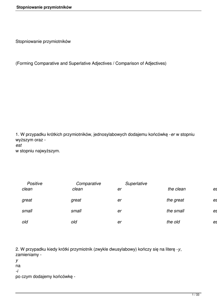 Stopniowanie przymiotników Stopniowanie przymiotników (Forming Comparative and Superlative Adjectives / Comparison of Adjectives) 1. W przypadku krótkich przymiotników, jednosylabowych dodajemu końcówkę -er w stopniu wyższym oraz est w stopniu najwyższym. Positive clean Comparative clean er great great small old Superlative the clean es er the great es small er the small es old er the old es 2. W przypadku kiedy krótki przymiotnik (zwykle dwusylabowy) kończy się na literę -y, zamieniamy y na -i po czym dodajemy końcówkę - 1 / 33 Stopniowanie przymiotników er oraz est . Positive pretty Comparative pretti er heavy heavi happy Superlative the pretti es er the heavi es happi er the happi es silly silli er the silli es ugly ugli er the ugli es 3. Jeżeli krótki przymiotnik kończy się na literę -e, dodajemy końcówkę -er oraz -st. Positive fine fin Comparative er Superlative the fin es 4. W przypadku gdy mamy do czynienia z dłuższymi przymiotnikami (więcej niż dwie sylaby) dodajemy more(less) oraz most(least) przed długimi przymiotnikami. Positive difficult remarkable beautiful Comparative less difficult more remarkable more beautiful Superlative the least difficult the most remarkable the most beautiful 2 / 33 Stopniowanie przymiotników 5. Są również przymiotniki, które stopniują się nieregularnie. Positive bad far far good many much little old Comparative worse further farther better more more less elder Superlative the worst the furthest the farthest the best the most the most the least the eldest 6. Nigdy nie używaj jednocześnie słówka more/most z przymiotnikiem stopniowanym przez dodanie końcówki -er/-est, np. more bigger. 7. Niektóre przymiotniki nie podlegają stopniowaniu, na przykład: right, left, wrong, straight, perfect, unique, fatal, universal, dead, blind, final. 3 / 33 Stopniowanie przymiotników Poniżej listy najczęściej stosowanych przymiotników wraz z ich stopniowaniem. Positive Comparative Superlative big bigger the biggest black blacker the blackest 4 / 33 Stopniowanie przymiotników bold bolder the boldest brave braver the bravest bright brighter the brightest busy busier 5 / 33 Stopniowanie przymiotników the busiest clean cleaner the cleanest clear clearer the clearest clever cleverer the cleverest cold 6 / 33 Stopniowanie przymiotników colder the coldest cool cooler the coolest dark darker the darkest dear dearer the dearest 7 / 33 Stopniowanie przymiotników deep deeper the deepest dirty dirtier the dirtiest dry drier the driest easy 8 / 33 Stopniowanie przymiotników easier the easiest fair fairer the fairest fast faster the fastest fat fatter the fattest 9 / 33 Stopniowanie przymiotników fine finer the finest funny funnier the funniest great greater the greatest green greener 10 / 33 Stopniowanie przymiotników the greenest happy happier the happiest hard harder the hardest healthy healthier the healthiest 11 / 33 Stopniowanie przymiotników heavy heavier the heaviest high higher the highest hot hotter the hottest kind kinder 12 / 33 Stopniowanie przymiotników the kindest large larger the largest late later the latest lazy lazier the laziest light 13 / 33 Stopniowanie przymiotników lighter the lightest long longer the longest low lower the lowest lucky luckier the luckiest 14 / 33 Stopniowanie przymiotników mad madder the maddest narrow narrower the narrowest naughty naughtier the naughtiest near 15 / 33 Stopniowanie przymiotników nearer the nearest new newer the newest noisy noisier the noisiest old older the oldest 16 / 33 Stopniowanie przymiotników poor poorer the poorest pretty prettier the prettiest proud prouder the proudest quick quicker 17 / 33 Stopniowanie przymiotników the quickest red redder the reddest rich richer the richest sad sadder the saddest 18 / 33 Stopniowanie przymiotników safe safer the safest sharp sharper the sharpest short shorter the shortest slow slower 19 / 33 Stopniowanie przymiotników the slowest small smaller the smallest smooth smoother the smoothest strong stronger the strongest sweet 20 / 33 Stopniowanie przymiotników sweeter the sweetest tall taller the tallest thick thicker the thickest thin thinner the thinnest 21 / 33 Stopniowanie przymiotników tiny tinier the tiniest ugly uglier the ugliest warm warmer the warmest wealthy 22 / 33 Stopniowanie przymiotników wealthier the wealthiest wet wetter the wettest white whiter the whitest wide wider the widest 23 / 33 Stopniowanie przymiotników wild wilder the w ildest wise wiser the wisest young younger the youngest // 24 / 33 Stopniowanie przymiotników Positive Comparative Superlative beautiful more beautiful the most beautiful brilliant more brilliant the most brilliant 25 / 33 Stopniowanie przymiotników careful more careful the most careful careless more careless the most careless cheerful more cheerful the most cheerful comfortable 26 / 33 Stopniowanie przymiotników more comfortable the most comfortable dangerous more dangerous the most dangerous delightful more delightful the most delightful difficult more difficult the most difficult 27 / 33 Stopniowanie przymiotników enjoyable more enjoyable the most enjoyable foolish more foolish the most foolish frightening more frightening the most frightening generous more generous 28 / 33 Stopniowanie przymiotników the most generous handsome more handsome the most handsome helpful more helpful the most helpful ignorant more ignorant the most ignorant 29 / 33 Stopniowanie przymiotników important more important the most important intelligent more intelligent the most intelligent interesting more interesting the most interesting pleasant more pleasant 30 / 33 Stopniowanie przymiotników the most pleasant powerful more powerful the most powerful prosperous more prosperous the most prosperous sensible more sensible the most sensible terrible 31 / 33 Stopniowanie przymiotników more terrible the most terrible thoughtful more thoughtful the most thoughtful unusual more unusual the mo