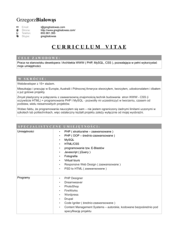 GrzegorzBiałowąs Email: Strona: Telefon: Skype: [email protected] http://www.gregbialowas.com/ 693.961.395 gregbialowas C U R R I C U LU M VI TAE C E L E Z AW O D O W E : Praca na stanowisku dewelopera / Architekta WWW ( PHP, MySQL, CSS ), pozwalająca w pełni wykorzystać moje umiejętności. W SKRÓCIE: Webdeveloper z 15+ stażem. Mieszkając i pracując w Europie, Australii i Północnej Ameryce stworzyłem, tworzyłem, udoskonalałem i dbałem o już gotowe projekty. Zmysł plastyczny w połączeniu z zaawansowną znajomością technik budowania stron WWW - CSS (i oczywiście HTML) + programowanie PHP I MySQL - pozwoliły mi uczestniczyć w tworzeniu, czasem od podstaw, wielu niesamowitych projektów. Wobec faktu, że programowania nauczyłem się sam – nie jestem ograniczony żadnymi limitami uczonymi w szkołach lub politechnikach, więc ostateczny kształt projektu zależy wyłącznie od mojej wyobraźni. SPECJALISTYCZNE UMIEJĘTNOŚCI: Umiejętności • • • • • • • • • • Programy • • • • • • • • PHP ( strukturalne – zaawansowane ) PHP ( OOP – średnio-zaawansowane ) MySQL HTML/CSS programowanie tzw. E-Blastów Javascript ( jQuery ) Fotografia Virtual tours Responsive Web Design ( zaawansowane ) PSD to HTML ( zaawansowane ) PHP Designer Dreamweaver PhotoShop FireWorks Wordpress Drupal Code Igniter ( średnio-zaawansowane ) Content Management Systems – autorskie, kodowane bezpośrednio pod specyfikację projektu Oraz • Flash (również Action Scripting) • • • • • • • Aplikacje bazodanowe Intranety Blogi Programowanie Tworzenie stron Konserwacja istniejących stron Konsultacje a także: • • • • • • • • • • Yii Framework Kohana Framework EJS JavaScript Framework Git Version Control Illustrator Photovista Page Maker Light Wave Corel Draw Bryce 3D D O Ś W I A D C Z E N I E Z AW O D O W E : Lipiec 2010 - nadal 'uWebsiteDesign', Sydney, Australia Stanowisko: Web Programmer / Coder - praca zdalna Obowiązki: Głównie tworzę zaawansowane projekty / aplikacje w oparciu o bazy danych Marzec 2008 Marzec 2009 'Green Way Arts', Los Angeles, California, USA Stanowisko: Web Architect - niezależny kontraktor (praca przez internet telecomuting) Obowiązki: uaktualnianie strony Listopad 2005 Luty 2011 Od kwietnia 2009 jako kontraktor, praca przez internet 'MC Squared', Los Angeles, California, USA Stanowisko: Web Architect - pełny etat, deweloper-lider: PHP/MySQL, HTML/CSS, Flash, Design Obowiązki: • tworzenie stron www z wykorzystaniem CSS'owego 'box model' • programowanie interaktywnych, dynamicznych elementów z wykorzystaniem PHP i MySQL (internetowe aplikacje, panele kontrolne, interaktywne formularze, CMS) • tworzenie animacji flashowych (wraz z pisaniem skryptów ActionScript, jeśli zachodzi taka potrzeba) • uaktualnianie i dbanie o już zakończone projekty internetowe • tworzenie E-Blastów dla firmy i jej klientów • stworzenie i uaktualnianie wewnętrznego systemu biurowego (Job System), przechowującego wszelkie informacje dotyczące działalności agencji. Więcej: http://www.gregbialowas.com/job-system/ (ang.) Maj 2005 Lipiec 2005 ‘University of Southern California’, Los Angeles, California, USA Stanowisko: Programista PHP/MySQL - kontrakt Obowiązki: Stworzenie systemu online do dodawania kursów w jednym z departamentów Uniwersytetu. Więcej: http://www.gregbialowas.com/usc-coursescheduler/ ( EN ) Październik 2004 Listopad 2005 '1st Web Solutions', Porterville, CA 93257, USA (później megreg.com, Los Angeles; obecnie gregbialowas.com, Świdnica) Stanowisko: Web Architect / Web Designer / Fotografik - własna firma Obowiązki: Tworzenie stron www i aplikacji internetowych począwszy od wykonania grafiki, poprzez kodowanie CSS i HTML, skończywszy na programowaniu PHP/MySQL Listopad 2004 Maj 2005 'Nectar Marketing', Grafton, MA 01519, USA Stanowisko: Web Developer - niezależny kontraktor (praca przez internet telecomuting) Obowiązki: Projektowanie grafiki na potrzeby stron www (look&feel), kodowanie tychże stron za pomocą CSS i HTML, programowanie PHP Listopad 2002 nadal Niezależny kontraktor - praca przez Internet (telecomuting) Stanowisko: Freelancer Web Architect Obowiązki: Tworzenie stron www i aplikacji internetowych począwszy od wykonania grafiki, poprzez kodowanie CSS i HTML, skończywszy na programowaniu PHP/MySQL ‘Mana Media’, Cairns, Australia Listopad 2002 Listopad 2004 Listopad 2002 Luty 2003 Stanowisko: Web Architect - kontraktor, od marca 2003 pełny etat Obowiązki: Projektowanie grafiki na potrzeby stron www, tworzenie stron, programowanie interaktywnych, dynamicznych elementów z wykorzystaniem PHP i MySQL (internetowe aplikacje, panele kontrolne, interaktywne formularze, głównie CMS - tu stworzyłem podstawy pod swój własny CMS. 'Pixel Creative', Cairns, Australia Stanowisko: Programista PHP/MySQL - kontraktor, styczeń i luty 2003 pełny etat Obowiązki: Programowanie interaktywnych elementów do już istniejących stron. Październik 2000 Grudzień 2002 'CiMAP', Świdnica Stanowisko: Web Developer - pełny etat Obowiązki: Projektowanie grafiki na potrzeby stron www, tworzenie stron, programowanie interaktywnych, dynamicznych elementów z wykorzystaniem PHP i MySQL (internetowe aplikacje, panele kontrolne, interaktywne formularze, CMS) 2000 'MQF', Pty Ltd, Sydney, Australia Stanowisko: Informatyk 1996 - 1999 Powiatowa Stacja Sanitarno-Epidemiologiczna, Świdnica Stanowisko: Księgowy / Informatyk W Y K S ZTA Ł C E N I E : 2003 Cairns Business College, Cairns, Australia Specjalność: Business Course 1999 - 2000 TLCC Business and Language College, Sydney, Australia Specjalność: Information Technology 1997 - 1999 Szkoła Artystycznej Grafiki Komputerowej, Wrocław Specjalność: Grafik komputerowy / Edytor 1991 - 1995 Liceum Ekonomiczne, Świdnica Specjalność: Finanse i Rachunkowość (Bankowość) D O D AT K O W E U M I E J Ę T N O Ś C I I