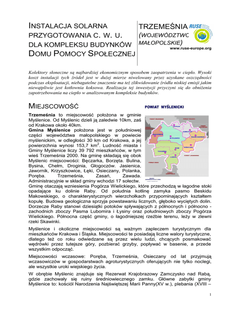 INSTALACJA SOLARNA PRZYGOTOWANIA C. W. U. TRZEMEŚNIA (WOJEWÓDZTWO ) DLA KOMPLEKSU BUDYNKÓW MAŁOPOLSKIE www.ruse-europe.org DOMU POMOCY SPOŁECZNEJ Kolektory słoneczne są najbardziej ekonomicznym sposobem zaopatrzenia w ciepło. Wysoki koszt instalacji tych źródeł jest w duŜej mierze niwelowany przez uzyskane oszczędności podczas eksploatacji, niebagatelne znaczenie ma teŜ zlikwidowanie źródła niskiej emisji jakim niewątpliwie jest kotłownia koksowa. Realizacja tej inwestycji przyczyni się do obniŜenia zapotrzebowania na ciepło w analizowanym kompleksie budynków. MIEJSCOWOŚĆ Trzemeśnia to miejscowość połoŜona w gminie Myślenice. Od Myślenic dzieli ją zaledwie 10km, zaś od Krakowa około 40km. Gmina Myślenice połoŜona jest w południowej części województwa małopolskiego w powiecie myślenickim, w odległości 30 km od Krakowa, a jej powierzchnia wynosi 153,7 km2. Ludność miasta i Gminy Myślenice liczy 39 792 mieszkańców, w tym wieś Trzemeśnia 2000. Na gminę składają się obok Myślenic miejscowości: Bęczarka, Borzęta. Bulina, Bysina, Chełm, Droginia, Głogoczów. Jasienica, Jawornik, Krzyszkowice, Łęki, Osieczany, Polanka, Poręba. Trzemeśnia, Zasań, Zawada. Administracyjnie w skład gminy wchodzi 17 sołectw. Gminę otaczają wzniesienia Pogórza Wielickiego, które przechodzą w łagodne stoki opadające ku dolinie Raby. Od południa kotlinę zamyka pasmo Beskidu Makowskiego, o charakterystycznych wierzchołkach przypominających kształtem kopułę. Budowa geologiczna sprzyja powstawaniu licznych, głęboko wyciętych dolin. Dorzecze Raby stanowi dziesiątki potoków spływających z północnych i północno zachodnich zboczy Pasma Lubomira i Łysiny oraz południowych zboczy Pogórza Wielickiego. Północna część gminy, o łagodniejszej rzeźbie terenu, leŜy w zlewni rzeki Skawinki. Myślenice i okoliczne miejscowości są waŜnym zapleczem turystycznym dla mieszkańców Krakowa i Śląska. Miejscowości te posiadają liczne walory turystyczne, dlatego teŜ co roku odwiedzane są przez wielu ludzi, chcących posmakować wędrówki przez tutejsze góry, pozbierać grzyby, popływać w basenie, a przede wszystkim odpocząć. Miejscowości wczasowe: Poręba, Trzemeśnia, Osieczany od lat przyjmują wczasowiczów w gospodarstwach agroturystycznych oferujących nie tylko noclegi, ale wszystkie uroki wiejskiego Ŝycia. W obrębie Myślenic znajduje się Rezerwat Krajobrazowy Zamczysko nad Rabą, gdzie zachowały się ruiny średniowiecznego zamku. Główne zabytki gminy Myślenice to: kościól Narodzenia Najświętszej Marii Panny(XV w.), plebania (XVIII – 1 XIX w.), kościół św. Jakuba Starszego (XV w.) kaplica Koniecpolskich (1644r.), kaplica Trzeciego Upadku (1780), ruiny zamku ( XII w.) W gminie Myślenice, w skład której wchodzi 17 sołectw działa obecnie około 3 142 podmiotów gospodarczych, co w przeliczeniu na ilość mieszkańców stawia Myślenice w czołówce gmin małopolski. Jest to efektem pręŜnie działającego na tych terenach rzemiosła, które w warunkach gospodarki wolnorynkowej zasadniczo zmieniło swój wymiar. Warsztaty te zmieniły się w dynamiczne firmy produkujące wysokiej jakości wyroby na polski rynek i na eksport. Mocne strony gminy: • Dobrze rozwinięty przemysł metalowy w oparciu o silne tradycje rzemiosła. • Dogodne warunki przyrodniczo-krajoznawcze dla rozwoju turystyki i wypoczynku. • Istnienie basenu krytego z zapleczem oraz aktywna działalność sportowa – osiągnięcia ogólnopolskie i międzynarodowe sekcji sportowych. • Kultywowanie tradycji ludowych w oparciu o działające zespoły folklorystyczne. • Lokalizacja wobec Krakowa i połoŜenie przy waŜnych szlakach komunikacyjnych. • Rozwinięta współpraca z sąsiednimi gminami, oraz miastem Bełchatów, gminą Tinqueux, gminą Csopak, miastem Ludenscheid. TŁO PRZEDSIĘWZIĘCIA Celem projektu była modernizacja instalacji przygotowania c.w.u. w kompleksie budynków Domu Pomocy Społecznej w Trzemeśni, obejmująca przebudowę istniejącego układu grzewczego na system z zastosowaniem odnawialnego źródła energii, który stanowią kolektory słoneczne. Obecnie woda ciepła w DPS jest przygotowywana w kotłowni węglowej . Modernizacja instalacji systemu grzewczego w obiektach będących przedmiotem przyczyni się do zmniejszenia kosztów przygotowania energii. Koszty inwestycyjne systemów ogrzewania z wykorzystaniem kolektorów słonecznych są wyŜsze w porównaniu z kosztami tradycyjnych systemów. Jednak faktem jest, iŜ koszty eksploatacyjne odnawialnych źródeł energii są znikome, a poniesione nakłady inwestycyjne zwracają się w stosunkowo krótkim okresie czasu. Przebudowa systemu grzewczego przyczyni się równieŜ do obniŜenia wydatków gminy na ochronę środowiska i ochronę zdrowia w zakresie profilaktyki i leczenia chorób spowodowanych zanieczyszczeniem powietrza. Decyzje o realizacji przedsięwzięcia zostały podjęte przez Zarząd Powiatu Myślenickiego, mając na uwadze oszczędności energetyczne w jednostkach organizacyjnych Powiatu Myślenickiego. Inwestorem projektu było Starostwo Powiatowe w Myślenicach, wykorzystując środki z Powiatowego Funduszu Ochrony Środowiska oraz występując o dofinansowania do Wojewódzkiego Funduszu Ochrony Środowiska i Gospodarki Wodnej w Krakowie i EKOFUNDUSZU. Projekt został zrealizowany w czasie od maja do grudnia 2005 roku, uwzględniając procedurę przetargową, złoŜenie wniosków o dofinansowanie, wykonanie dokumentacji projektowej, wykonawstwo inwestycji. 2 OPIS PRZEDSIĘWZIĘCIA Obecnie w kompleksie budynków Domu Pomocy Społecznej w Trzemeśni źródłem zaopatrzenia w ciepłą wodę uŜytkową jest kotłownia węglowa. W kotłowni zainstalowane są trzy kotły o łącznej mocy nominalnej 218 KW. Modernizacja kompleksu budynków Domu Pomocy Społecznej w Harbutowicach polegała na instalacji nowoczesnego, nieemisyjnego systemu, kt