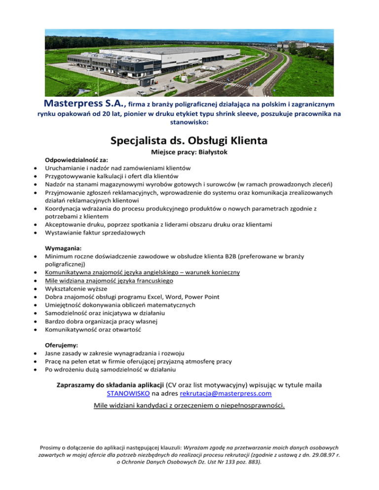 Masterpress S.A., firma z branży poligraficznej działająca na polskim i zagranicznym rynku opakowań od 20 lat, pionier w druku etykiet typu shrink sleeve, poszukuje pracownika na stanowisko: Specjalista ds. Obsługi Klienta Miejsce pracy: Białystok Odpowiedzialność za: Uruchamianie i nadzór nad zamówieniami klientów Przygotowywanie kalkulacji i ofert dla klientów Nadzór na stanami magazynowymi wyrobów gotowych i surowców (w ramach prowadzonych zleceń) Przyjmowanie zgłoszeń reklamacyjnych, wprowadzenie do systemu oraz komunikacja zrealizowanych działań reklamacyjnych klientowi Koordynacja wdrażania do procesu produkcyjnego produktów o nowych parametrach zgodnie z potrzebami z klientem Akceptowanie druku, poprzez spotkania z liderami obszaru druku oraz klientami Wystawianie faktur sprzedażowych Wymagania: Minimum roczne doświadczenie zawodowe w obsłudze klienta B2B (preferowane w branży poligraficznej) Komunikatywna znajomość języka angielskiego – warunek konieczny Mile widziana znajomość języka francuskiego Wykształcenie wyższe Dobra znajomość obsługi programu Excel, Word, Power Point Umiejętność dokonywania obliczeń matematycznych Samodzielność oraz inicjatywa w działaniu Bardzo dobra organizacja pracy własnej Komunikatywność oraz otwartość Oferujemy: Jasne zasady w zakresie wynagradzania i rozwoju Pracę na pełen etat w firmie oferującej przyjazną atmosferę pracy Po wdrożeniu dużą samodzielność w działaniu Zapraszamy do składania aplikacji (CV oraz list motywacyjny) wpisując w tytule maila STANOWISKO na adres [email protected] Mile widziani kandydaci z orzeczeniem o niepełnosprawności. Prosimy o dołączenie do aplikacji następującej klauzuli: Wyrażam zgodę na przetwarzanie moich danych osobowych zawartych w mojej ofercie dla potrzeb niezbędnych do realizacji procesu rekrutacji (zgodnie z ustawą z dn. 29.08.97 r. o Ochronie Danych Osobowych Dz. Ust Nr 133 poz. 883).