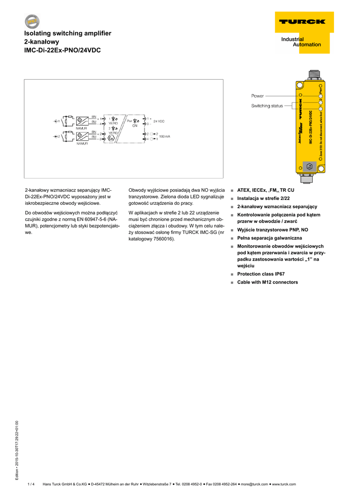 Isolating switching amplifier 2-kanałowy IMC-Di-22Ex-PNO/24VDC 2-kanałowy wzmacniacz separujący IMCDi-22Ex-PNO/24VDC wyposażony jest w iskrobezpieczne obwody wejściowe. Obwody wyjściowe posiadają dwa NO wyjścia tranzystorowe. Zielona dioda LED sygnalizuje gotowość urządzenia do pracy. ■ ATEX, IECEx, FM TR CU Do obwodów wejściowych można podłączyć czujniki zgodne z normą EN 60947-5-6 (NAMUR), potencjometry lub styki bezpotencjałowe. W aplikacjach w strefie 2 lub 22 urządzenie musi być chronione przed mechanicznym obciążeniem złącza i obudowy. W tym celu należy stosować osłonę firmy TURCK IMC-SG (nr katalogowy 7560016). ■ Kontrolowanie połączenia pod kątem przerw w obwodzie / zwarć C US, ■ Instalacja w strefie 2/22 ■ 2-kanałowy wzmacniacz separujący ■ Wyjście tranzystorowe PNP, NO ■ Pełna separacja galwaniczna ■ Monitorowanie obwodów wejściowych pod kątem przerwania i zwarcia w przypadku zastosowania wartości „1” na wejściu ■ Protection class IP67 Edition • 2015-10-30T17:29:22+01:00 ■ Cable with M12 connectors 1/4 Hans Turck GmbH & Co.KG ñ D-45472 Mülheim an der Ruhr ñ Witzlebenstraße 7 ñ Tel. 0208 4952-0 ñ Fax 0208 4952-264 ñ [email protected] ñ www.turck.com Isolating switching amplifier 2-kanałowy IMC-Di-22Ex-PNO/24VDC Typ Nr kat. IMC-Di-22Ex-PNO/24VDC 7560003 Nominal voltage Napięcie zasilania 24 VDC 20…30 VDC NAMUR Napięcie bez obciążenia Prąd zwarcia Input resistance Cable resistance Próg załączenia: Próg wyłączenia: EN-60947-5-6 8.2 VDC 8.2 mA 1 kò ð 50 ò 1.55 mA 1.75 mA Spadek napięcia Semicondutor output circuit(s) Output circuits (digital) Napięcie przełączania Prąd przełączania na wyjście Częstotliwość przełączania ð 2.5 V Galvanic isolation Test voltage Important note Dopuszczenie Ex zgodne z odpowiednimi certyfikatami Zastosowanie Stopień ochrony Wartość maksymalna: Maks. napięcie wyjścia Uo Maks. prąd wyjścia Io Maks. moc wyjścia Po Charakterystyka Internal inductance/capacitance Li/Ci External inductance/capacitance Lo/Co Maks. napięcie wyjścia Uo Maks. prąd wyjścia Io Maks. moc wyjścia Po Charakterystyka Wewnętrzna indukcyjność/pojemność Li/Ci External inductance/capacitance Lo/Co Edition • 2015-10-30T17:29:22+01:00 Dopuszczenie Ex zgodne z odpowiednimi certyfikatami Zastosowanie Stopień ochrony Wartość maksymalna: Maks. napięcie wyjścia Uo Maks. prąd wyjścia Io Maks. prąd wyjścia Io Charakterystyka Induktancja/kapacytancja wewnętrzna Li/Ci Induktancja/kapacytancja zewnętrzna Lo/Co Dimensions Pin assignment male M12 2 x transistors (pnp, short-circuit proof) ð 30 VDC ð 50 mA ð 3000 Hz 2,5 kV For safety applications the values specified in the safety manual or the relevant Ex certificates (ATEX, IECEx, UL, etc.) apply. TÜV 07 ATEX 553447 II (1) GD [Ex ia] IIC/IIB Podłączenie za pomocą złącza żeńskiego M12: 1+4 / 1+3 ð 9.6 V ð 10 mA ð 24 mW linear Li = 0,15 µH, Ci pomijalnie małe Ex ia Lo [mH] Co [nF] 0.85 1100 IIC 10 750 1.85 5300 IIB 20 3400 10 6600 IIB 0.85 11000 ð 9.6 V ð 10 mA ð 24 mW linear Li = 0,15 µH, Ci pomijalnie małe Ex nL Lo [mH] Co [nF] 5.0 1400 IIC 0.85 1900 TÜV 07 ATEX 554027 X II 3 GD Ex nA [nL] IIC/IIB T4 lub Ex tD A22 IP67 T96 °C Podłączenie za pomocą złącza żeńskiego M12: 1+4 / 2+3 ð 9.6 V ð 10 mA ð 24 mW liniowe Li = 0,15 µH, Ci pomijalnie małe Ex nL Lo [mH] Co [nF] 5,0 1400 IIC 0,85 1900 10 6600 IIB 0,85 11000 Ex approval acc. to conformity certificate TÜV 07 ATEX 554027 X Certyfikat MTTF SIL 2 zgodnie z EXIDA FMEDA 295lat zgodnie z SN 29500 (Ed. 99) 40 °C 2/4 Konfiguracja pinów złącza żeńskiego M12 (zakończenie iskrobezpieczne) Hans Turck GmbH & Co.KG ñ D-45472 Mülheim an der Ruhr ñ Witzlebenstraße 7 ñ Tel. 0208 4952-0 ñ Fax 0208 4952-264 ñ [email protected] ñ www.turck.com Isolating switching amplifier 2-kanałowy IMC-Di-22Ex-PNO/24VDC zielony żółty czerwony Stopień ochrony Temperatura pracy Temperatura składowania Wymiary Weight Instrukcja montażu Materiał obudowy Połączenie elektryczne Moment dokręcający IP67 -25 …+70 °C -40…+80°C 100 x 32 x 25 mm 153 g Montaż na płycie bazowej poliwęglan/ABS połączenie kołnierzowe M12 3.5 Nm Edition • 2015-10-30T17:29:22+01:00 Wskazanie Gotowość do pracy Stan przełączania Wskazanie błędu 3/4 Hans Turck GmbH & Co.KG ñ D-45472 Mülheim an der Ruhr ñ Witzlebenstraße 7 ñ Tel. 0208 4952-0 ñ Fax 0208 4952-264 ñ [email protected] ñ www.turck.com Isolating switching amplifier 2-kanałowy IMC-Di-22Ex-PNO/24VDC Akcesoria montażowe Typ Nr kat. IMC-SG 7560016 Rysunek wymiarowy Metalowa płytka ochronna dla modułów IMC (wymagana dla aplikacji w strefie 2/22) SC-M12/3GD 6900390 Zacisk ochronny dla czujników ze złączem M12 x 1 i spełnia- Edition • 2015-10-30T17:29:22+01:00 jących wymagania ATEX II 3 G lub II 3 D. 4/4 Hans Turck GmbH & Co.KG ñ D-45472 Mülheim an der Ruhr ñ Witzlebenstraße 7 ñ Tel. 0208 4952-0 ñ Fax 0208 4952-264 ñ [email protected] ñ www.turck.com