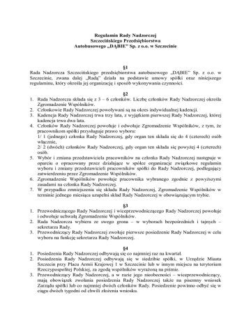 Regulamin Rady Nadzorczej Szczecińskiego Przedsiębiorstwa Autobusowego „DĄBIE” Sp. z o.o. w Szczecinie §1 Rada Nadzorcza Szczecińskiego przedsiębiorstwa autobusowego „DĄBIE” Sp. z o.o. w Szczecinie, zwana dalej „Radą” działa na podstawie umowy spółki oraz niniejszego regulaminu, który określa jej organizację i sposób wykonywania czynności. 1. 2. 3. 4. 5. 6. 7. §2 Rada Nadzorcza składa się z 3 – 6 członków. Liczbę członków Rady Nadzorczej określa Zgromadzenie Wspólników. Członkowie Rady Nadzorczej powoływani są na okres indywidualnej kadencji. Kadencja Rady Nadzorczej trwa trzy lata, z wyjątkiem pierwszej Rady Nadzorczej, której kadencja trwa dwa lata. Członków Rady Nadzorczej powołuje i odwołuje Zgromadzenie Wspólników, z tym, że pracownikom spółki przysługuje prawo wyboru: 1/ 1 (jednego) członka Rady Nadzorczej, gdy organ ten składa się do 4 (czterech) osób włącznie, 2/ 2 (dwóch) członków Rady Nadzorczej, gdy organ ten składa się powyżej 4 (czterech) osób. Wybór i zmiana przedstawiciela pracowników na członka Rady Nadzorczej następuje w oparciu o opracowany przez działające w spółce organizacje związkowe regulamin wyboru i zmiany przedstawicieli pracowników spółki do Rady Nadzorczej, podlegający zatwierdzeniu przez Zgromadzenie Wspólników. Zgromadzenie Wspólników powołuje pracownika wybranego zgodnie z powyższymi zasadami na członka Rady Nadzorczej. W przypadku zmniejszenia się składu Rady Nadzorczej, Zgromadzenie Wspólników w terminie jednego miesiąca uzupełni skład Rady Nadzorczej w obowiązującym trybie. §3 1. Przewodniczącego Rady Nadzorczej i wiceprzewodniczącego Rady Nadzorczej powołuje i odwołuje uchwałą Zgromadzenie Wspólników. 2. Rada Nadzorcza wybiera ze swego grona – w wyborach bezpośrednich i tajnych – sekretarza Rady. 3. Przewodniczący Rady Nadzorczej zwołuje pierwsze posiedzenie Rady Nadzorczej w celu wyboru na funkcję sekretarza Rady Nadzorczej. §4 1. Posiedzenia Rady Nadzorczej odbywają się co najmniej raz na kwartał. 2. Posiedzenia Rady Nadzorczej odbywają się w siedzibie spółki, w Urzędzie Miasta Szczecin przy Placu Armii Krajowej 1 w Szczecinie lub w innym miejscu na terytorium Rzeczypospolitej Polskiej, za zgodą wspólników wyrażoną na piśmie. 3. Przewodniczący Rady Nadzorczej, a w razie jego nieobecności – wiceprzewodniczący, mają obowiązek zwołania posiedzenia Rady Nadzorczej także na pisemny wniosek Zarządu spółki lub co najmniej dwóch członków Rady. Posiedzenie powinno odbyć się w ciągu dwóch tygodni od chwili złożenia wniosku. 1. 2. 3. 4. 5. 6. 7. 1. 2. 3. 4. §5 Dla ważności uchwał Rady Nadzorczej wymagane jest zawiadomienie o posiedzeniu wszystkich członków Rady, przynajmniej na 7 dni przed terminem posiedzenia. Rada Nadzorcza może również obradować bez formalnego zaproszenia, w sytuacji gdy wszyscy jej członkowie będą obecni na posiedzeniu. Rada Nadzorcza podejmuje uchwały zwykłą większością głosów oddanych w obecności co najmniej połowy składu Rady. W przypadku równej liczby oddanych głosów, głos Przewodniczącego liczy się podwójnie, a w razie jego nieobecności, wiceprzewodniczącego Rady Nadzorczej lub członka Rady Nadzorczej prowadzącego posiedzenie. Rada Nadzorcza może podejmować uchwały w trybie pisemnym. Uchwała podjęta w trybie pisemnym jest ważna, gdy wszyscy członkowie Rady Nadzorczej zostali powiadomieni o treści projektu uchwały. Członkowie Rady Nadzorczej mogą brać udział w podejmowaniu uchwał Rady Nadzorczej, oddając swój głos na piśmie za pośrednictwem innego członka Rady Nadzorczej. Oddanie głosu na piśmie nie może dotyczyć spraw wprowadzonych do porządku obrad na posiedzeniu Rady Nadzorczej. Podejmowanie uchwał w trybie określonym w ust. 3 i 4 nie dotyczy powołania i odwołania członka Zarządu. Członkowie Rady Nadzorczej wykonują swoje prawa i obowiązki osobiście. Organizację Rady Nadzorczej i sposób wykonywania przez nią obowiązków określa uchwalony przez nią, a zatwierdzony przez Zgromadzenie Wspólników regulamin Rady Nadzorczej. §6 Z posiedzenia Rady Nadzorczej sporządza się protokół. Protokół sporządza sekretarz Rady lub osoba wskazana przez przewodniczącego Rady, a podpisuje go przewodniczący Rady. Protokół jest zatwierdzany na kolejnym posiedzeniu Rady. Protokoły z posiedzeń Rady Nadzorczej przechowywane są w biurze Zarządu spółki. Protokół z posiedzenia Rady Nadzorczej powinien zawierać: 1/ kolejny numer, datę i miejsce posiedzenia, 2/ listę obecności, 3/ porządek obrad, 4/ teksty uchwał, 5/ sposób i wynik głosowania, 6/ tryb podejmowania uchwał oraz sposób głosowania. Do protokołu powinny być dołączone zdania odrębne członków Rady obecnych na posiedzeniu oraz nadesłane później sprzeciwy członków Rady nieobecnych na posiedzeniu. W przypadku podejmowania uchwał w trybie pisemnym, należy ponadto zamieścić wzmiankę o prawidłowości powiadomienia członków Rady o treści projektu uchwały oraz odnotować ewentualne sprzeciwy , zdania odrębne lub przesłanki wstrzymania się od głosu członków Rady. W razie sprzeczności interesów spółki z osobistymi interesami członka Rady, jego współmałżonka lub krewnych i powinowatych do drugiego stopnia, powinien on wstrzyma się od udziału w tej części posiedzenia Rady, w której przewidziane jest rozstrzyganie takich spraw i zażądać zaznaczenia tej okoliczności w protokole. W przypadku podejmowania uchwał w trybie pisemnym, członek Rady powinien wstrzymać się od głosowania i zażądać zaznaczenia tej okoliczności w protokole. §7 1. Członkowie Rady Nadzorczej Otrzymują z tytułu wykonywania swoich praw i obowiązków miesięczne wynagrodzenia, którego wysokość określa Zgromadzenie Wspólników. Wypłata wynagrodzenia dokonywana jest do 15 – go dnia każdego następnego miesiąca kalendarzowego. 2. Cz