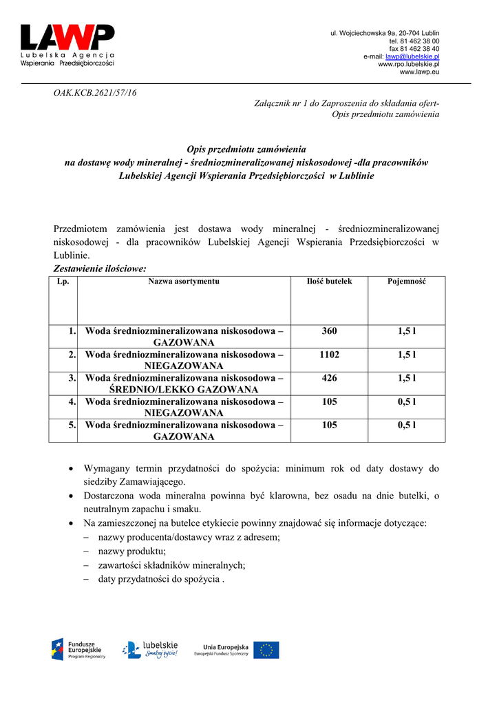 ul. Wojciechowska 9a, 20-704 Lublin tel. 81 462 38 00 fax 81 462 38 40 e-mail: [email protected] www.rpo.lubelskie.pl www.lawp.eu OAK.KCB.2621/57/16 Załącznik nr 1 do Zaproszenia do składania ofertOpis przedmiotu zamówienia Opis przedmiotu zamówienia na dostawę wody mineralnej - średniozmineralizowanej niskosodowej -dla pracowników Lubelskiej Agencji Wspierania Przedsiębiorczości w Lublinie Przedmiotem zamówienia jest dostawa wody mineralnej - średniozmineralizowanej niskosodowej - dla pracowników Lubelskiej Agencji Wspierania Przedsiębiorczości w Lublinie. Zestawienie ilościowe: Lp. Nazwa asortymentu 1. Woda średniozmineralizowana niskosodowa – GAZOWANA 2. Woda średniozmineralizowana niskosodowa – NIEGAZOWANA 3. Woda średniozmineralizowana niskosodowa – ŚREDNIO/LEKKO GAZOWANA 4. Woda średniozmineralizowana niskosodowa – NIEGAZOWANA 5. Woda średniozmineralizowana niskosodowa – GAZOWANA Ilość butelek Pojemność 360 1,5 l 1102 1,5 l 426 1,5 l 105 0,5 l 105 0,5 l Wymagany termin przydatności do spożycia: minimum rok od daty dostawy do siedziby Zamawiającego. Dostarczona woda mineralna powinna być klarowna, bez osadu na dnie butelki, o neutralnym zapachu i smaku. Na zamieszczonej na butelce etykiecie powinny znajdować się informacje dotyczące: nazwy producenta/dostawcy wraz z adresem; nazwy produktu; zawartości składników mineralnych; daty przydatności do spożycia . ul. Wojciechowska 9a, 20-704 Lublin tel. 81 462 38 00 fax 81 462 38 40 e-mail: [email protected] www.rpo.lubelskie.pl www.lawp.eu Dostawa przedmiotu zamówienia do siedziby Zamawiającego - ul. Wojciechowska 9a 20-704 Lublin - połączona jest z jego wniesieniem bez udziału Zamawiającego. Powyższe czynności Wykonawca powinien wykonać w ramach własnych zasobów ludzkich i sprzętowych z uwzględnieniem konieczności dostawy w godzinach pracy Zamawiającego (7:30-15:30). Zamawiający dopuszcza dostawy realizowane za pomocą firm spedycyjnych itp. ale wymagane jest wniesienie wody do wskazanych miejsc (pomieszczeń) przez Zamawiającego, bez udziału Zamawiającego. Dostawa zostanie zrealizowana do siedziby Zamawiającego w terminie 10 dni od złożenia zamówienia przez Zamawiającego. Termin płatności ustala się na 14 po zrealizowaniu zamówienia i przedłożeniu Zamawiającemu prawidłowo wystawionej faktury/faktury VAT. Faktura VAT zostanie wystawiona na następujące dane: Lubelska Agencja Wspierania Przedsiębiorczości w Lublinie Ul. Wojciechowska 9a 20-704 Lublin NIP: 712 307 78 83
