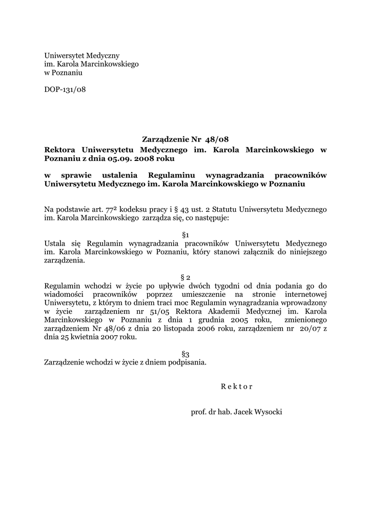 Uniwersytet Medyczny im. Karola Marcinkowskiego w Poznaniu DOP-131/08 Zarządzenie Nr 48/08 Rektora Uniwersytetu Medycznego im. Karola Marcinkowskiego w Poznaniu z dnia 05.09. 2008 roku w sprawie ustalenia Regulaminu wynagradzania pracowników Uniwersytetu Medycznego im. Karola Marcinkowskiego w Poznaniu Na podstawie art. 77² kodeksu pracy i § 43 ust. 2 Statutu Uniwersytetu Medycznego im. Karola Marcinkowskiego zarządza się, co następuje: §1 Ustala się Regulamin wynagradzania pracowników Uniwersytetu Medycznego im. Karola Marcinkowskiego w Poznaniu, który stanowi załącznik do niniejszego zarządzenia. §2 Regulamin wchodzi w życie po upływie dwóch tygodni od dnia podania go do wiadomości pracowników poprzez umieszczenie na stronie internetowej Uniwersytetu, z którym to dniem traci moc Regulamin wynagradzania wprowadzony w życie zarządzeniem nr 51/05 Rektora Akademii Medycznej im. Karola Marcinkowskiego w Poznaniu z dnia 1 grudnia 2005 roku, zmienionego zarządzeniem Nr 48/06 z dnia 20 listopada 2006 roku, zarządzeniem nr 20/07 z dnia 25 kwietnia 2007 roku. §3 Zarządzenie wchodzi w życie z dniem podpisania. Rektor prof. dr hab. Jacek Wysocki REGULAMIN WYNAGRADZANIA pracowników Uniwersytetu Medycznego im. Karola Marcinkowskiego w Poznaniu §1 Postanowienia regulaminu znajdują zastosowanie do wszystkich pracowników Uniwersytetu Medycznego im. Karola Marcinkowskiego w Poznaniu. §2 Ustala się: 1/tabelę stanowisk, kategorii zaszeregowania i wymagań kwalifikacyjnych pracowników naukowo-technicznych, administracyjnych, obsługi i zatrudnionych na stanowiskach robotniczych, stanowiącą załącznik nr 1 do niniejszego regulaminu, 2/ tabelę stanowisk, kategorii zaszeregowania i wymagań kwalifikacyjnych pracowników bibliotecznych oraz pracowników dokumentacji i informacji naukowej, stanowiącą załącznik nr 2 do niniejszego regulaminu, 3/ tabelę stanowisk, kategorii zaszeregowania i wymagań kwalifikacyjnych pracowników działalności wydawniczej i poligraficznej, stanowiącą załącznik nr 3 do niniejszego regulaminu, 4/ regulamin premiowania pracowników nie będących nauczycielami akademickimi, stanowiący załącznik nr 4 do niniejszego regulaminu. §3 Wysokość miesięcznych stawek wynagrodzenia zasadniczego oraz dodatku funkcyjnego regulują powszechnie obowiązujące przepisy. §4 1. Pracownikowi będącemu nauczycielem akademickim, odpowiednio do rodzaju pracy i kwalifikacji wymaganych przy jej wykonywaniu, a także ilości i jakości świadczonej pracy przysługują następujące składniki wynagradzania i dodatki do płac: 1)wynagrodzenie zasadnicze, 2)dodatek funkcyjny, 3)dodatek za staż pracy , 4)dodatkowe wynagrodzenie za: a) pracę w godzinach ponadwymiarowych, b) udział w pracach związanych z postępowaniem rekrutacyjnym, c)kierowanie i sprawowanie opieki nad studenckimi praktykami zawodowymi, d)promotorstwo i recenzowanie rozpraw doktorskich i habilitacyjnych oraz oceny dorobku naukowego związane z przewodami habilitacyjnymi, opracowywanie ocen całokształtu dorobku naukowo-badawczego lub dydaktyczno- wychowawczego kandydatów do tytułu naukowego, 5)dodatkowe wynagrodzenie roczne. 2.Pracownikowi nie będącemu nauczycielem akademickim, odpowiednio do rodzaju pracy i kwalifikacji wymaganych przy jej wykonywaniu, a także ilości i jakości świadczonej pracy przysługują następujące składniki wynagradzania i dodatki do płac: 1)wynagrodzenie zasadnicze, 2)dodatek funkcyjny, 3)dodatek za staż pracy , 4)dodatki za pracę: a) w godzinach nadliczbowych, w niedziele i święta oraz dni wolne od pracy wynikające z 5-cio dniowego tygodnia pracy, b) w porze nocnej, c) na drugiej zmianie, 5)premia regulaminowa, 6)dodatkowe wynagrodzenie roczne. 3.Pracownikowi może być przyznana nagroda pieniężna. 4.Pracownikowi przysługują następujące świadczenia związane z pracą: 1) nagrody jubileuszowe, 2)diety i inne należności z tytułu podróży służbowej, 3)wynagrodzenie za czas niezdolności do pracy wskutek choroby, 4)jednorazowe odprawy pieniężne z tytułu przejścia na emeryturę lub rentę, 5)odprawa pośmiertna dla członków rodziny zmarłego pracownika. §5 1.Pracownikowi będącemu nauczycielem akademickim za wykonaną pracę przysługuje wynagrodzenie zasadnicze według miesięcznych stawek wynagradzania oraz przewidziane w regulaminie inne składniki wynagrodzenia, zgodnie z zajmowanym stanowiskiem. 2.Pracownikowi nie będącemu nauczycielem akademickim za wykonaną pracę przysługuje wynagrodzenie zasadnicze, wynikające z przyznanej kategorii zaszeregowania i stawki wynagrodzenia oraz przewidziane w regulaminie inne składniki wynagrodzenia, zgodnie z zajmowanym stanowiskiem. 3.Wynagrodzenie brutto pracownika za pełen miesięczny wymiar czasu pracy nie może być niższe od wynagrodzenia minimalnego, którego wysokość określają odrębne, powszechnie obowiązujące, przepisy. 4.Pracownikowi zatrudnionemu w niepełnym wymiarze czasu pracy przysługuje wynagrodzenie w wysokości proporcjonalnej do wymiaru czasu pracy wynikającego ze stosunku pracy. §6 1.Decyzje w sprawie ustalenia wysokości wynagrodzenia zasadniczego, dodatku funkcyjnego i innych składników wynagrodzenia nauczyciela akademickiego, uwzględniając kwalifikacje, indywidualną ocenę pracownika oraz jego osiągnięcia i staż pracy, podejmuje Rektor, uwzględniając zasady obowiązujące w Uczelni. 2.Zaszeregowania pracownika nie będącego nauczycielem akademickim do określonej kategorii dokonuje Kanclerz Uczelni po zasięgnięciu opinii bezpośredniego przełożonego pracownika na podstawie zakładowego taryfikatora kwalifikacyjnego. 3.Kategoria zaszeregowania pracownika powinna odpowiadać wykonywanym przez niego czynnościom , określonym w zakresie obowiązków wynikającym z zajmowanego stanowiska. 4.Ustalenia stawki osobistego zaszeregowania dokonuje się z uwzględnieniem indywidualnej oceny pracownika oraz jego kwalifikacji, a także ogól