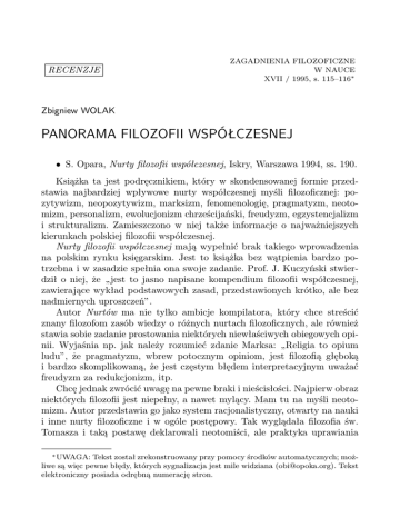 RECENZJE ZAGADNIENIA FILOZOFICZNE W NAUCE XVII / 1995, s. 115–116∗ Zbigniew WOLAK PANORAMA FILOZOFII WSPÓŁCZESNEJ • S. Opara, Nurty filozofii współczesnej, Iskry, Warszawa 1994, ss. 190. Książka ta jest podręcznikiem, który w skondensowanej formie przedstawia najbardziej wpływowe nurty współczesnej myśli filozoficznej: pozytywizm, neopozytywizm, marksizm, fenomenologię, pragmatyzm, neotomizm, personalizm, ewolucjonizm chrześcijański, freudyzm, egzystencjalizm i strukturalizm. Zamieszczono w niej także informacje o najważniejszych kierunkach polskiej filozofii współczesnej. Nurty filozofii współczesnej mają wypełnić brak takiego wprowadzenia na polskim rynku księgarskim. Jest to książka bez wątpienia bardzo potrzebna i w zasadzie spełnia ona swoje zadanie. Prof. J. Kuczyński stwierdził o niej, że „ jest to jasno napisane kompendium filozofii współczesnej, zawierające wykład podstawowych zasad, przedstawionych krótko, ale bez nadmiernych uproszczeń”. Autor Nurtów ma nie tylko ambicje kompilatora, który chce streścić znany filozofom zasób wiedzy o różnych nurtach filozoficznych, ale również stawia sobie zadanie prostowania niektórych niewłaściwych obiegowych opinii. Wyjaśnia np. jak należy rozumieć zdanie Marksa: „Religia to opium ludu”, że pragmatyzm, wbrew potocznym opiniom, jest filozofią głęboką i bardzo skomplikowaną, że jest częstym błędem interpretacyjnym uważać freudyzm za redukcjonizm, itp. Chcę jednak zwrócić uwagę na pewne braki i nieścisłości. Najpierw obraz niektórych filozofii jest niepełny, a nawet mylący. Mam tu na myśli neotomizm. Autor przedstawia go jako system racjonalistyczny, otwarty na nauki i inne nurty filozoficzne i w ogóle postępowy. Tak wyglądała filozofia św. Tomasza i taką postawę deklarowali neotomiści, ale praktyka uprawiania ∗ UWAGA: Tekst został zrekonstruowany przy pomocy środków automatycznych; możliwe są więc pewne błędy, których sygnalizacja jest mile widziana ([email protected]). Tekst elektroniczny posiada odrębną numerację stron. 2 Zbigniew WOLAK filozofii przez neotomistów często przeczyła tym deklaracjom. Widać to wyraźnie w postawie neotomistów wobec współczesnej nauki i filozofii nauki. Zresztą S. Opara sam zwrócił uwagę na niewłaściwy stosunek J. Maritaina do darwinizmu i freudyzmu (jako teorii naukowych, autor odróżnia od nich filozofie powstałe na gruncie tych teorii) i na słabość jego krytyki. Podejście Maritaina do nauk przyrodniczych nie jest dla neotomistów wyjątkowe, ale raczej typowe. Autor Nurtów myli się, kiedy stwierdza, że w Kościele nadal istnieją indeksy zakazanych ksiąg i teorii naukowych. Niesłusznie też przypisuje on filozofom chrześcijańskim powszechne przekonanie o tym, że Bóg kryje się w rejonach jeszcze nie poznanych przez nauki. Nie jest też rozsądne argumentowanie za tą opinią przy pomocy relacji S. W. Hawkinga z konferencji na Watykanie. Ten genialny fizyk na pewno nie jest autorytetem w sprawach filozofii Boga, a tym bardziej w sprawach wiary i nauki Kościoła. W celu poznania współczesnej filozofii Boga uprawianej przez uczonych katolickich należało raczej zajrzeć do sprawozdań ze spotkań Jana Pawła II z uczonymi w Castel Gandolfo, gdzie Bóg filozofów i uczonych katolickich na pewno nie jawił się jako „Bóg do zatykania dziur” w naszej wiedzy. Ostatnia uwaga dotyczy prezentacji tzw. ewolucjonizmu chrześcijańskiego Teilharda de Chardin. Ten uczony został ukazany jako jeden z najwierniejszych kontynuatorów myśli św. Tomasza. Istotnie zamiłowanie do filozofii, teologii i nauk przyrodniczych (nie wyróżnionych jeszcze w czasach Tomasza) można uznać za wspólne cechy obu myślicieli, ale ta wspólnota zainteresowań nie wystarczy do tego, aby zaliczać ich do tej samej kategorii. Różnica między tymi myślicielami jest, zdaniem wielu, zasadnicza i nie można jej pomijać. Różnica ta dotyczy metody uprawiania filozofii. Św. Tomasz wyraźnie oddzielił filozofię od teologii i od nauk szczegółowych, uważał, że każda z tych dziedzin poznania ma swój własny przedmiot i specyficzne sposoby poznania, nie wolno ich ze sobą mieszać. Ta dbałość o poszanowanie różnicy między różnymi rodzajami nauk jest zupełnie obca Teilhardowi. Dlatego wielu filozofów uważa, że jego dzieło nie może być zaliczane do nurtu filozofii racjonalistycznych, w którym mieści się myśl św. Tomasza, ale raczej jest przykładem filozofii irracjonalistycznej, zbliżonej bardziej do subiektywnej wizji poetyckiej niż do rzetelnie uzasadnianej koncepcji filozoficznej. Na tym kończę swoje uwagi. Ich celem nie było obniżenie wartości prezentowanej książki, może ona być dla wielu pożyteczną lekturą, wprowadzającą w zagadnienia filozofii współczesnej i zachęcająca do jej zgłębiania. PANORAMA FILOZOFII WSPÓŁCZESNEJ 3 Nie należy jednak zapominać, że każde ujęcie poglądów filozoficznych jest jednocześnie ich interpretacją. Nurty filozofii współczesnej mogą być jedną z wielu książek, które pozwolą czytelnikowi wyrobić sobie własny pogląd na filozoficzne poglądy innych i pomogą tworzyć własną filozofię. Zbigniew Wolak