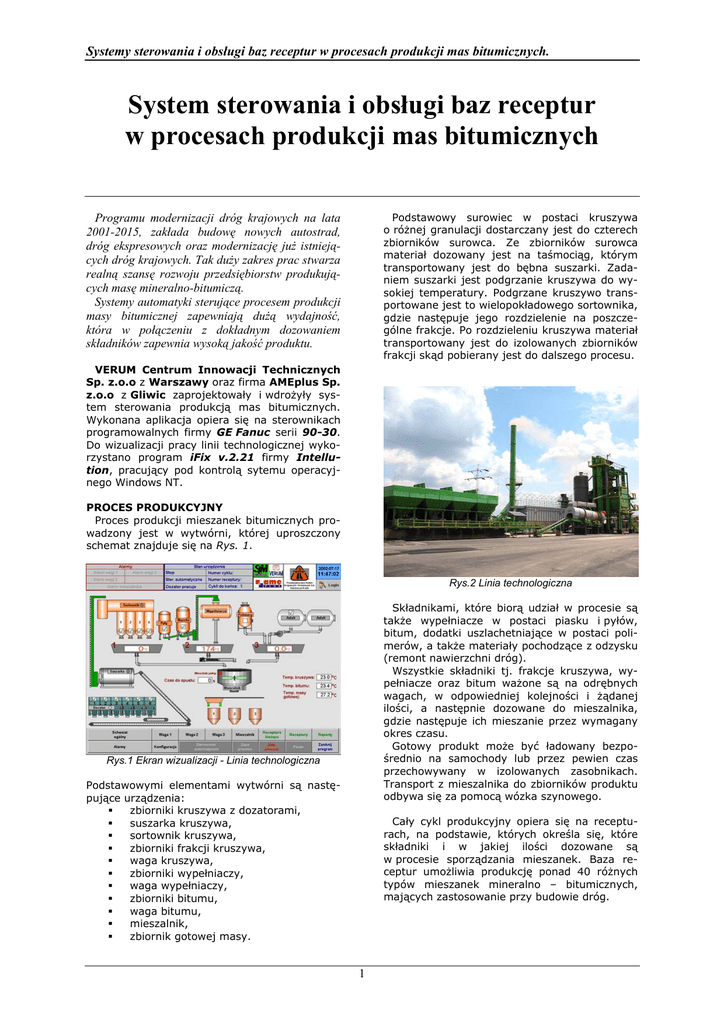 Systemy sterowania i obsługi baz receptur w procesach produkcji mas bitumicznych. System sterowania i obsługi baz receptur w procesach produkcji mas bitumicznych Podstawowy surowiec w postaci kruszywa o różnej granulacji dostarczany jest do czterech zbiorników surowca. Ze zbiorników surowca materiał dozowany jest na taśmociąg, którym transportowany jest do bębna suszarki. Zadaniem suszarki jest podgrzanie kruszywa do wysokiej temperatury. Podgrzane kruszywo transportowane jest to wielopokładowego sortownika, gdzie następuje jego rozdzielenie na poszczególne frakcje. Po rozdzieleniu kruszywa materiał transportowany jest do izolowanych zbiorników frakcji skąd pobierany jest do dalszego procesu. Programu modernizacji dróg krajowych na lata 2001-2015, zakłada budowę nowych autostrad, dróg ekspresowych oraz modernizację już istniejących dróg krajowych. Tak duży zakres prac stwarza realną szansę rozwoju przedsiębiorstw produkujących masę mineralno-bitumiczą. Systemy automatyki sterujące procesem produkcji masy bitumicznej zapewniają dużą wydajność, która w połączeniu z dokładnym dozowaniem składników zapewnia wysoką jakość produktu. VERUM Centrum Innowacji Technicznych Sp. z.o.o z Warszawy oraz firma AMEplus Sp. z.o.o z Gliwic zaprojektowały i wdrożyły system sterowania produkcją mas bitumicznych. Wykonana aplikacja opiera się na sterownikach programowalnych firmy GE Fanuc serii 90-30. Do wizualizacji pracy linii technologicznej wykorzystano program iFix v.2.21 firmy Intellution, pracujący pod kontrolą sytemu operacyjnego Windows NT. PROCES PRODUKCYJNY Proces produkcji mieszanek bitumicznych prowadzony jest w wytwórni, której uproszczony schemat znajduje się na Rys. 1. Rys.2 Linia technologiczna Składnikami, które biorą udział w procesie są także wypełniacze w postaci piasku i pyłów, bitum, dodatki uszlachetniające w postaci polimerów, a także materiały pochodzące z odzysku (remont nawierzchni dróg). Wszystkie składniki tj. frakcje kruszywa, wypełniacze oraz bitum ważone są na odrębnych wagach, w odpowiedniej kolejności i żądanej ilości, a następnie dozowane do mieszalnika, gdzie następuje ich mieszanie przez wymagany okres czasu. Gotowy produkt może być ładowany bezpośrednio na samochody lub przez pewien czas przechowywany w izolowanych zasobnikach. Transport z mieszalnika do zbiorników produktu odbywa się za pomocą wózka szynowego. Rys.1 Ekran wizualizacji - Linia technologiczna Podstawowymi elementami wytwórni są następujące urządzenia: zbiorniki kruszywa z dozatorami, suszarka kruszywa, sortownik kruszywa, zbiorniki frakcji kruszywa, waga kruszywa, zbiorniki wypełniaczy, waga wypełniaczy, zbiorniki bitumu, waga bitumu, mieszalnik, zbiornik gotowej masy. Cały cykl produkcyjny opiera się na recepturach, na podstawie, których określa się, które składniki i w jakiej ilości dozowane są w procesie sporządzania mieszanek. Baza receptur umożliwia produkcję ponad 40 różnych typów mieszanek mineralno – bitumicznych, mających zastosowanie przy budowie dróg. 1 Systemy sterowania i obsługi baz receptur w procesach produkcji mas bitumicznych. WARSTWA STEROWNIKOWA Do podstawowych zadań systemu w warstwie oprogramowania sterownikowego należą: obsługa modułów wejściowowyjściowych analogowych i cyfrowych, realizacja zadań sterowania sekwencyjnego, realizacja pętli regulacji poziomów, realizacja bezpośredniego sterowania napędami oraz sterowania ręcznego w poszczególnych pętlach regulacji, sygnalizacja i obsługa stanów alarmowych systemu sterowania i stanów alarmowych technologicznych. Zadania warstwy nadrzędnej zrealizowanej za pomocą pakietu iFIX są następujące: wizualizacja procesu wytwarzania mieszanek mineralno - bitumicznych, przy pomocy animowanej kolorowej grafiki wektorowej, rejestracja, archiwizacja na dysku oraz prezentacja określonych przez użytkownika danych pomiarowych, obsługa alarmów systemowych i technologicznych, ochrona dostępu zarówno funkcjonalna, jak i obiektowa. Powyższe zadania zostały zrealizowane w oparciu o oprogramowanie iFIX, MS Excel i MS Access. Powyższe zadania wykonywane są w sterowniku jak i w warstwie nadrzędnej, w oparciu o modułową strukturę oprogramowania. Do realizacja zadań sterowania wytwórnią mieszanek mineralno – bitumicznych zastosowano sterownik GE Fanuc serii 90-30 w następującej konfiguracji: kaseta podstawowa 10-cio modułowa moduł zasilacza PWR 330 100-240 VAC moduł CPU 350 moduł 16 wejść cyfrowych MDL 645 moduł 16 wyjść cyfrowych MDL 740 moduł komunikacyjny CMM 320-485 Dodatkowo wykorzystano moduły cyfrowych procesorów wagowych MWE-0517 produkcji AB-MICRO umożliwiające realizację sieci wag tensometrycznych. Rys.4 Ekran wizualizacji – raport System sterowania opracowały i dostarczają firmy: ZIW IBDiM VERUM Sp. z o.o, 03-302 Warszawa, ul. Golędzinowska 10 tel. (022) 675 45 18, (022) 811 14 43 fax. (022) 675 61 49 www.verum.com.pl przy współpracy AMEplus Sp. z o.o, 44-100 Gliwice, ul. Wieczorka 33 tel. (032) 231 85 30 tel./fax (032) 231 82 92 www.ameplus.pl Rys.3 Ekran wizualizacji – waga wypełniaczy WARSTWA MONITOROWANIA I STEROWANIA NADRZĘDNEGO Do realizacji systemu nadrzędnego procesu produkcji mieszanek mineralno – bitumicznych wykorzystano pakiet iFIX. Program jest w pełni 32 - bitowy, wykorzystuje wiele możliwości systemu operacyjnego Windows NT, takich jak wielozadaniowość, wielowątkowość, niezawodność i bezpieczeństwo danych. Przykładowe ekrany wykorzystane w artykule pochodzą z systemu sterowania i monitorowania wykonanego dla firmy: Przedsiębiorstwo Robót Drogowych i Mostowych S.A. 47-200 Kędzierzyn-Koźle, ul. 24 Kwietnia 4 tel. (077) 482 56 34 2