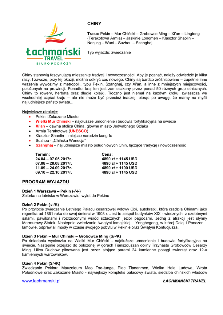 CHINY Trasa: Pekin – Mur Chiński – Grobowce Ming – Xi’an – Lingtong (Terakotowa Armia) – Jaskinie Longmen – Klasztor Shaolin – Nanjing – Wuxi – Suzhou – Szanghaj Typ wyjazdu: zwiedzanie Chiny stanowią fascynującą mieszankę tradycji i nowoczesności. Aby je poznać, należy odwiedzić je kilka razy. I zawsze, przy tej okazji, można odkryć coś nowego. Chiny są bardzo zróżnicowane – zupełnie inne wrażenia wywozimy z metropolii, typu Pekin, Szanghaj, czy Xi'an, a inne z mniejszych miejscowości, położonych na prowincji. Ponadto, kraj ten jest zamieszkany przez ponad 50 różnych grup etnicznych. Chiny to rowery, herbata oraz długie kolejki. Tłoczno jest niemal na każdym kroku, zwłaszcza we wschodniej części kraju – ale nie może być przecież inaczej, biorąc po uwagę, że mamy na myśli najludniejsze państo świata... Największe atrakcje: Pekin i Zakazane Miasto Wielki Mur Chiński – najdłuższe umocnienie i budowla fortyfikacyjna na świecie Xi'an – dawna stolica China, główne miasto Jedwabnego Szlaku Armia Terakotowa (UNESCO) Klasztor Shaolin – miejsce narodzin kung-fu Suzhou - „Chińska Wenecja” Szanghaj – najludniejsze miasto południowych Chin, łączące tradycję i nowoczesność Termin: 24.04 – 07.05.2017r. 07.08 – 20.08.2017r. 11.09 – 24.09.2017r. 09.10 – 22.10.2017r. Cena: 4890 zł + 1145 USD 4890 zł + 1145 USD 4890 zł + 1190 USD 4890 zł + 1145 USD PROGRAM WYJAZDU Dzień 1 Warszawa – Pekin (-/-/-) Zbiórka na lotnisku w Warszawie, wylot do Pekinu Dzień 2 Pekin (-/-/K) Po przylocie zwiedzanie Letniego Pałacu cesarzowej wdowy Cixi, autokratki, która rządziła Chinami jako regentka od 1861 roku do swej śmierci w 1908 r. Jest to zespół budynków XIX - wiecznych, z ozdobnymi salami, pawilonami i rozrzuconymi wśród sztucznych jezior pagodami. Jedną z atrakcji jest słynny Marmurowy Statek. Następnie zwiedzanie świątyni lamajskiej – Yonghegong, w której Dalaj i Panczen – lamowie, odprawiali modły w czasie swojego pobytu w Pekinie oraz Świątyni Konfucjusza. Dzień 3 Pekin – Mur Chiński – Grobowce Ming (S/-/K) Po śniadaniu wycieczka na Wielki Mur Chiński - najdłuższe umocnienie i budowla fortyfikacyjna na świecie. Następnie przejazd do położonej w górach Tianszouszan doliny Trzynastu Grobowców Cesarzy Ming. Ulica Duchów pilnowana jest przez stojące parami 24 kamienne posągi zwierząt oraz 12-u kamiennych wartowników. Dzień 4 Pekin (S/-/K) Zwiedzanie Pekinu: Mauzoleum Mao Tse-tunga, Plac Tiananmen, Wielka Hala Ludowa, Wrota Południowe oraz Zakazane Miasto - największy kompleks pałacowy świata, siedziba chińskich władców www.lachmanski.pl ŁACHMAŃSKI TRAVEL od czasów dynastii Ming. Wejście do zakazanego miasta jeszcze na początku tego wieku karane było śmiercią. Jest to największy z zachowanych zespołów klasycznego chińskiego budownictwa. Stanowią go między innymi Sala Najwyższej Harmonii, niegdyś główna sala tronowa, Pałac Niebiańskiej Czystości, w którym rozpatrywano, w obecności cesarzy, sprawy państwa, pałace żon i konkubin cesarskich. Na terenie kompleksu znajduje się łącznie ponad 900 pomieszczeń. Wieczorem wyjazd nocnym pociągiem do Xi'an (nocleg w pociągu – przedziały 4-os., miejsca sypialne). Dzień 5 Xi 'an (S/-/K) Po przyjeździe śniadanie. Zwiedzanie Xi'an - dawnej stolicy Chin, będącej głównym miastem na słynnym Szlaku Jedwabnym; zobaczymy Pagodę Dzikich Gęsi, mury miejskie, Muzeum Historii Miasta, Wielki Meczet, wokół którego zachował się oryginalny charakter dzielnicy islamskiej, zobaczymy niezwykłe mury obronne, tak szerokie, że mogły po nich jeździć pojazdy konne, Wieżę Dzwonów i Bębna. Dzień 6 Terakotowa Armia (S/-/K) Wycieczka do Lingtong, w którym znajduje się najsłynniejsze obecnie muzeum na terenie Chin - Armii Terakotowej (lista UNESCO), która miała towarzyszyć cesarzowi Qin Shi w życiu pozagrobowym; zwiedzanie grobu Pierwszego Cesarza Chin. Armię stanowi 7500 naturalnej wielkości figur z gliny – żołnierzy, koni i rydwanów, które przez 2000 lat stały na straży grobowca Cesarza. Grobowiec odkopano przypadkowo dopiero w 1974 roku. Budowę tego kompleksu zaczęto w 246 r p.n.e. Przy wznoszeniu grobowca pracowało przymusowo 700 tysięcy robotników. Dzień 7 Jaskinie Longmen (S/-/K) Przejazd do Luoyang. Zwiedzanie Jaskiń Longmen, które od V w. były przekształcane w świątynie buddyjskie, ze wspaniałymi posągami i płaskorzeźbami pochodzącymi z V - XII w. Dzień 8 Klasztor Shaolin (S/-/K) Zwiedzanie Klasztoru Shaolin, będącego miejscem narodzin kung-fu - chińskiej sztuki walki. Klasztor zbudowano w V w. u podnóża góry Songsham, będącej jedną z pięciu świętych gór w Chinach. Wieczorem transfer na dworzec kolejowy, przejazd nocnym pociągiem do Nanjing (nocleg w pociągu – przedziały 4-os., miejsca sypialne). Dzień 9 Nanjing (S/-/K) Po przyjeździe zwiedzanie Nanjing - stolicy prowincji Jiangsu, miasta, którego początki sięgają VIII w. przed naszą erą, malowniczo położonego na prawym brzegu rzeki Jangcy, które dwukrotnie było stolicą Chin w latach 1386 - 1644 oraz na początku XX w.: zabytkowe Mury Miejskie, Mauzoleum Sun Yatsena słynnego polityka chińskiego, most nad Jangcy - duma Chińczyków oraz malowniczy lokalny targ. Dzień 10 Wuxi – Suzhou (S/-/K) Przejazd do Wuxi - centrum produkcji wyrobów z jedwabiu, kaszmiru i bawełny chińskiej, malowniczo położonego nad jeziorem Taihu. Zwiedzimy ogrody oraz park, na terenie którego znajdują się liczne zabytki; przejażdżka łodzią po jeziorze. Przejazd do Suzhou. Dzień 11 Suzhou – Szanghaj (S/-/K) Zwiedzanie Suzhou, miasta założonego w VI w. p.n.e., uznawanego za jedno z najpiękniejszych miast Chin. Położone nad licznymi kanałami, nazywane jest „Chińską Wenecją”. Zwiedzimy Wzgórze Tygrysa, na którym znajduje się ośmiokątna pagoda z „chińską” krzywą wież