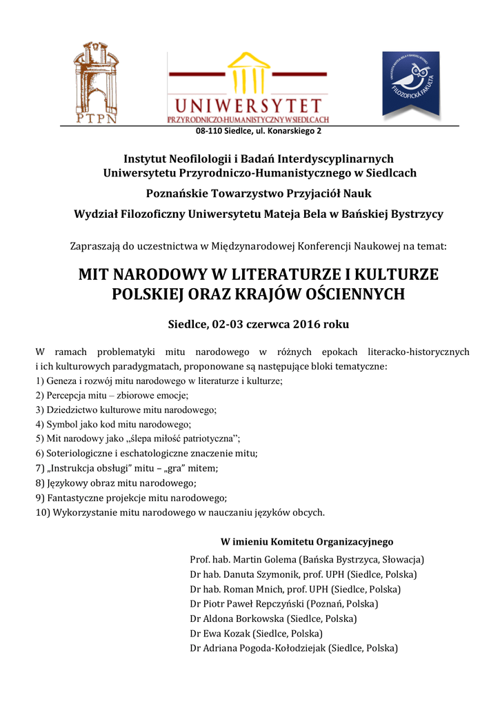 08-110 Siedlce, ul. Konarskiego 2 Instytut Neofilologii i Badań Interdyscyplinarnych Uniwersytetu Przyrodniczo-Humanistycznego w Siedlcach Poznańskie Towarzystwo Przyjaciół Nauk Wydział Filozoficzny Uniwersytetu Mateja Bela w Bańskiej Bystrzycy Zapraszają do uczestnictwa w Międzynarodowej Konferencji Naukowej na temat: MIT NARODOWY W LITERATURZE I KULTURZE POLSKIEJ ORAZ KRAJÓW OŚCIENNYCH Siedlce, 02-03 czerwca 2016 roku W ramach problematyki mitu narodowego w różnych epokach literacko-historycznych i ich kulturowych paradygmatach, proponowane są następujące bloki tematyczne: 1) Geneza i rozwój mitu narodowego w literaturze i kulturze; 2) Percepcja mitu – zbiorowe emocje; 3) Dziedzictwo kulturowe mitu narodowego; 4) Symbol jako kod mitu narodowego; 5) Mit narodowy jako „ślepa miłość patriotyczna”; 6) Soteriologiczne i eschatologiczne znaczenie mitu; 7) „Instrukcja obsługi” mitu – „gra” mitem; 8) Językowy obraz mitu narodowego; 9) Fantastyczne projekcje mitu narodowego; 10) Wykorzystanie mitu narodowego w nauczaniu języków obcych. W imieniu Komitetu Organizacyjnego Prof. hab. Martin Golema (Bańska Bystrzyca, Słowacja) Dr hab. Danuta Szymonik, prof. UPH (Siedlce, Polska) Dr hab. Roman Mnich, prof. UPH (Siedlce, Polska) Dr Piotr Paweł Repczyński (Poznań, Polska) Dr Aldona Borkowska (Siedlce, Polska) Dr Ewa Kozak (Siedlce, Polska) Dr Adriana Pogoda-Kołodziejak (Siedlce, Polska) Zgłoszenie uczestnictwa w Międzynarodowej Konferencji Naukowej na temat: MIT NARODOWY W LITERATURZE I KULTURZE POLSKIEJ ORAZ KRAJÓW OŚCIENNYCH Siedlce, 02-03 czerwca 2016 roku Wersal Siedlecki, 08-110 Siedlce, ul. Łukowska 74 Imię i nazwisko:……………………………..………………………………………..……….….... Tytuł/stopień naukowy: …………………...…………………………………………..…........…… Miejsce pracy (afiliacja): ……………………………………………………………….………...... Tytuł referatu: ………………………………….……………………………………….….……..... Telefon komórkowy: ……………………………………………………..………………..……….. Adres e-mail: ………………………………………………………………………..……...…......... Adres do korespondencji: …………………………………………………………..…….….…....... Abstrakt (do 1000 znaków): ……………………………………………………………….…..…… ……………………………………………………………………………………………..………… ……………………………………………………………………………….…………………..….. Opłata konferencyjna (wyżywienie i publikacja): 350 zł (85 euro – dla osób spoza Polski) Zgłoszenia uczestnictwa prosimy przesyłać do 15 kwietnia 2016 r na adres: [email protected]; [email protected] Z wyrazami szacunku Dr Ewa Kozak Dr Adriana Pogoda-Kołodziejak