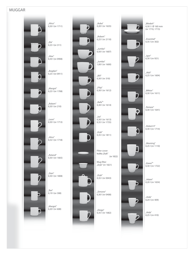 MUGGAR „Alice“ 0,30 l (nr 1711) „Kuba“ 0,20 l (nr 1635) „Robert“ 0,25 l (nr 2110) „Ela“ 0,25 l (nr 311) „Wiedeñ“ 0,30 l / Ø 160 mm (nr 1710, 1715) „Essential“ 0,35 l (nr 302) „Jumbo“ 0,50 l (nr 1607) „Alex“ 0,30 l (nr 0908) „Bogdan“ 0,25 l (nr 0911) „Margot“ 0,25 l (nr 1708) „Robert“ 0,30 l (nr 210) „Leon“ 0,30 l (nr 1713) „Igor“ 0,30 l (nr 921) „Jumbo“ 1,00 l (nr 1600) „Bill“ 0,30 l (nr 310) „Filip“ 0,30 l (nr 1612) „Rafa³“ 0,30 l (nr 1614) „Abil“ 0,25 l (nr 1604) „Wiktor“ 0,30 l (nr 1611) „Tomasz“ 0,30 l (nr 1641) „Iza“ 0,30 l (nr 1613) 0,35 l (nr 1735) „Robert II“ 0,30 l (nr 1714) „Alice“ 0,32 l (nr 1718) „Eryk“ 0,35 l (nr 1811) „Morning“ 0,25 l (nr 1110) „Roland“ 0,30 l (nr 1665) Filter cover kubka „Eryk“ (nr 1822) Mug filter „Eryk“ (nr 1821) „Stan“ 0,30 l (nr 1808) „Ton“ 0,19 l (nr 308) „Margot“ 0,20 l (nr 608) „Eryk“ 0,35 l (nr 0043) „Simone“ 0,30 l (nr 0408) „Diego“ 0,35 l (nr 1682) „Gawe³“ 0,30 l (nr 1722) „Adam“ 0,20 l (nr 1654) „Aida“ 0,24 l (nr 409) „Aida“ 0,25 l (nr 410)